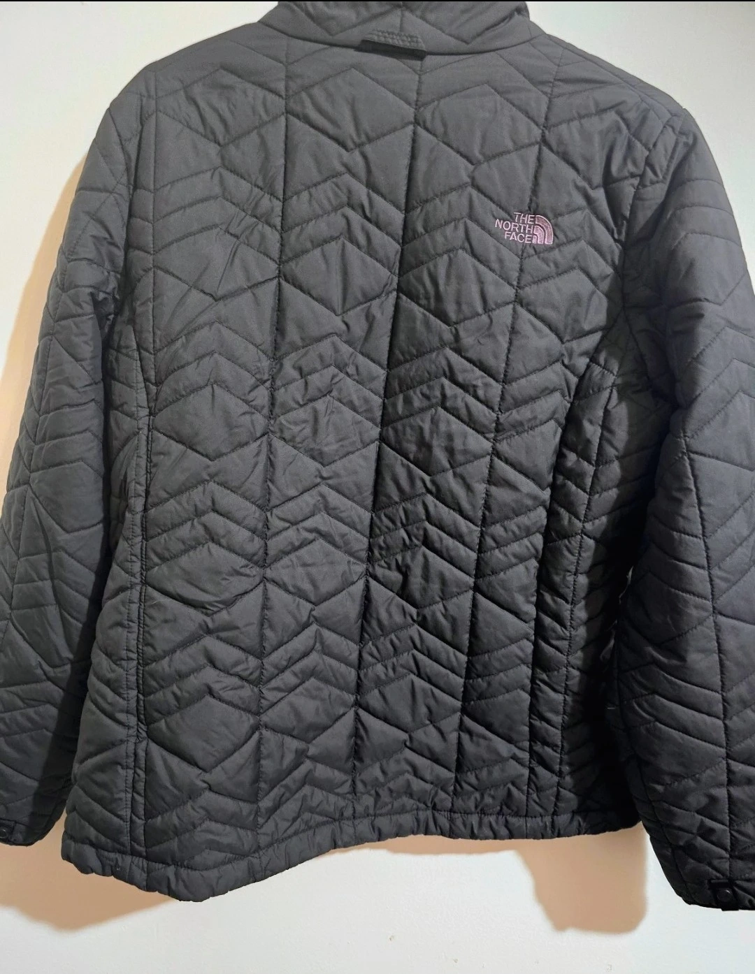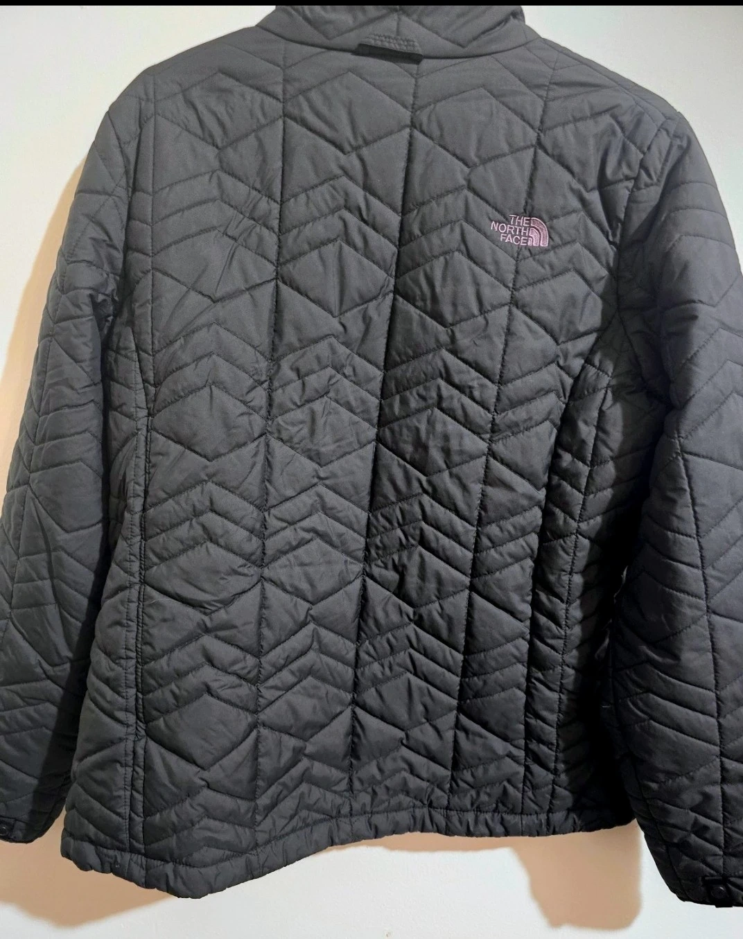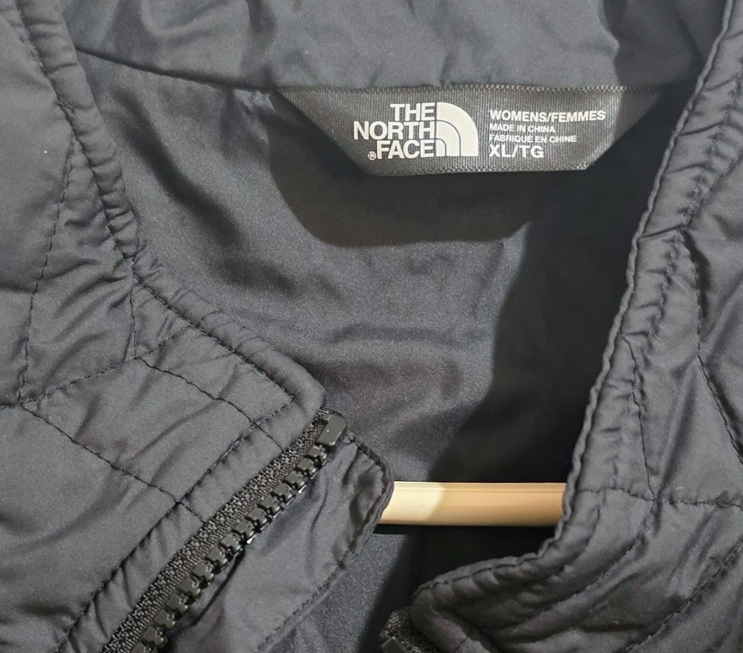 Selling a stylish black quilted jacket from The North Face. It's perfect for layering and staying warm on chilly days. The jacket features a full zip and the iconic North Face logo. Great for everyday wear!