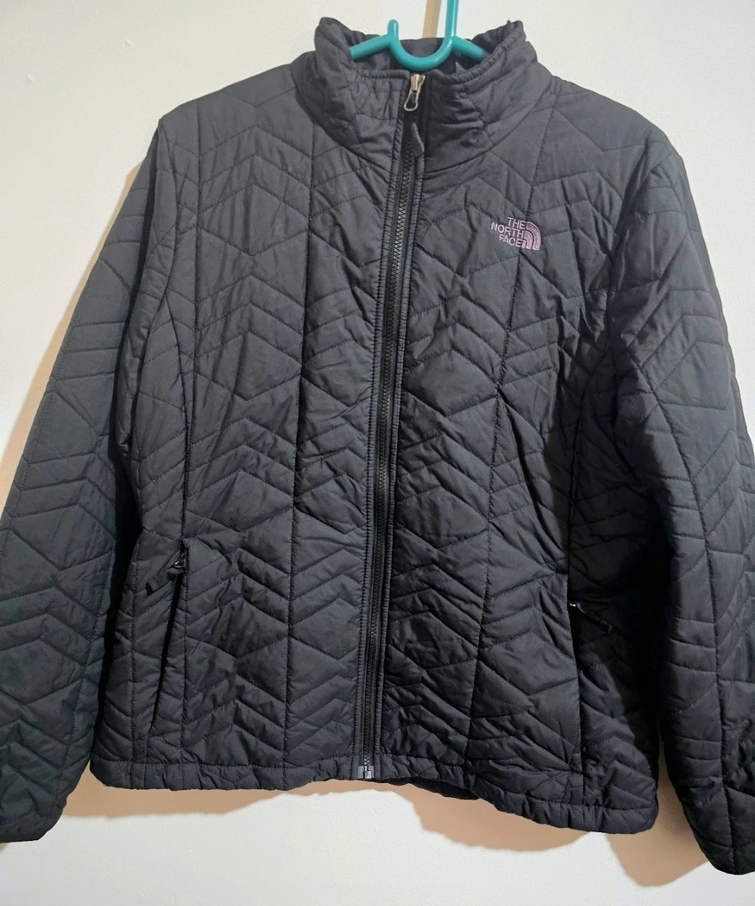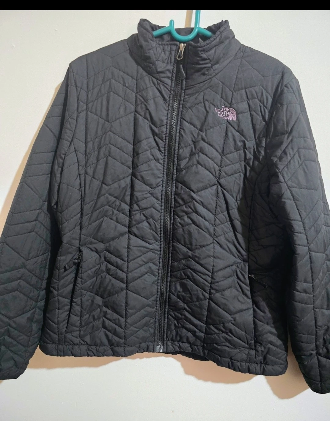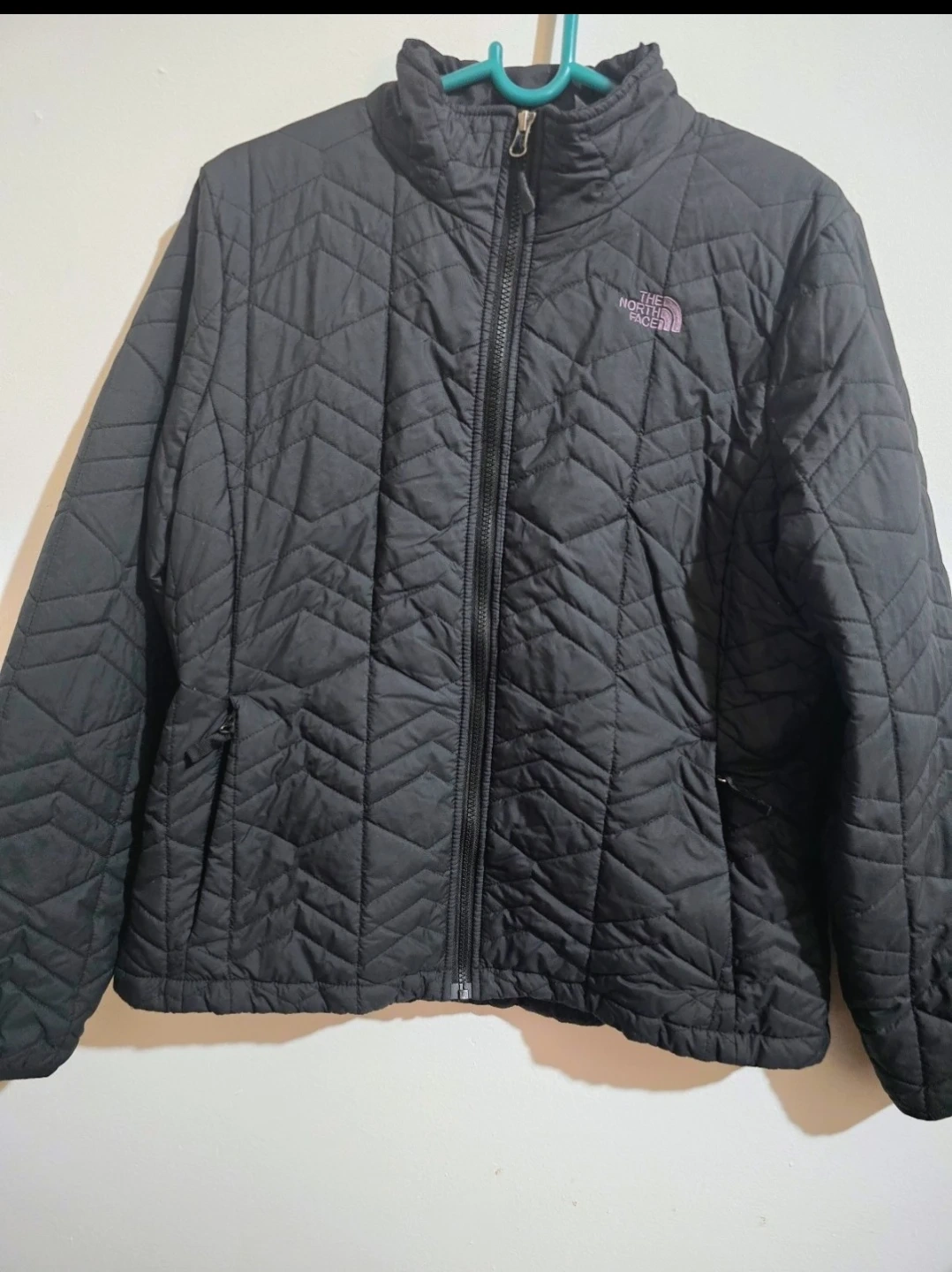 Selling a stylish black quilted jacket from The North Face. It's perfect for layering and staying warm on chilly days. The jacket features a full zip and the iconic North Face logo. Great for everyday wear!
