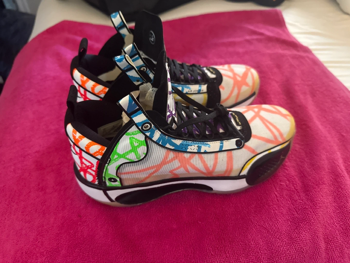 These Air Jordan XXXIV basketball shoes feature a colorful, artistic design. They are lace-up high-top sneakers. Perfect for hitting the court or for casual wear!
