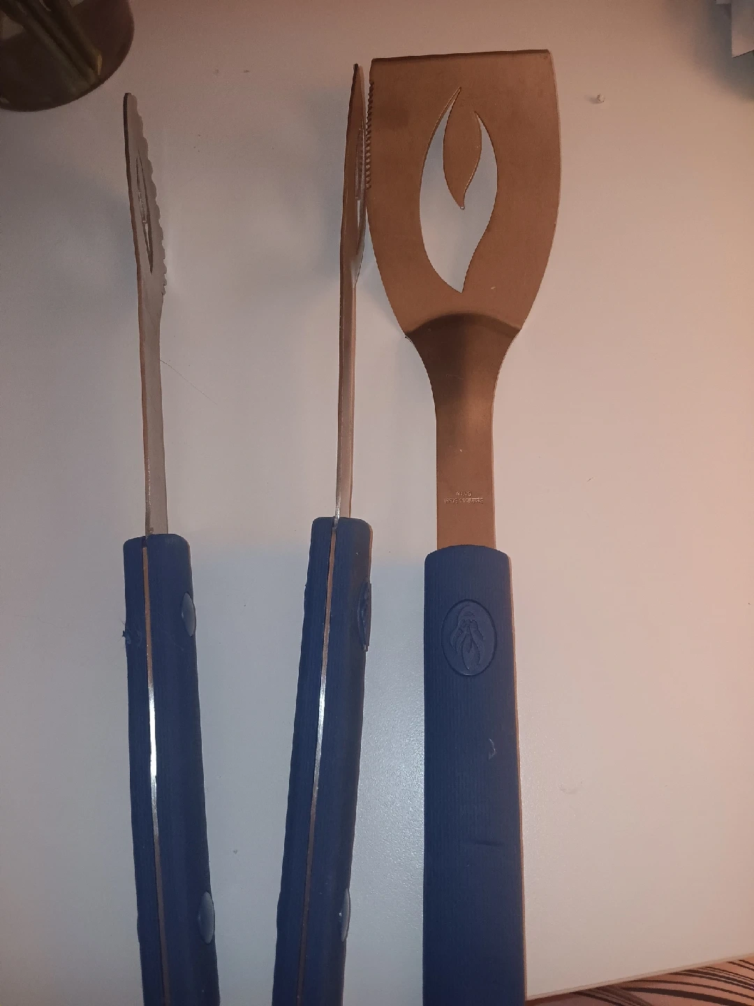 775Selling a BBQ grill utensil set! Perfect for your next cookout. It includes a spatula, tongs, and a fork. These are stainless steel with blue handles.