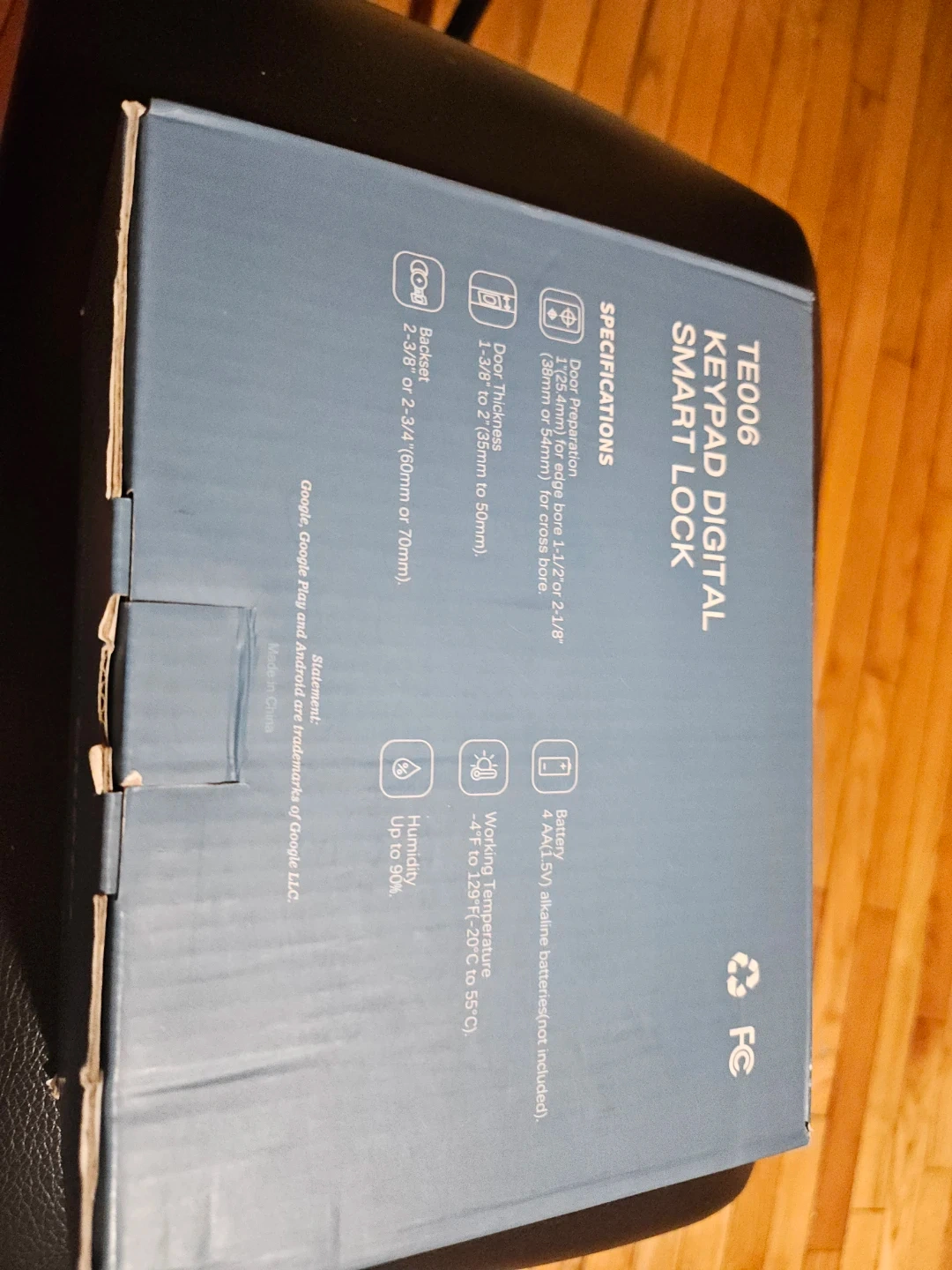 This is a TECHO TE006 Keypad Digital Smart Lock. It supports app unlock, remote sharing, auto lock, and private mode. Door preparedness requires 2-3/8" or 2-3/4" backset and 1-1/4" to 2" (35mm or 50mm) for cross bore.