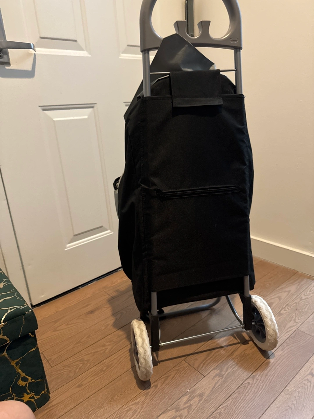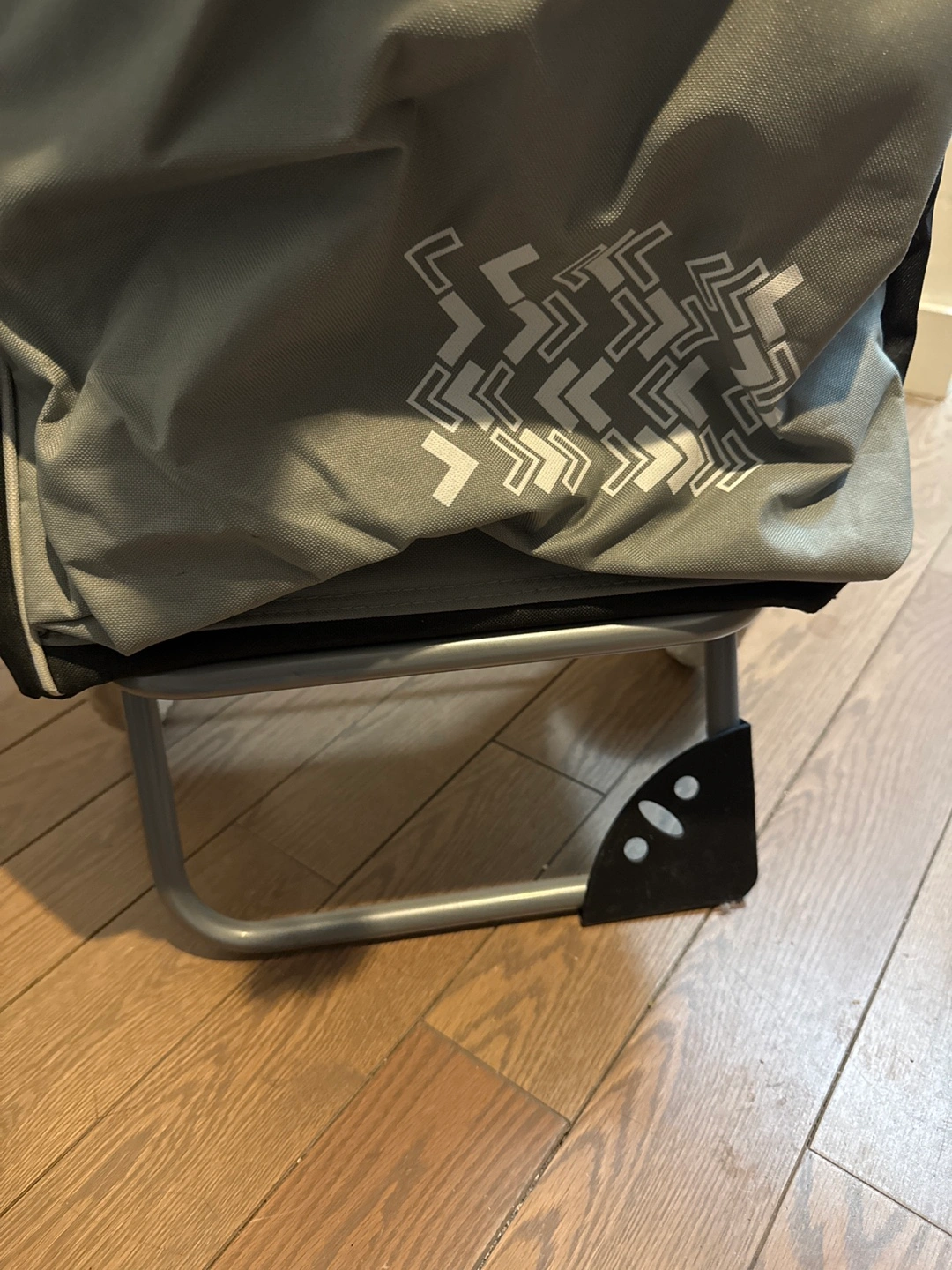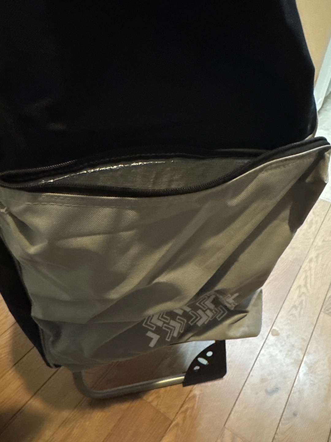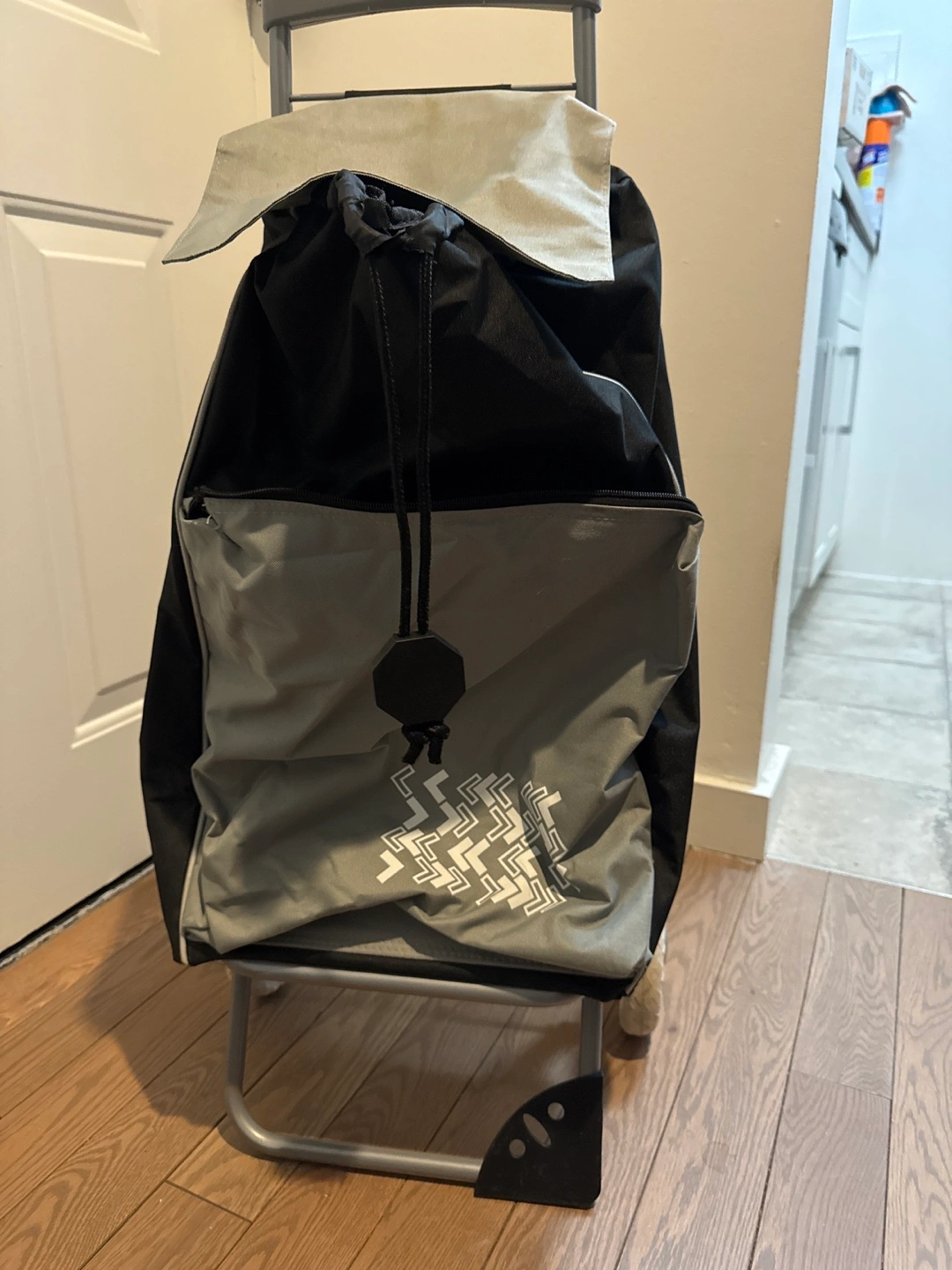 Giving away since front zipper is missing zipper pull. Otherwise in excellent condition just a little dusty. Portable shopping cart, grey and black fabric, metal frame, folds flat for storage. Features a zippered insulated compartment. Wheels for easy transport.