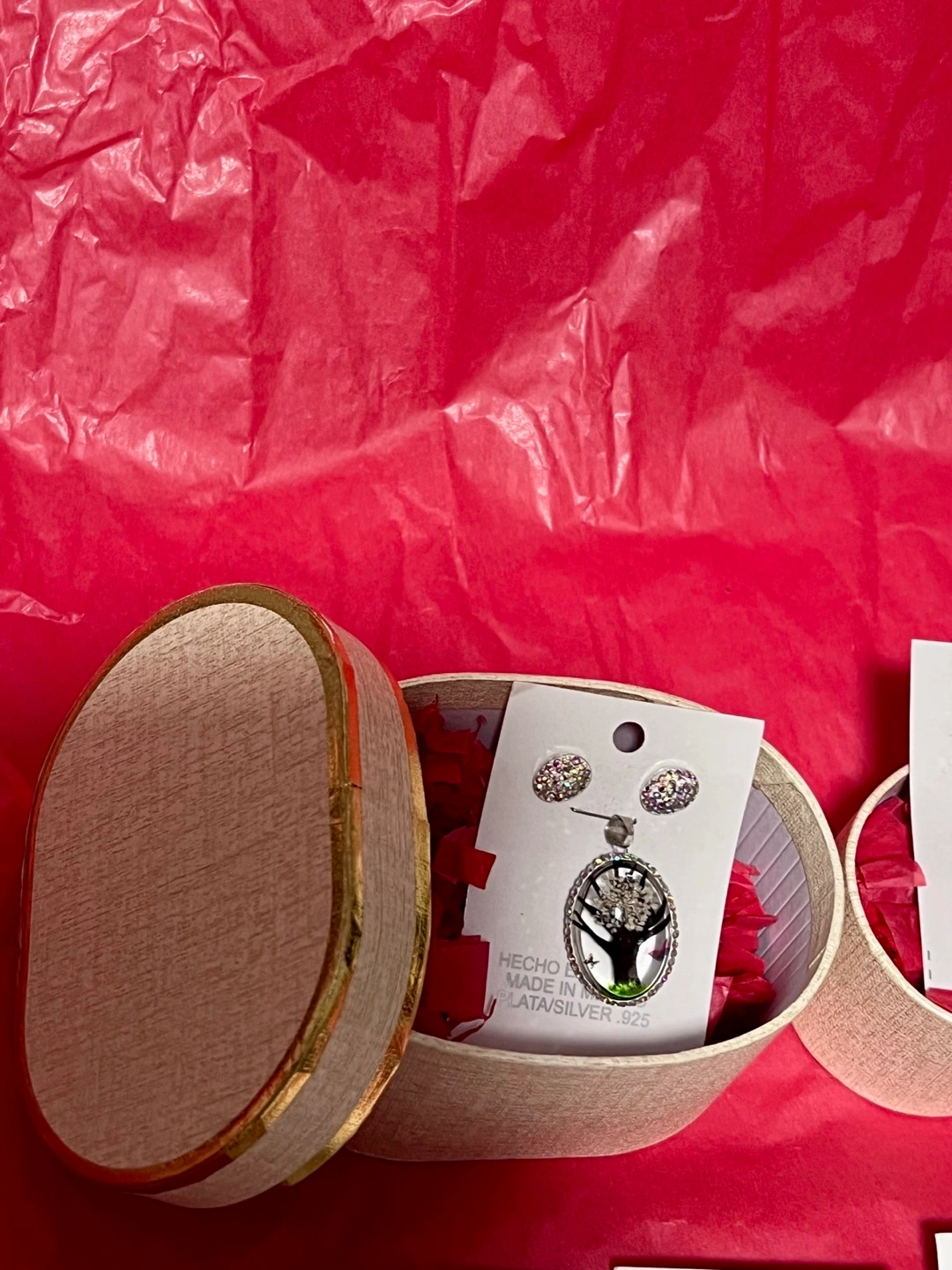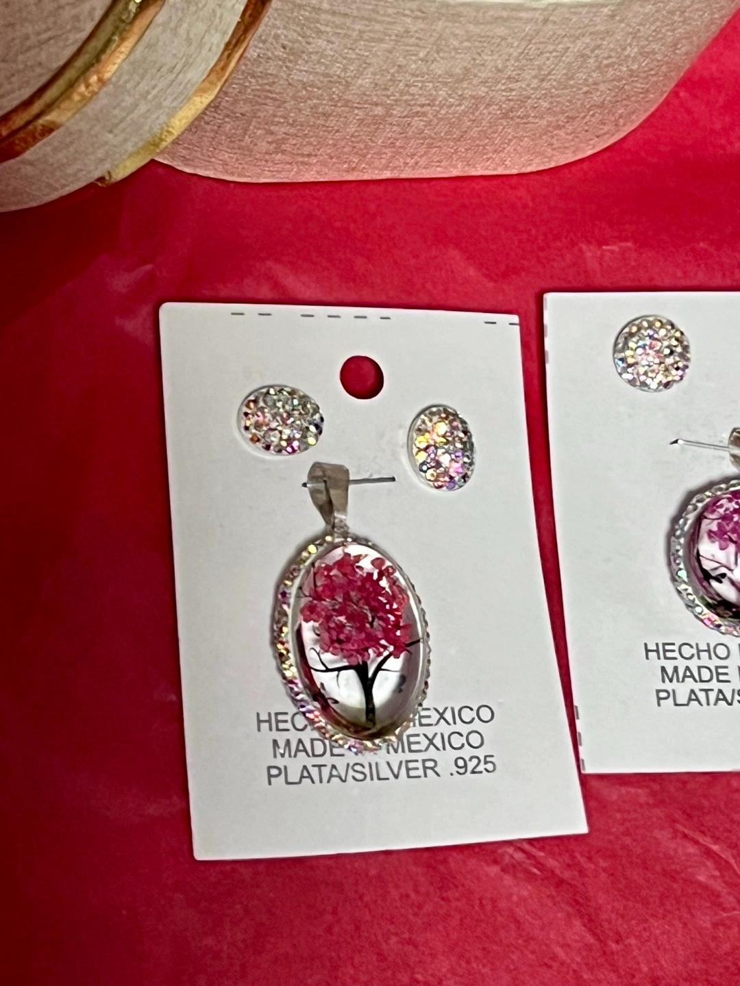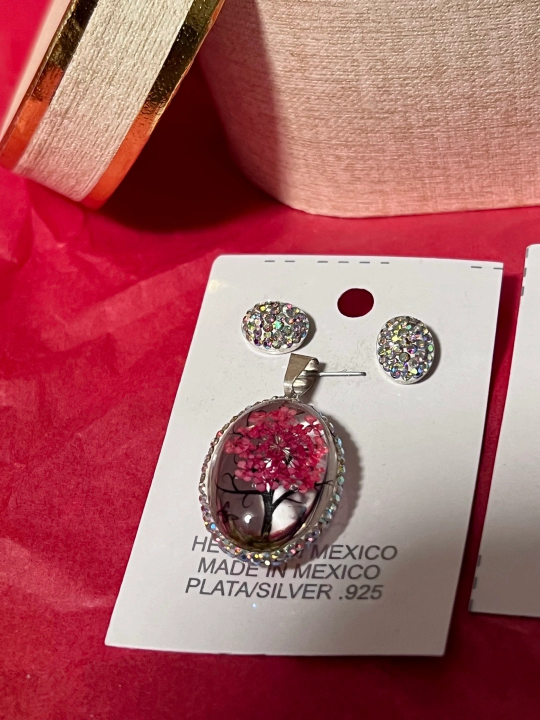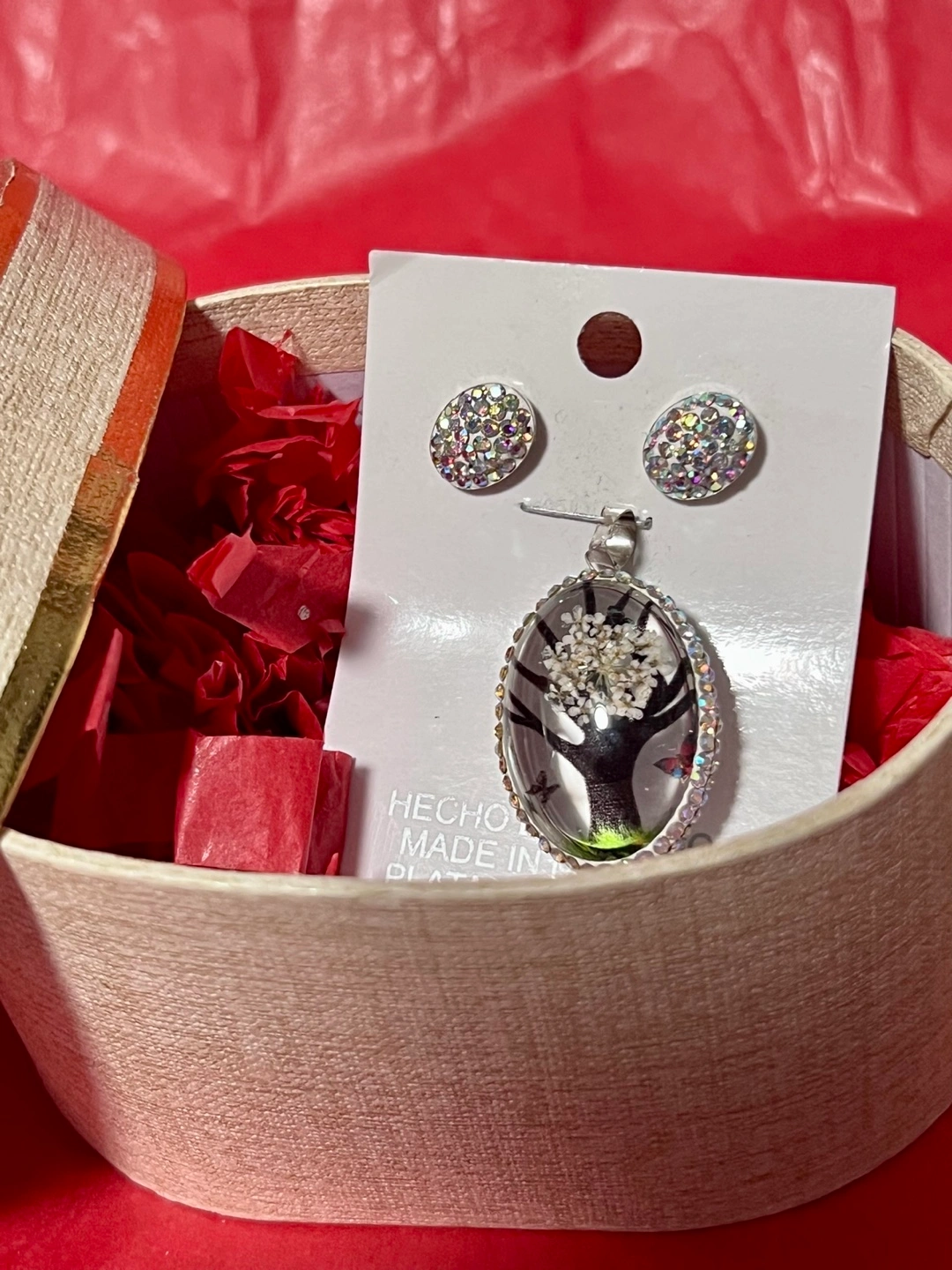 Here's a beautiful pendant and earring set! The pendant features a delicate tree design encased in resin and surrounded by sparkling stones. The earrings are matching studs, also adorned with stones.