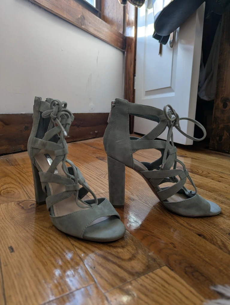 81These BCBGeneration heels are a stylish sage green color and a size 6M. They feature a lace-up design and a sturdy block heel. Perfect for dressing up any outfit!