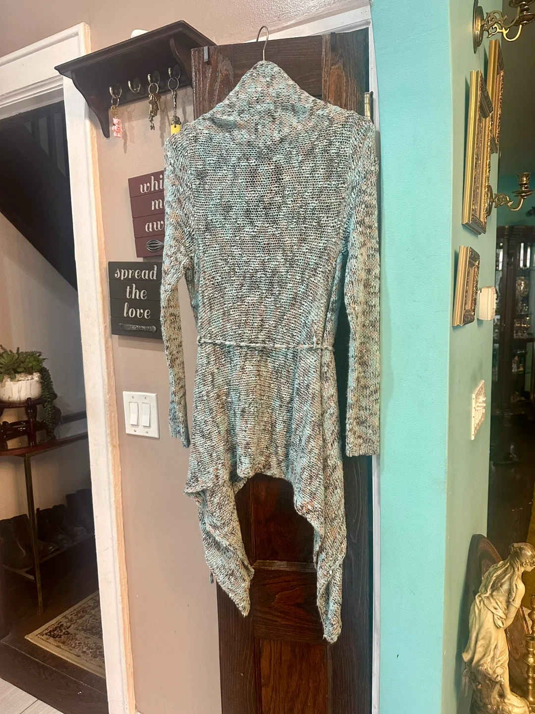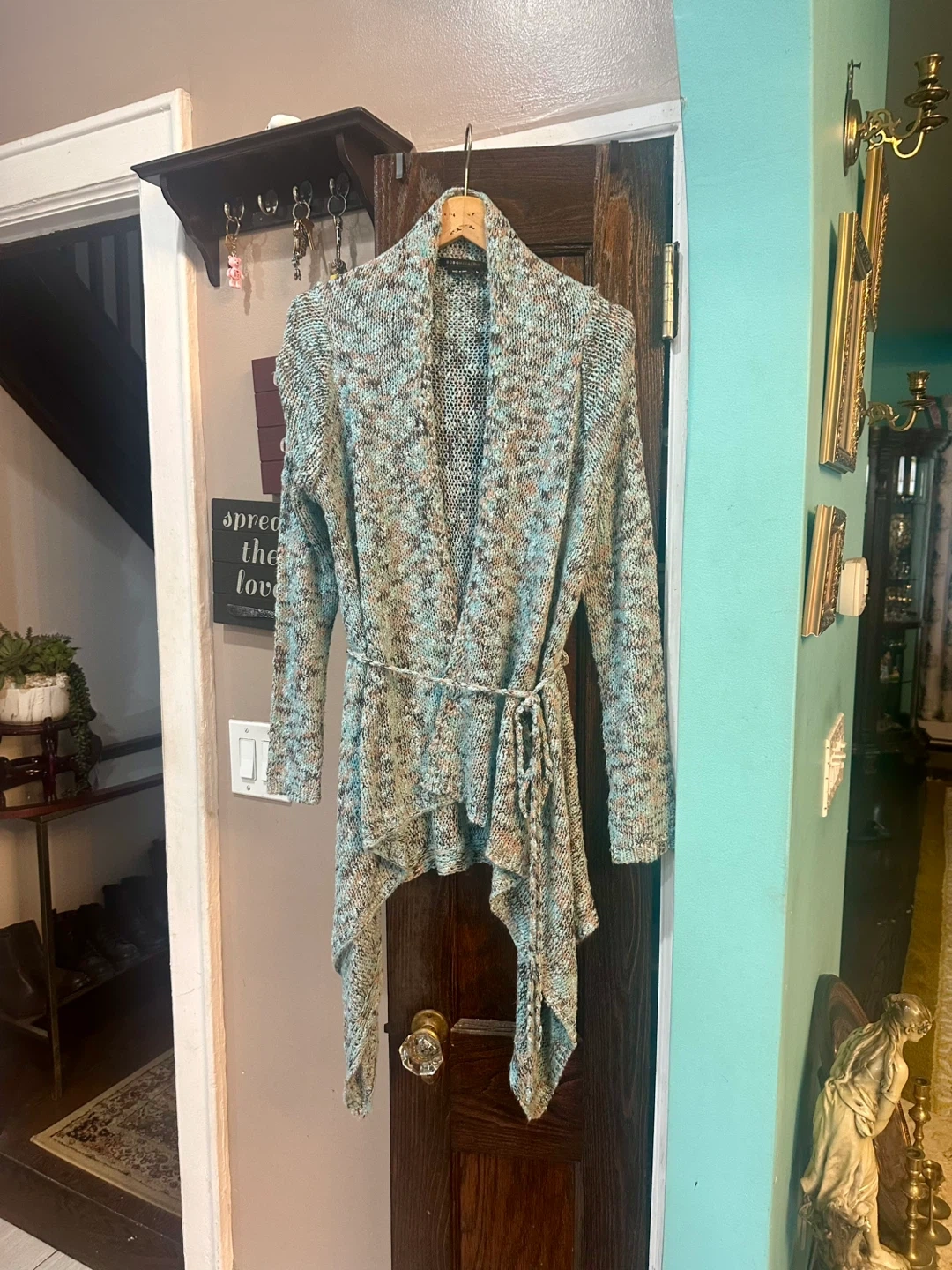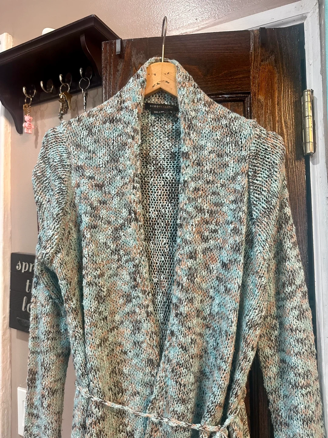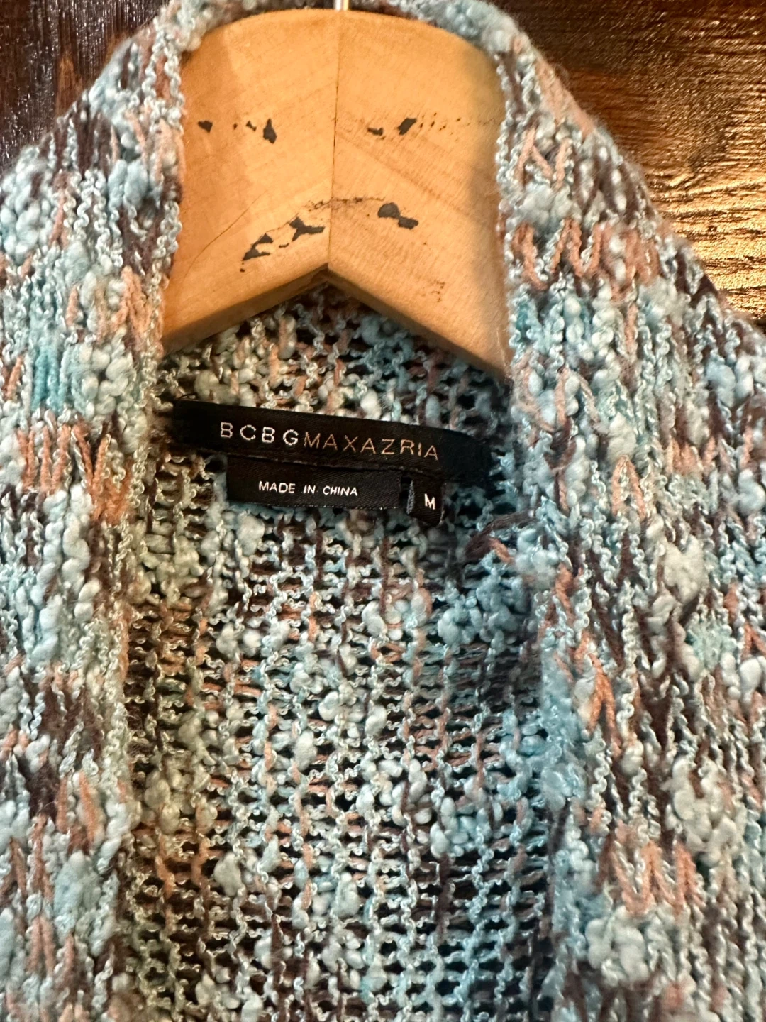 Selling a BCBGMAXAZRIA cardigan in size M. It's in great condition and has a stylish, open-front design with a tie waist. The cardigan features a unique blend of colors, perfect for adding a touch of flair to any outfit