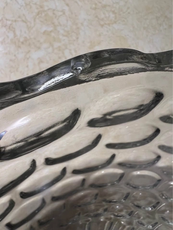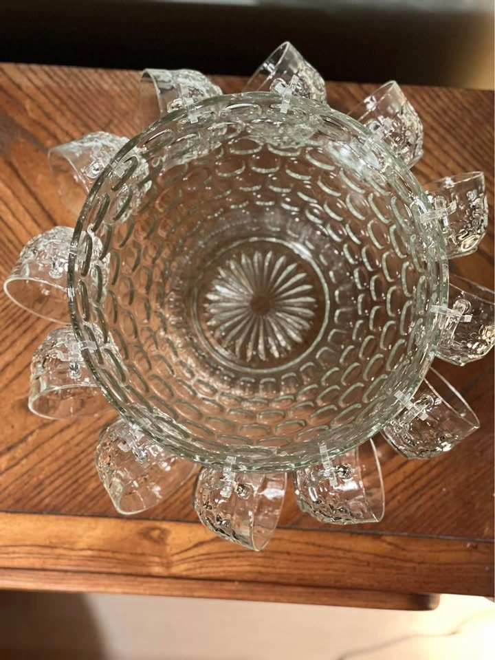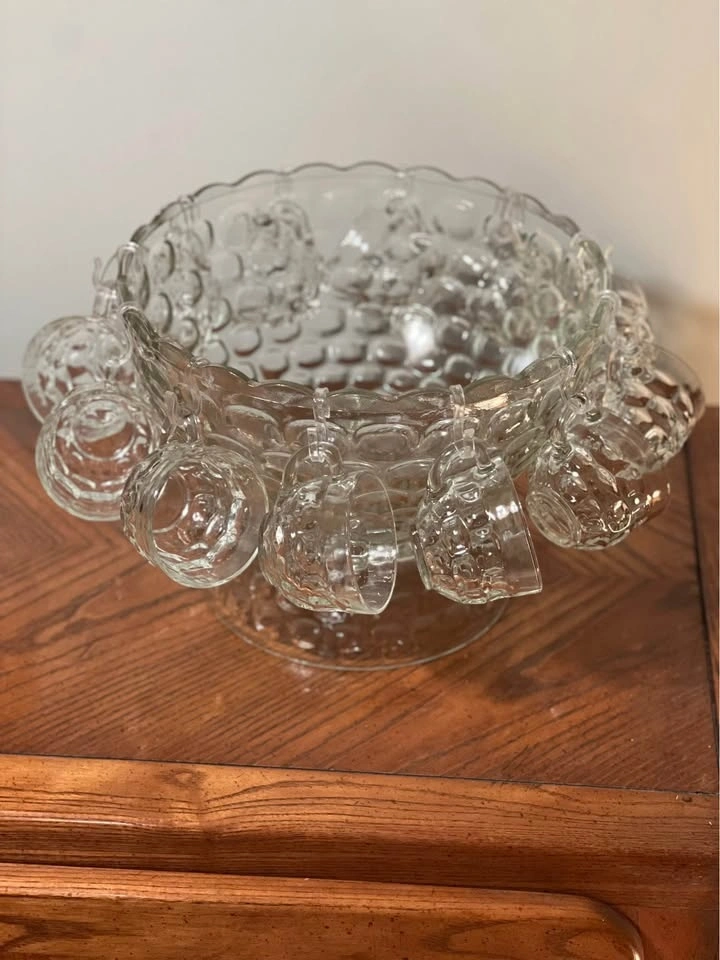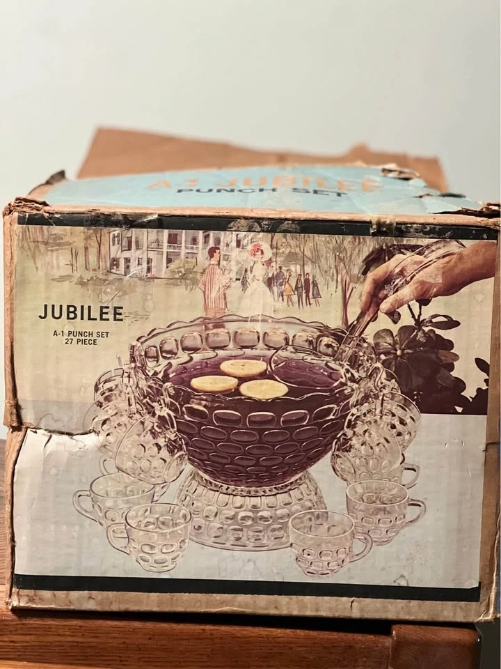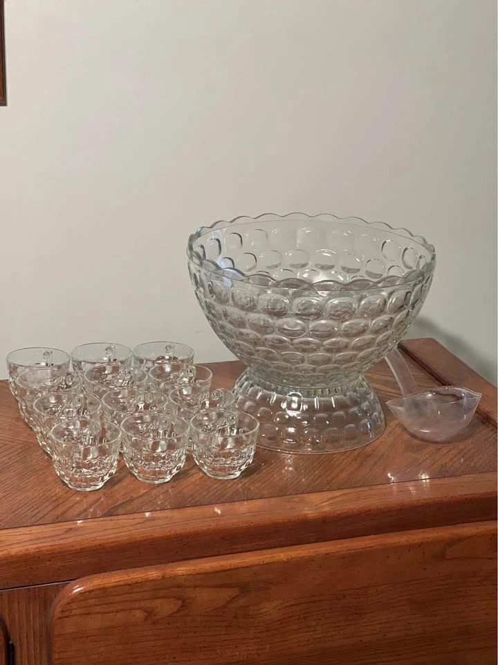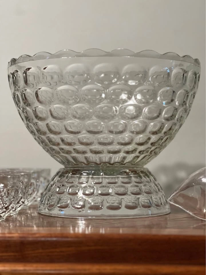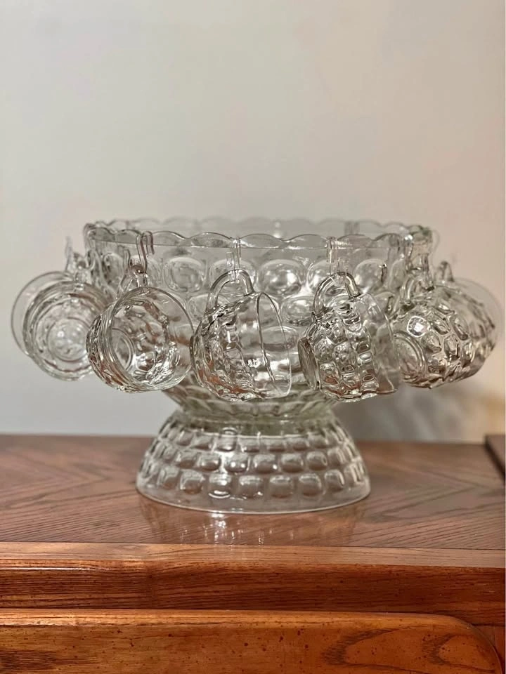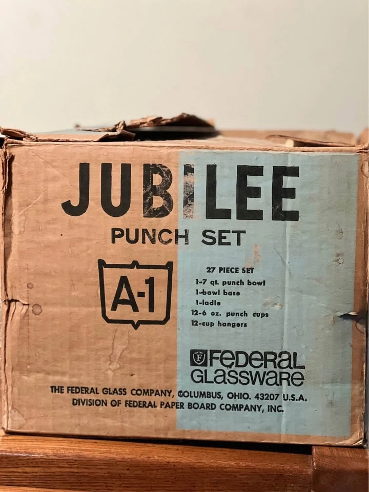 Federal Glass Company Jubilee (or Yorktown) 27-piece punch set. Includes a 7-quart punch bowl, pedestal base, ladle, 12 six-ounce punch cups, and 12 cup hangers. Features a classic mid-century thumbprint/bubble pattern. Produced by Federal Glass Company in Columbus, Ohio. The set is in its original packaging box. Preowned - 2 tiny chips on bowl and a larger chip on the base, as shown in the photos. Pickup is at 58th and 7th Ave in midtown Manhattan.