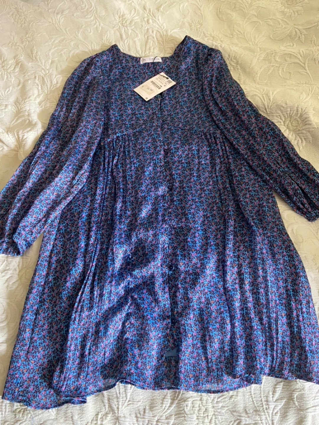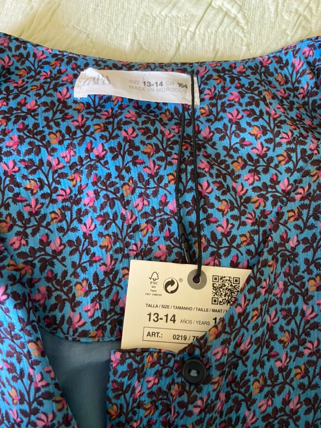 This is a cute Zara dress with a floral pattern. It's a size 13-14 years, which is about a CM 164. The dress is made in Morocco and has a lovely blue color with pink and brown floral details