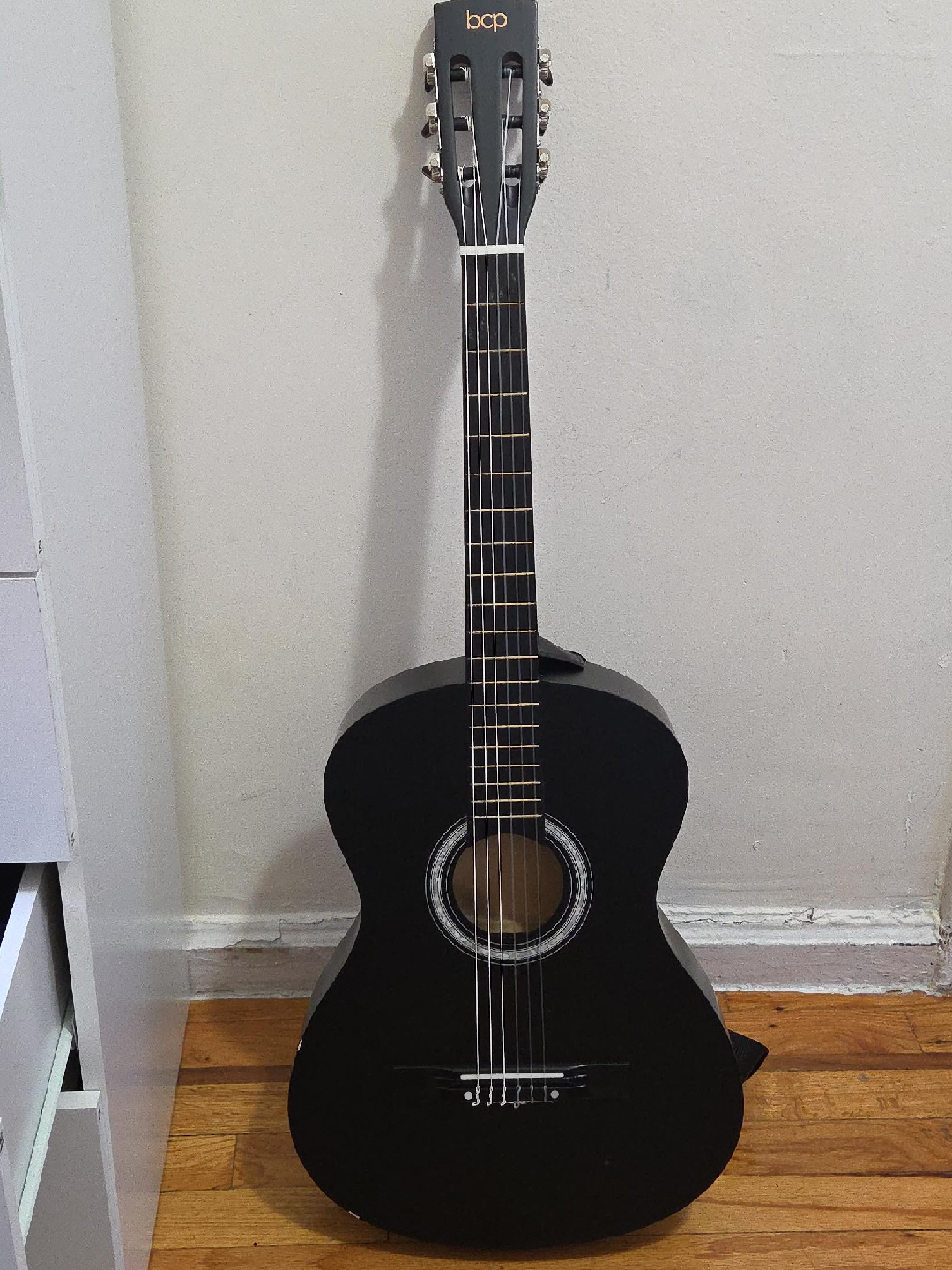 Selling a black acoustic guitar from BCP. It's in good condition and ready for a new home! Perfect for beginners or anyone looking for a stylish guitar.