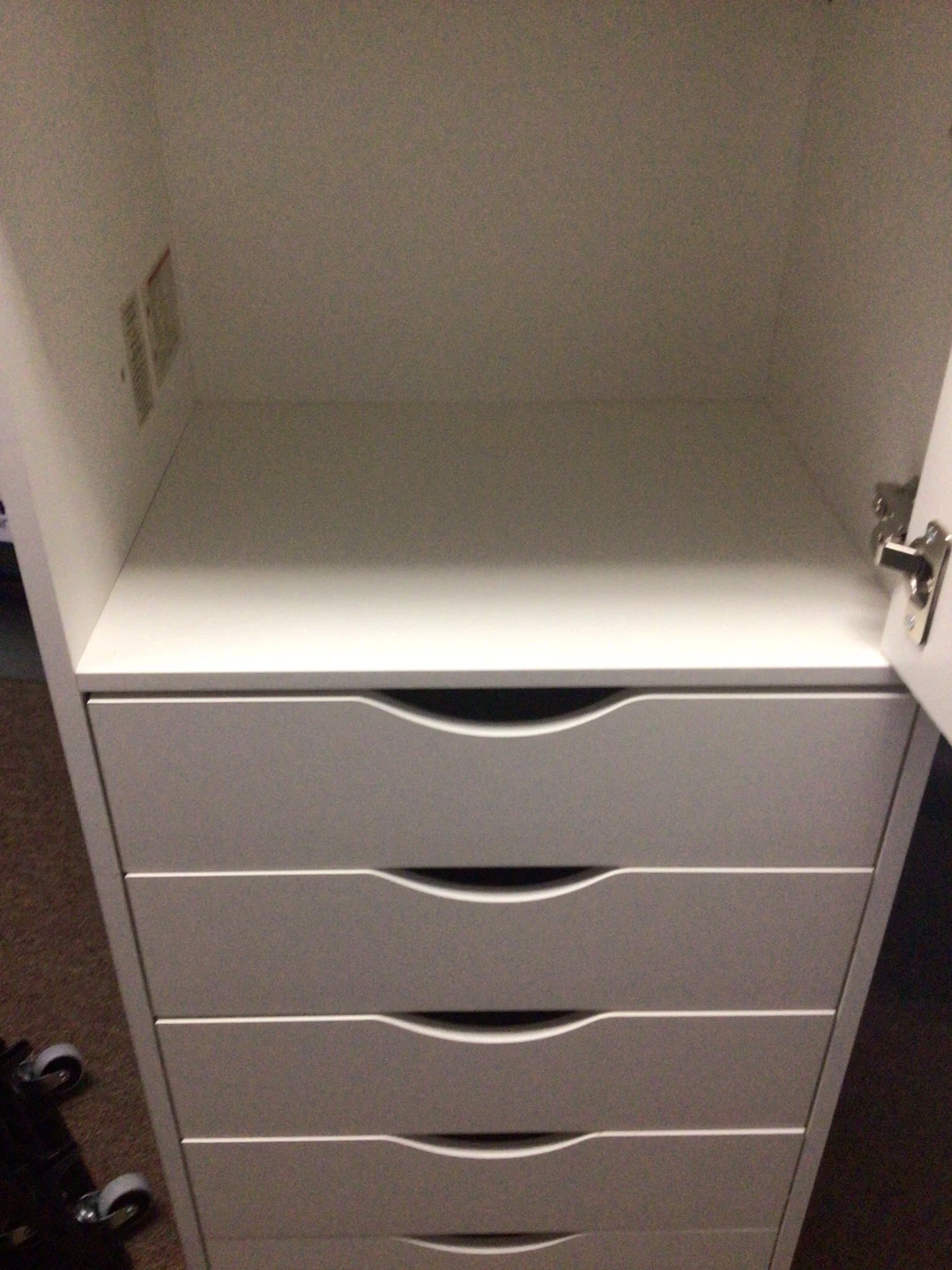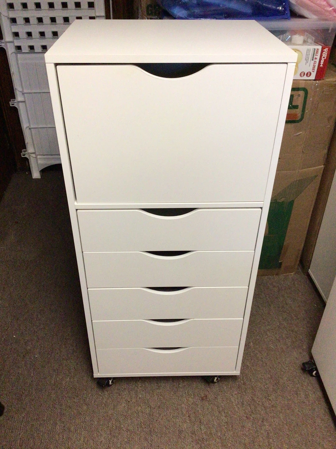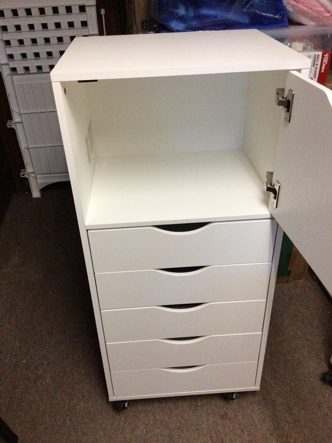 This white rolling drawer unit offers ample storage space. It features five drawers and a cabinet with a shelf. The unit is on wheels for easy movement. Dimensions are 42x19 drawer size is 16x19