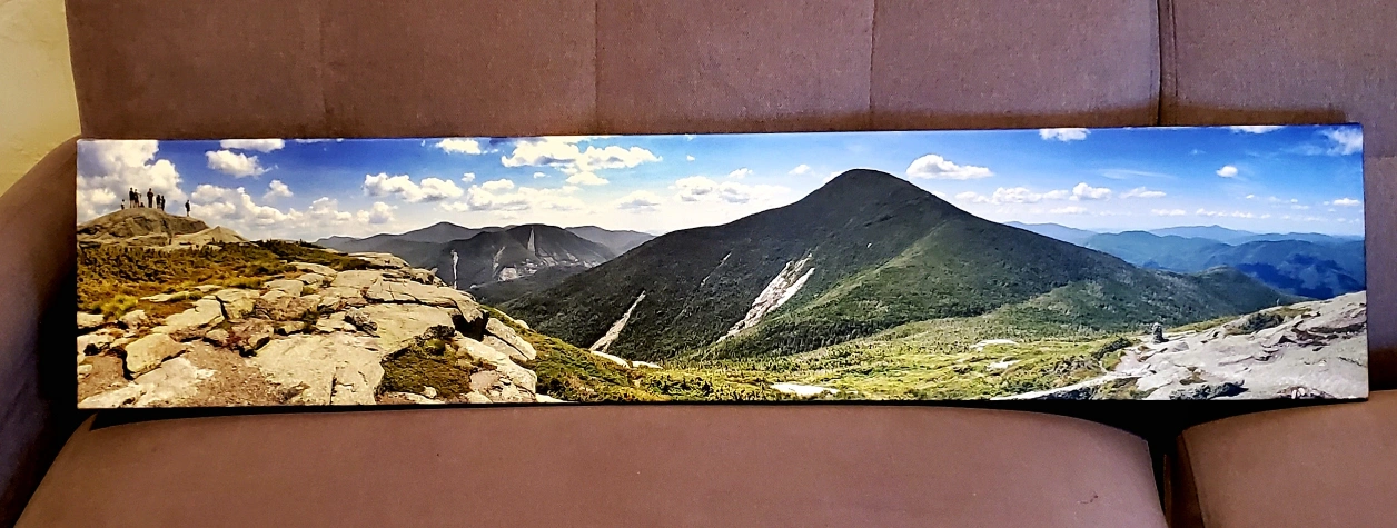 Scenic Adirondack Mountains landscape photo printed on stretched canvas. Size is 38"x 8". Wire is pre-attached on back. Ready for hanging.