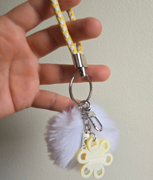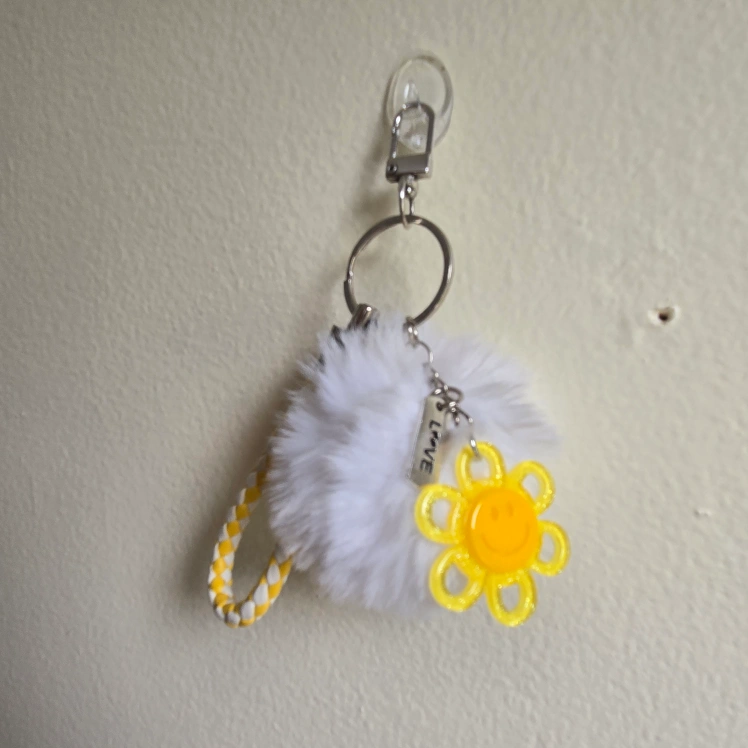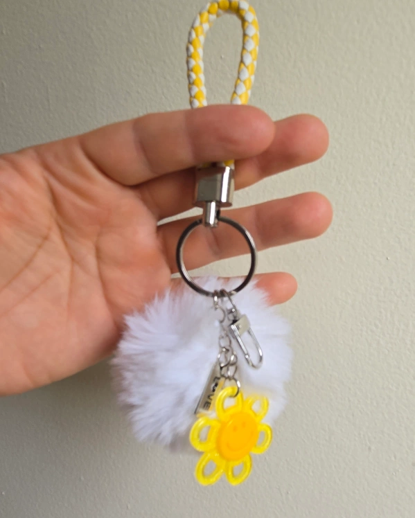 This is a handmade key chain holder with a cute smiley daisy and features a white pom-pom detail that adds a soft and playful touch that's hard to resist. It is made of plastic, and metal materials and features a small white/yellow wristle. This keychain is not just a statement piece but also a functional accessory that keeps your keys organized. The key chain is a perfect accessory for girlie keys or keyfobs and can serve as a fun and practical accessory for your bookbag or purse. Proudly made by me, this one-size key chain is an ideal gift or a charming addition to your keys or bag.