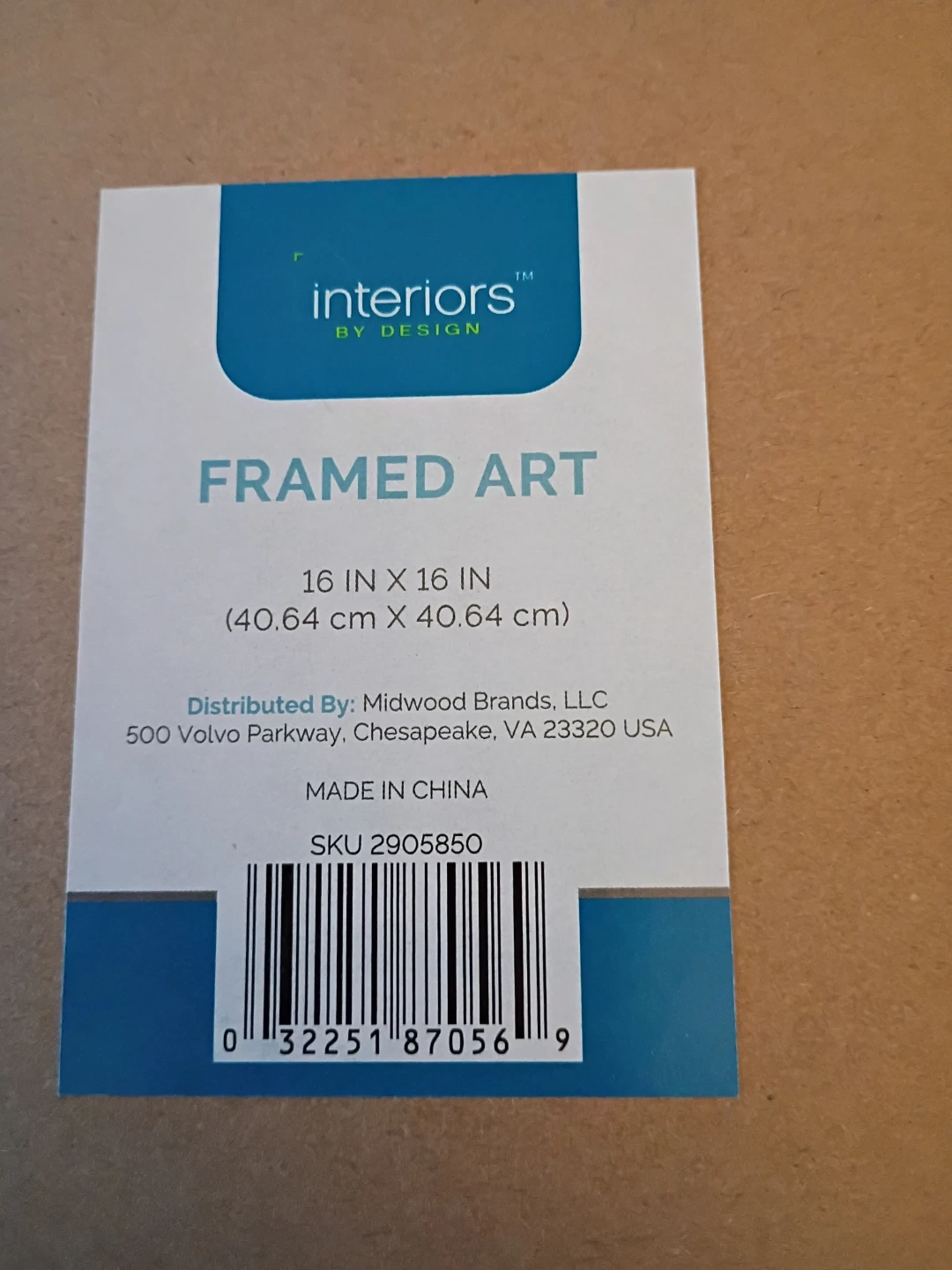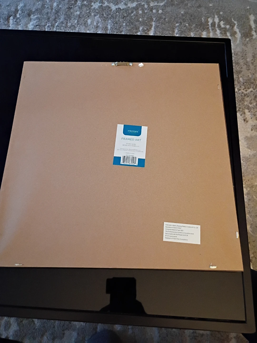 Selling an Interiors by Design framed art piece. It measures 16 inches by 16 inches. The composite material is MDF. It has a manufacture date of January 2023