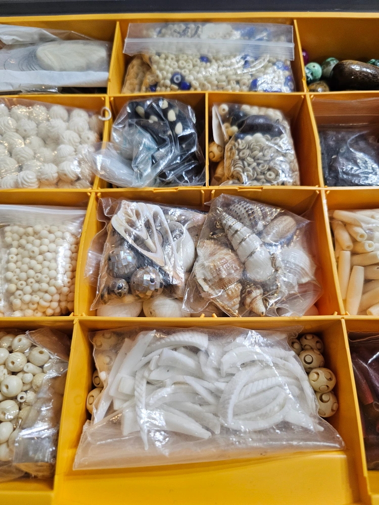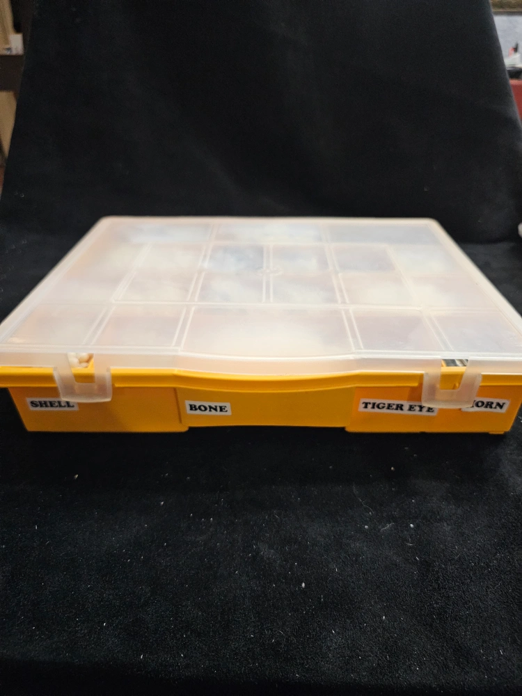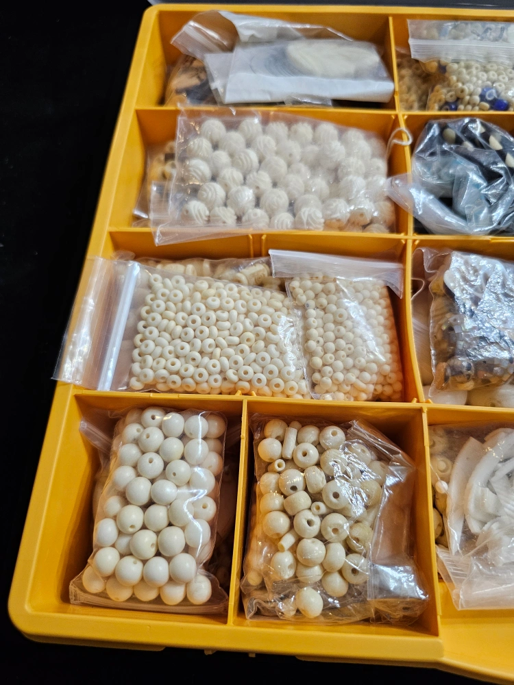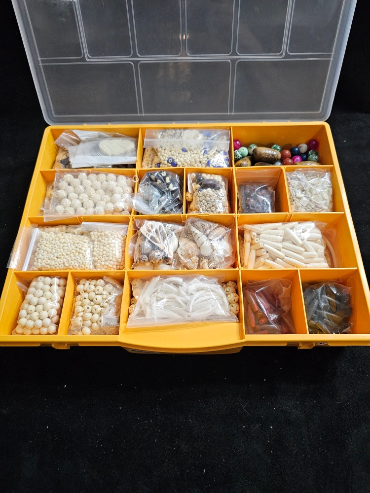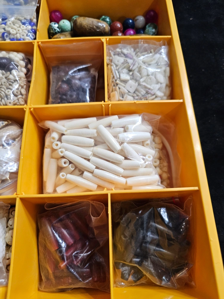 Here's a collection of beads, sorted into a handy yellow container. The beads include shell, bone, tiger eye, and horn. Great for jewelry making or other craft projects!