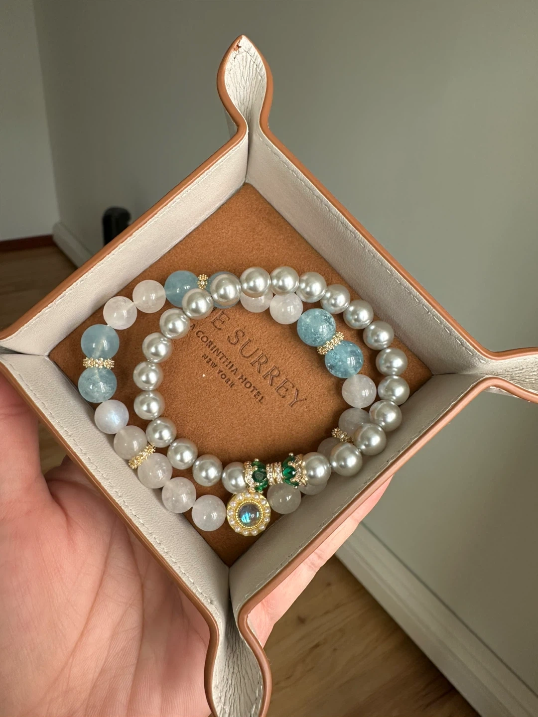 Selling a beautiful set of two beaded bracelets. One bracelet features lustrous pearls with aquamarine accents, while the other showcases moonstone beads. Both are in great condition and ready to add a touch of elegance to your wrist!25 for both