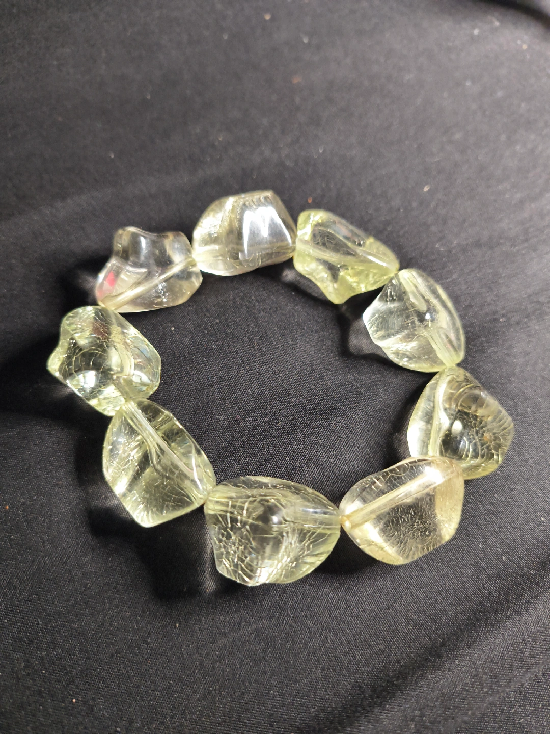 Here's a beaded bracelet with a light yellow hue! The beads are a unique shape and have a textured appearance. Perfect for adding a subtle pop of color to your outfit