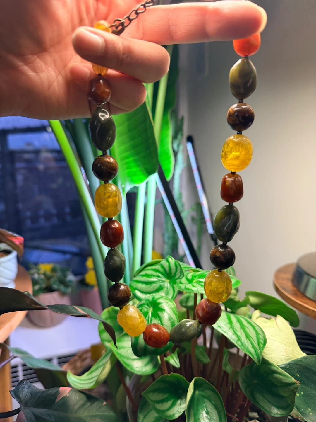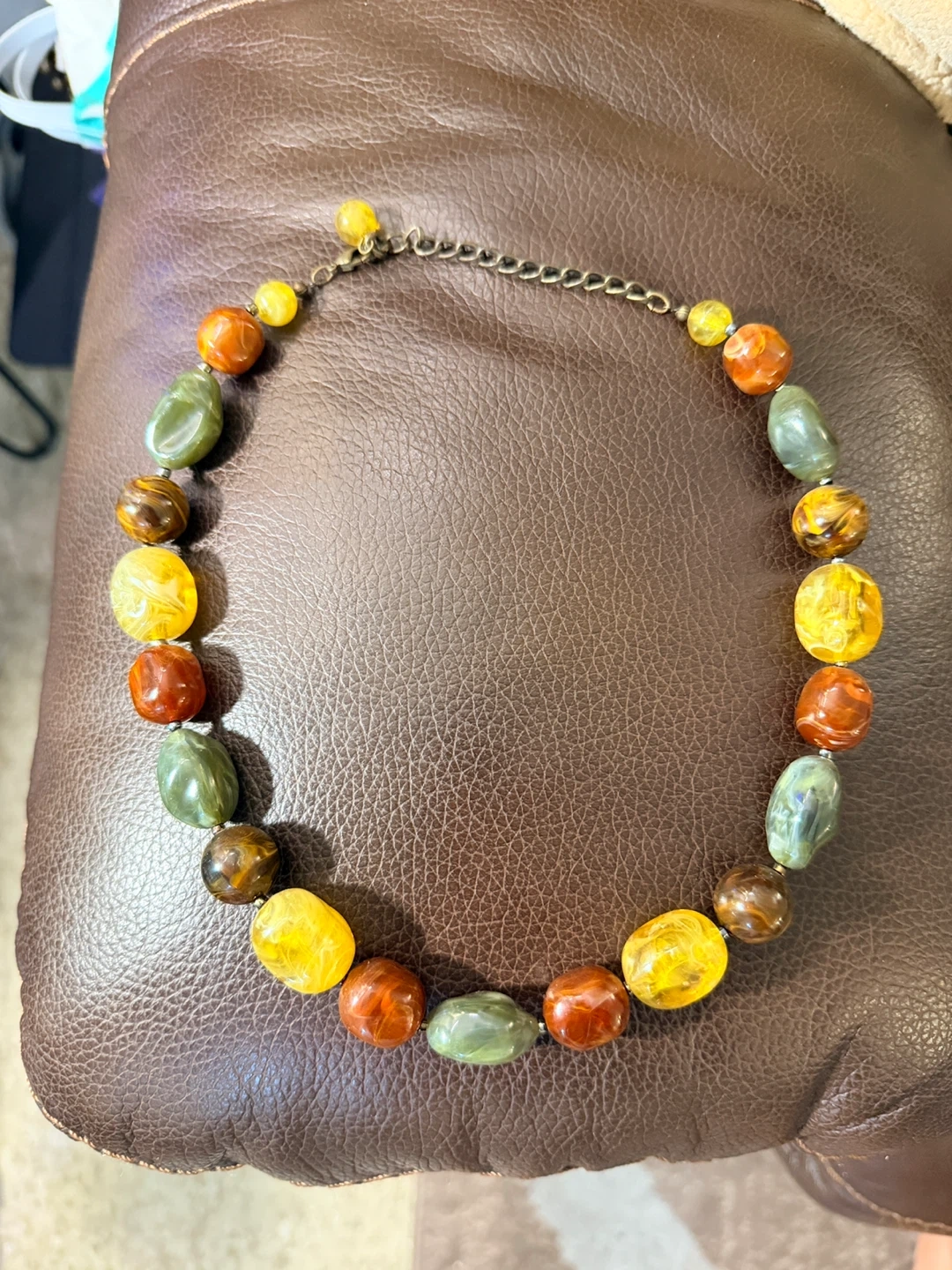 1000+Selling a beaded necklace with a mix of yellow, brown, and green beads. It's in good condition and would make a great addition to any outfit