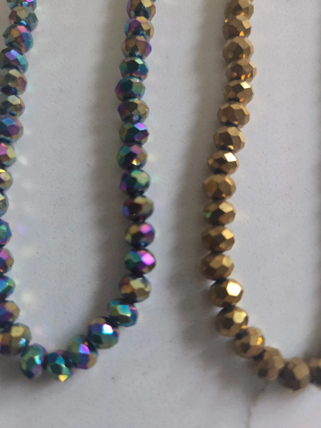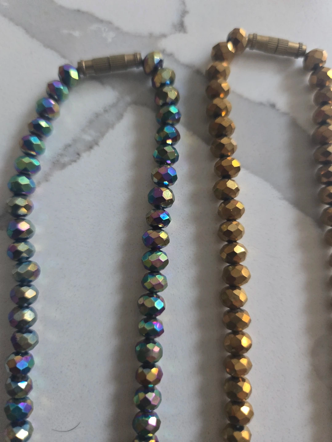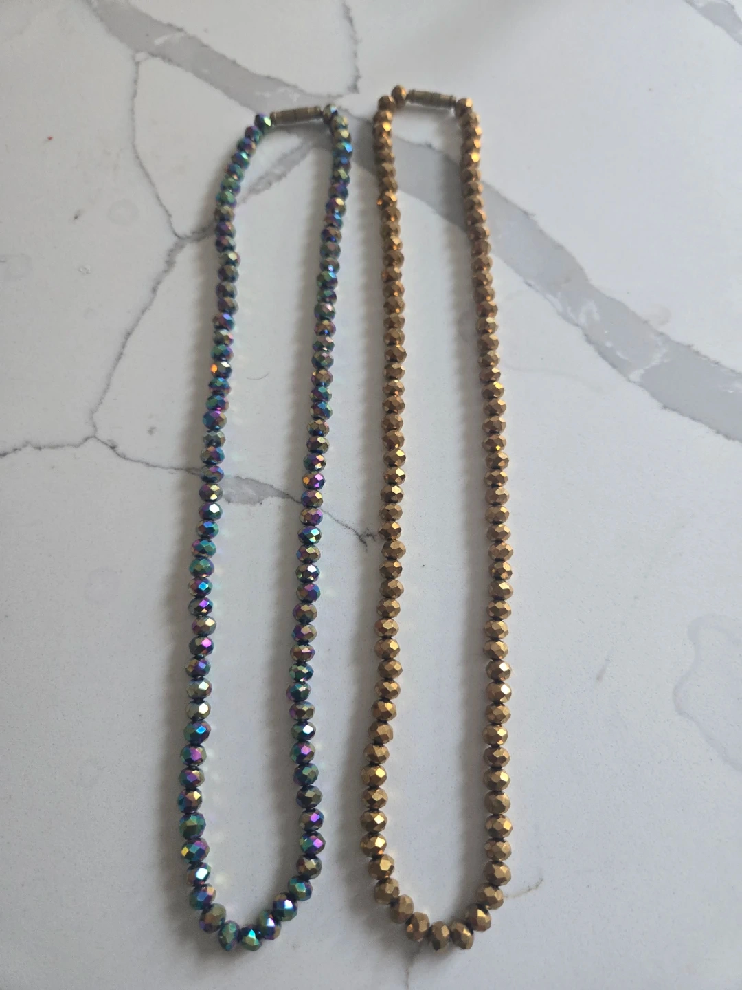 149Selling two beautiful beaded necklaces! One is iridescent and the other is gold. They're in great condition and ready to add some sparkle to your outfit