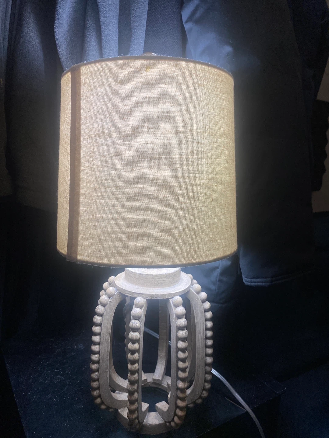 Here's a charming table lamp with a unique beaded wooden base and a neutral-toned shade. It adds a touch of rustic elegance to any room. The lamp is in great condition and ready to brighten up your space!