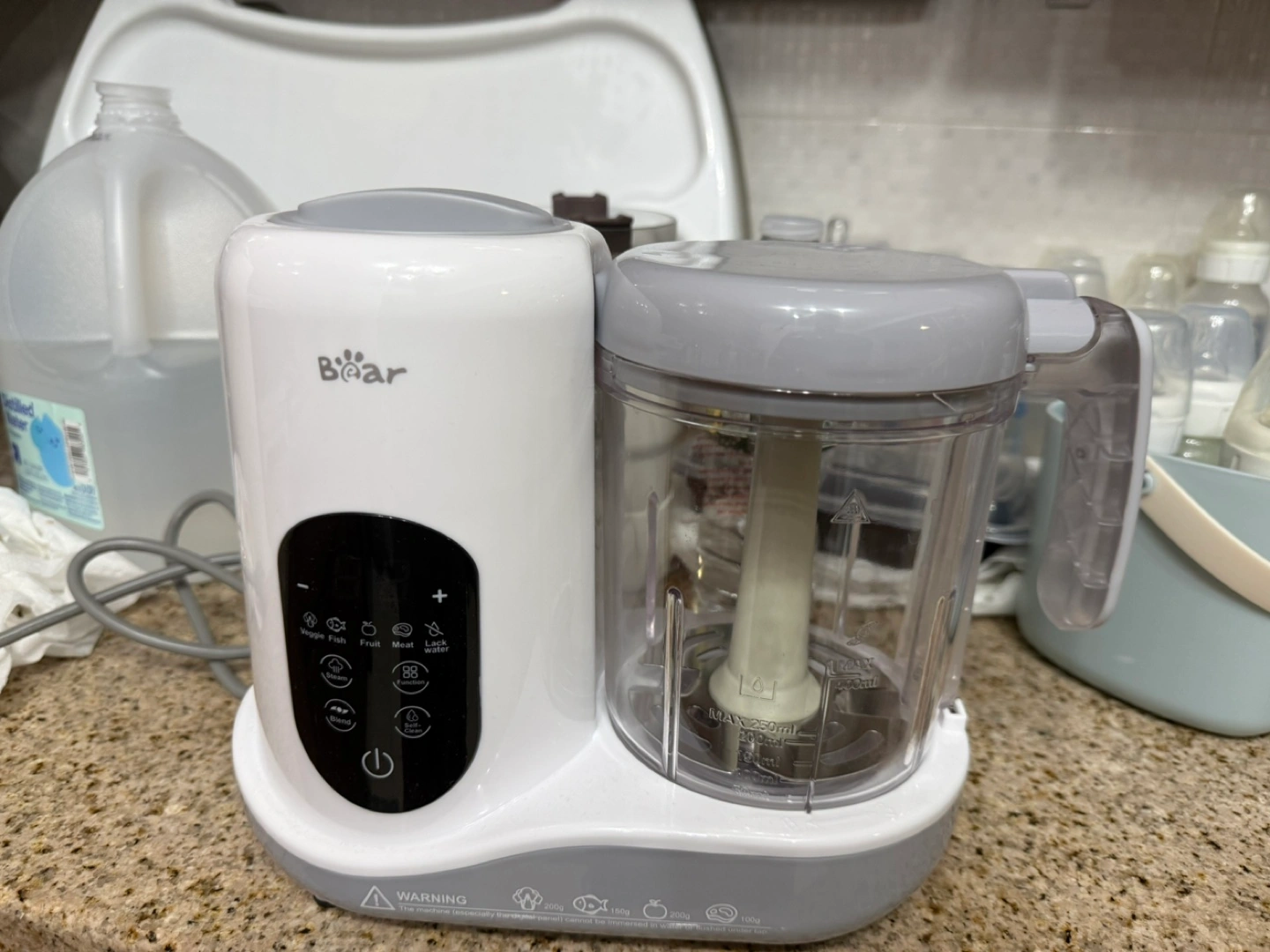 I'm selling a Bear baby food maker. It can steam and blend food for your little one. It has settings for steaming veggies, fish, fruit, and meat. It also has a self-cleaning function.