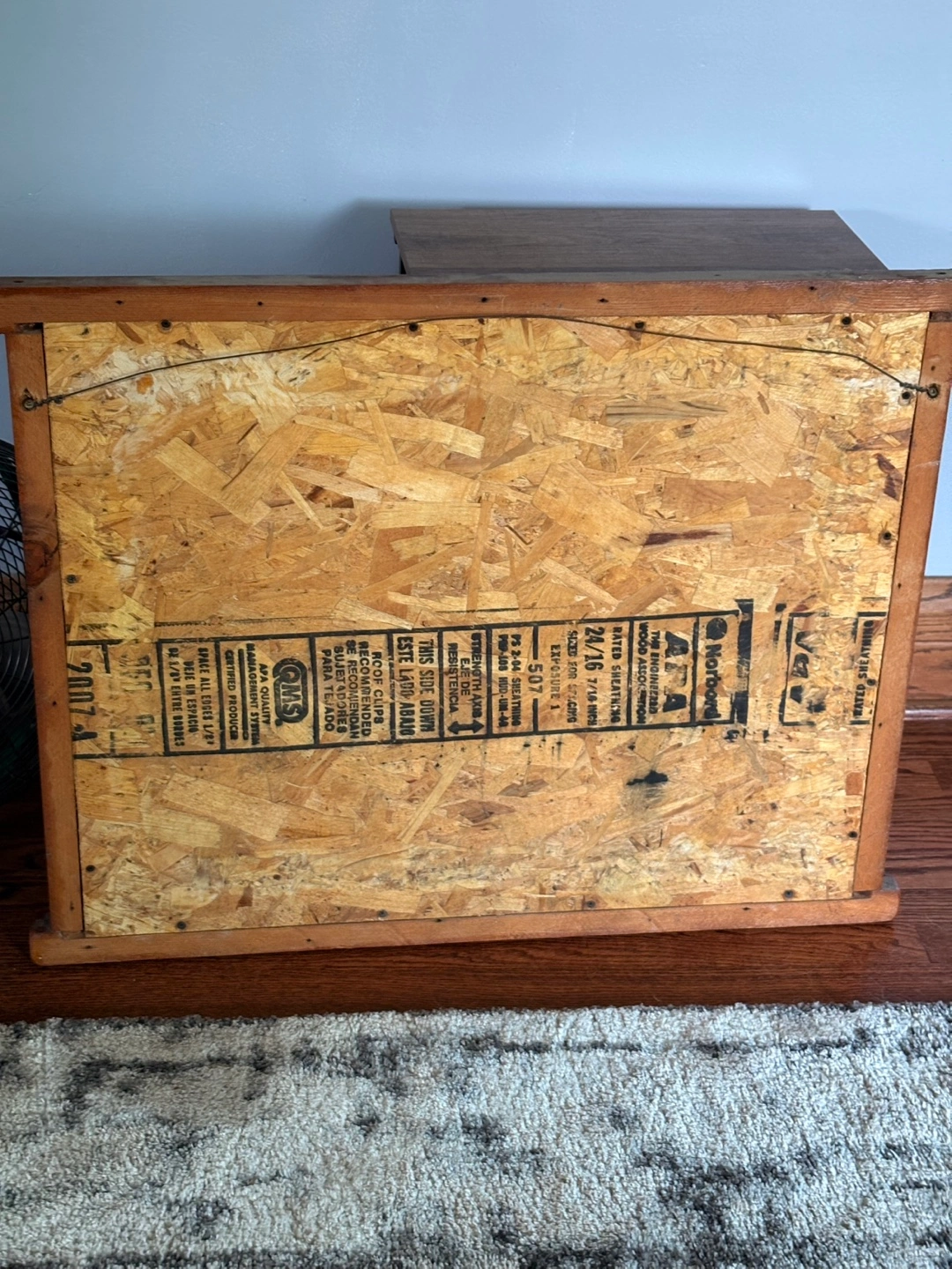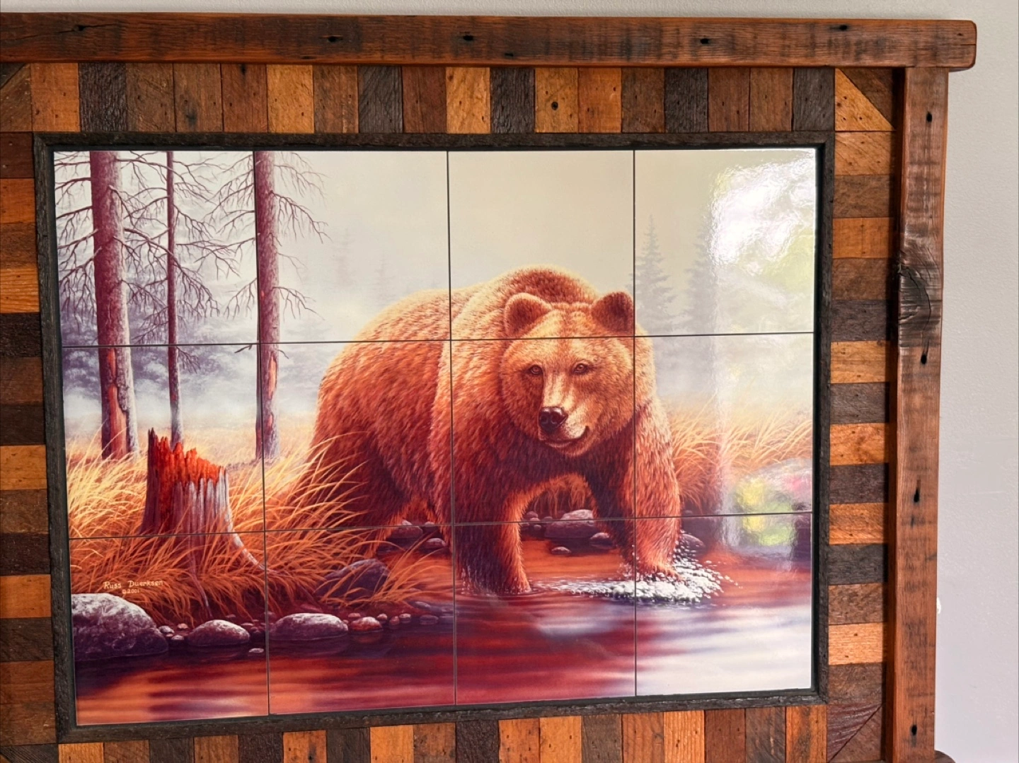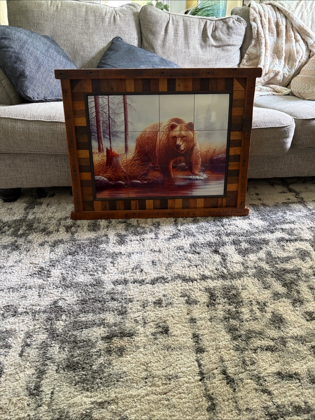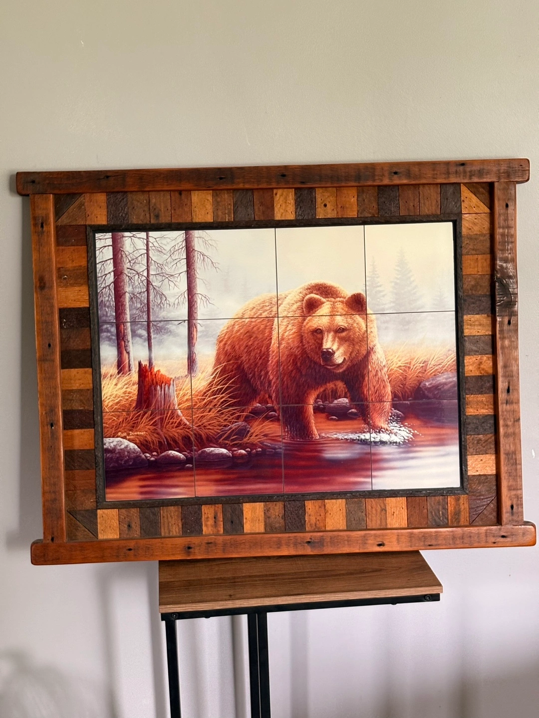 End table with a wooden frame and a tile top featuring a bear in a forest scene. This unique piece would add a rustic touch to any room