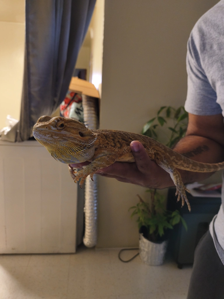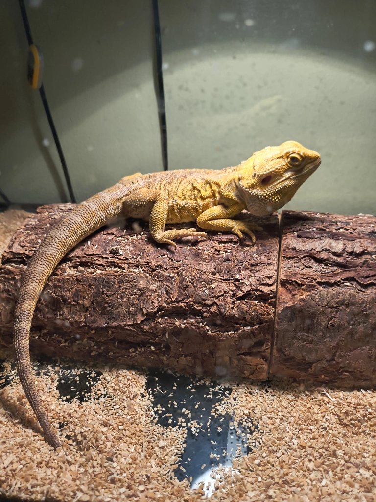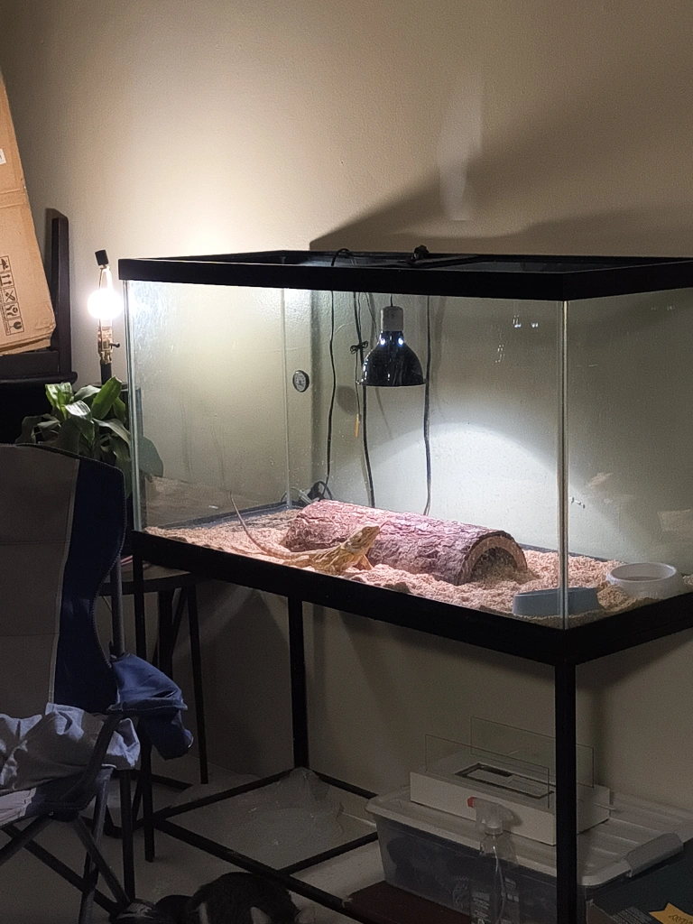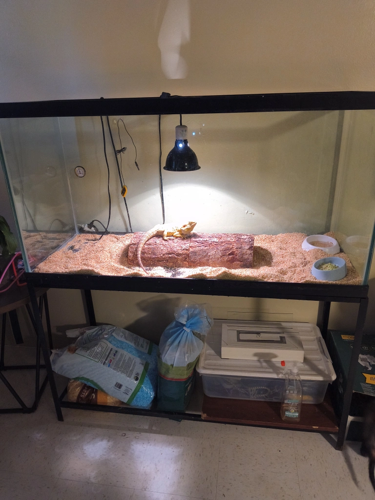 Selling my bearded dragon with its full setup! Includes the tank, lighting, and water dishes, and a log hide. Everything you need to keep your new friend happy and healthy!