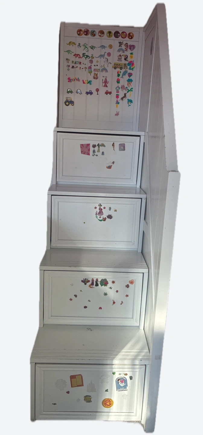 This is a cute white staircase dresser for kids. It has multiple drawers for storage. It would be great for a kids room or play area. Dimension: 20-3/4"W x 41-1/2"D x 71"H Sold on : https://thebeanbagstore.com/beatrice-white-bunk-bed-stairs.htm?srsltid=AfmBOoqqz5tKWKbFL6p3fEWedefON5RKJCeXHv4Y1pyQp_SsekUxE7p0 MRSP: ~ > $1500 Offers welcome. PREOWNED