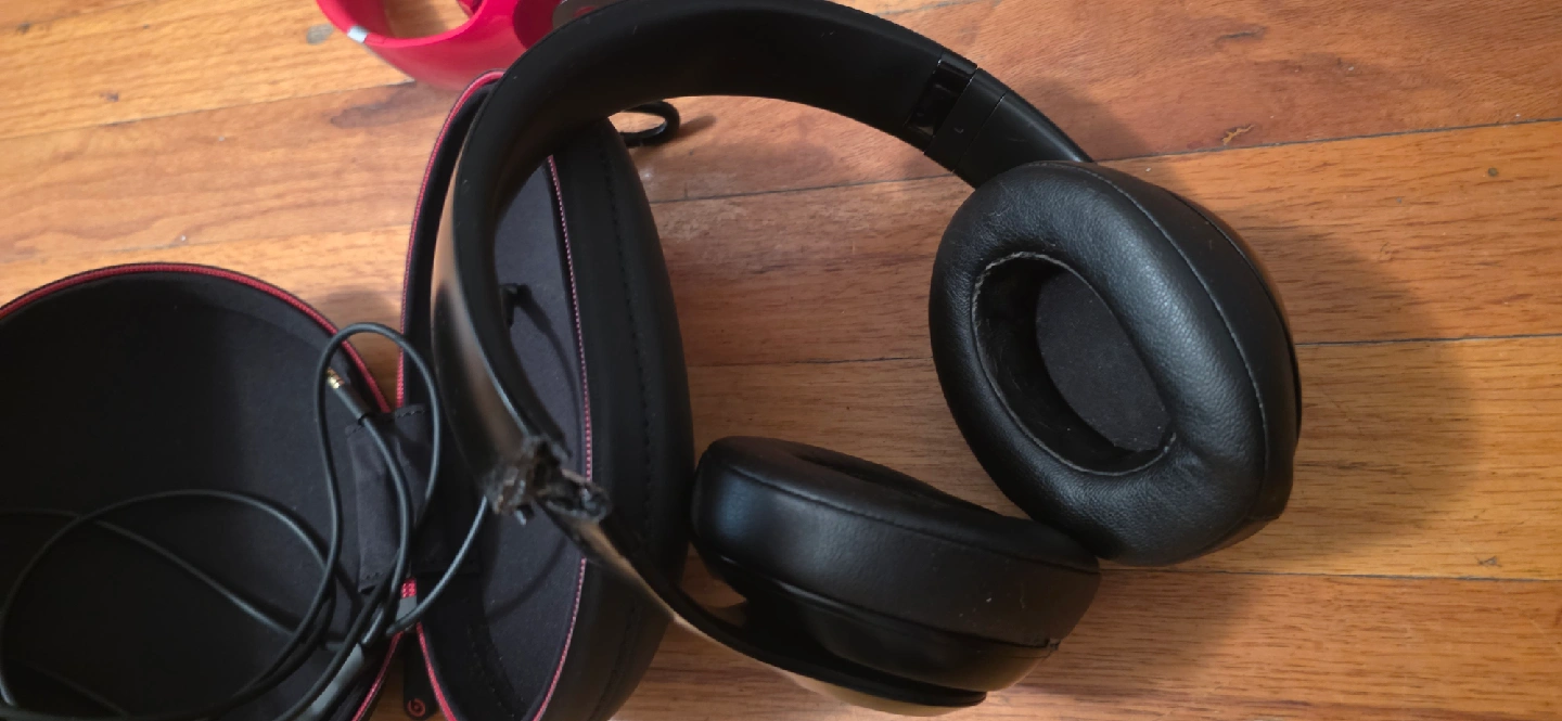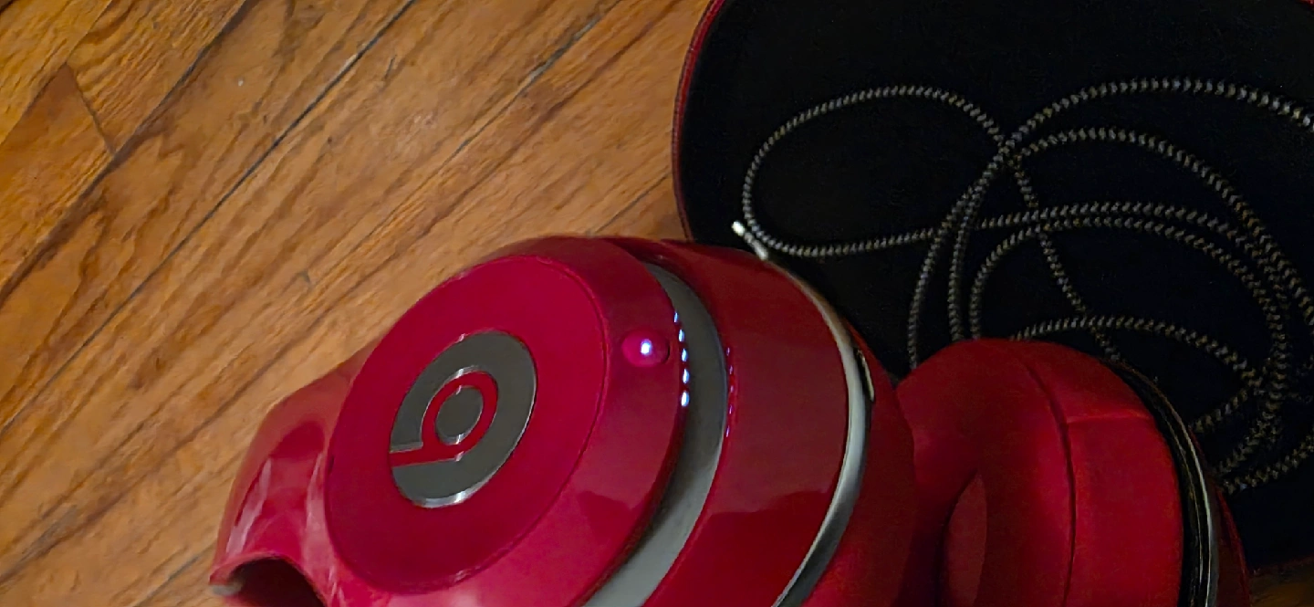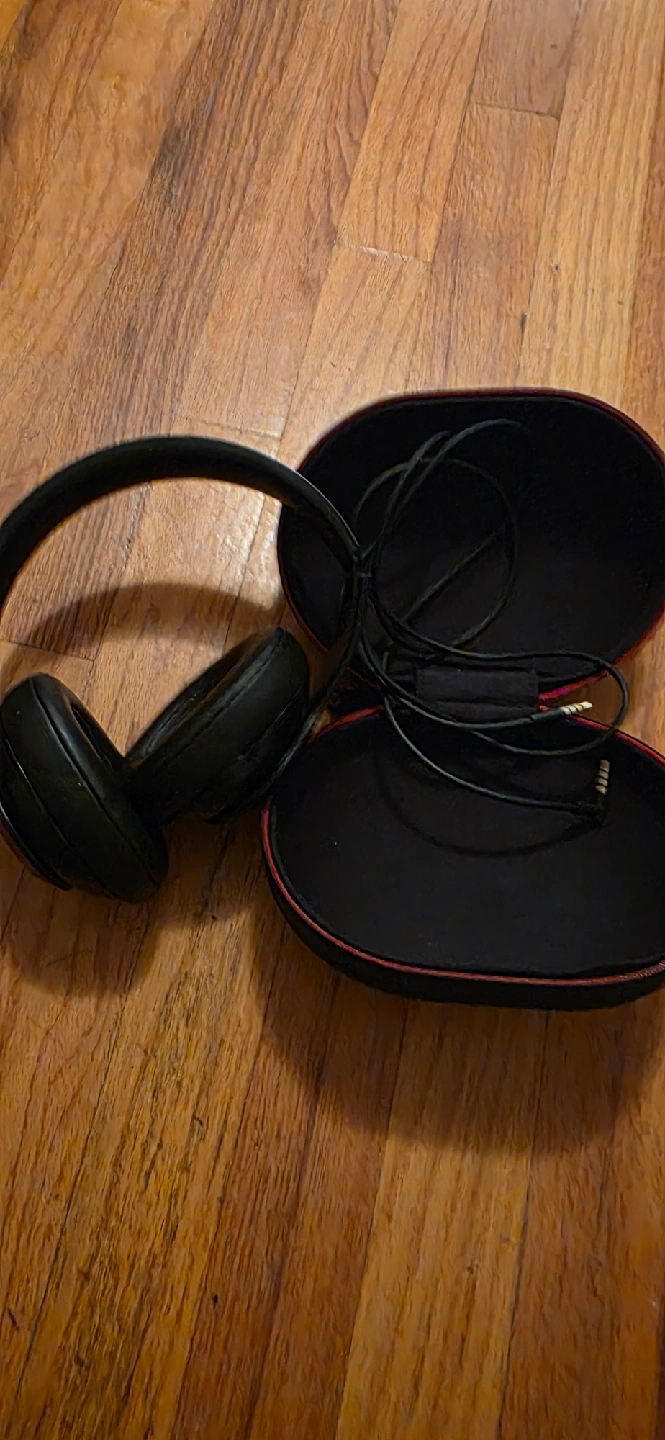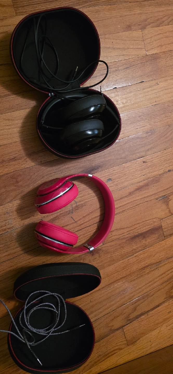 23Selling a pair of Beats Solo 3 wireless headphones. One is black and the other is red. Both are damaged, as the black one has a broken band. The red one appears to be in better condition. Selling for parts or repair. The carrying case is included.