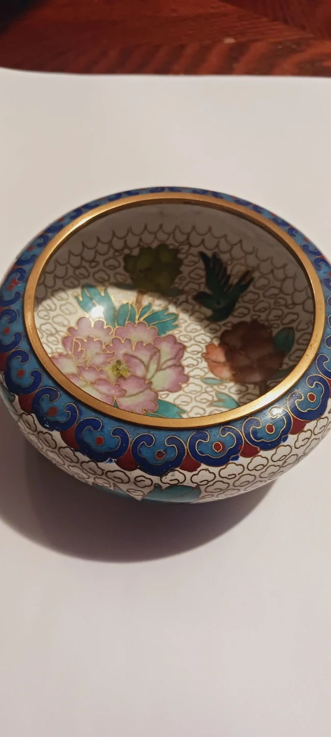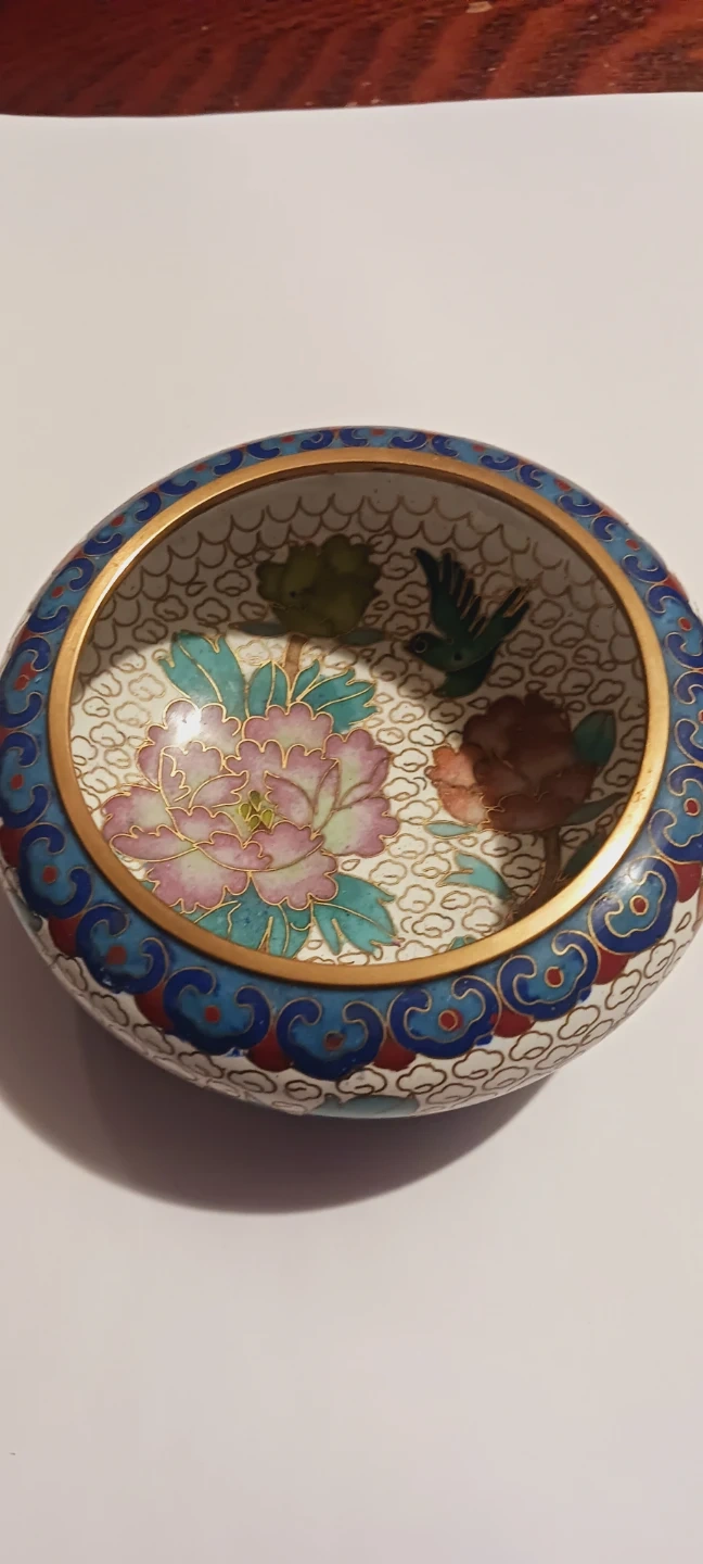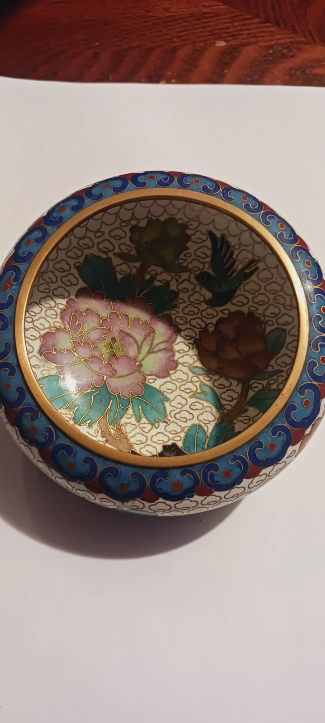 1000+This is a beautiful Asian cloisonné enamel small dish. It features a floral and bird design with a blue, red, and gold color scheme. It's perfect for holding small items or as a decorative piece !! 4" diameter. 4"×2". Excellent condition. ALL MY PRICES ARE NEGOTIABLE !!
