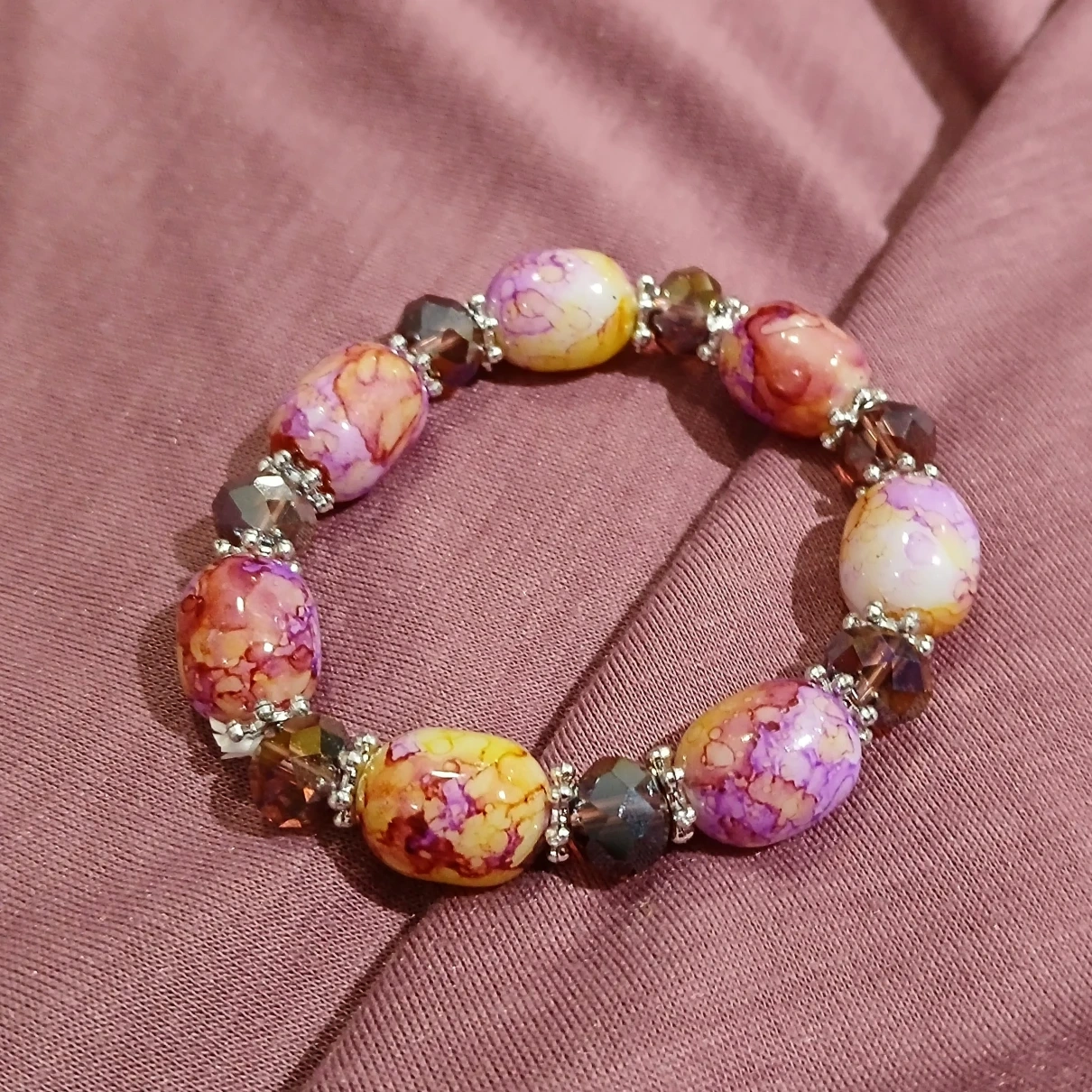 1000+Stunning bracelet features vibrant yellow, purple, and orange marbled beads. Alternating dark brown crystal accents. Silver-toned metal bead separators. Elastic band.