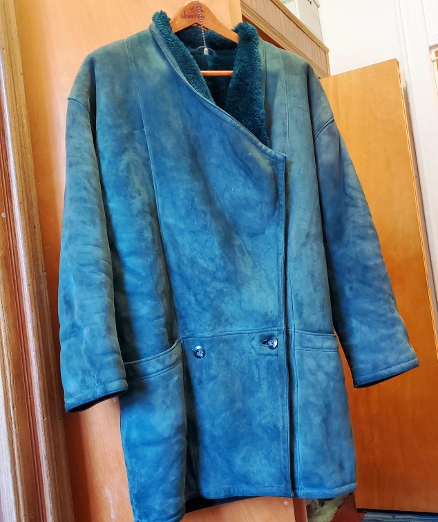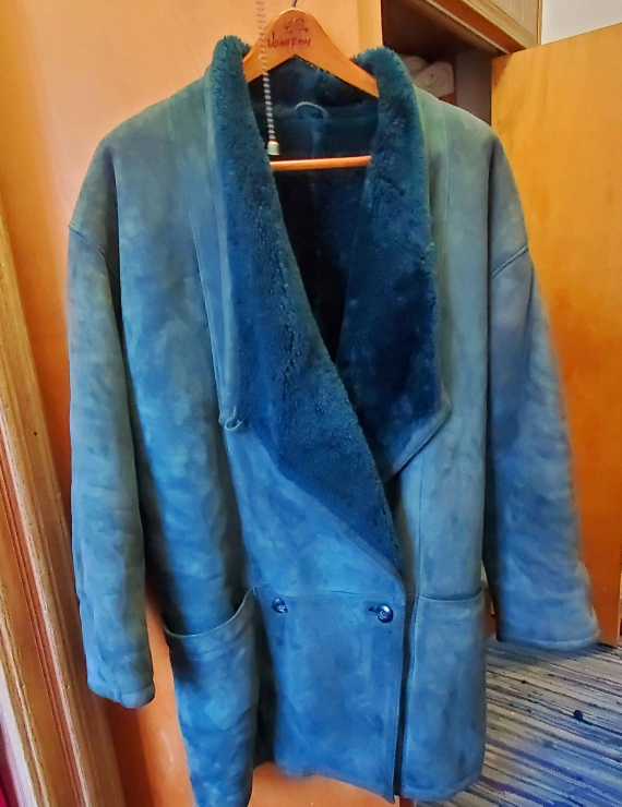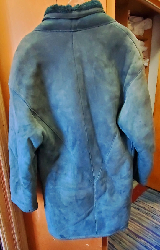256Get ready for winter with your warmest new favorite winter coat! Genuine shearling made in Spain. 100 % shearling leather, heavyweight, in dark green. Features 2 big pockets + button closure. Length on me is about 3" above the knee (I'm 5'4"). Size Small but runs a bit bigger.