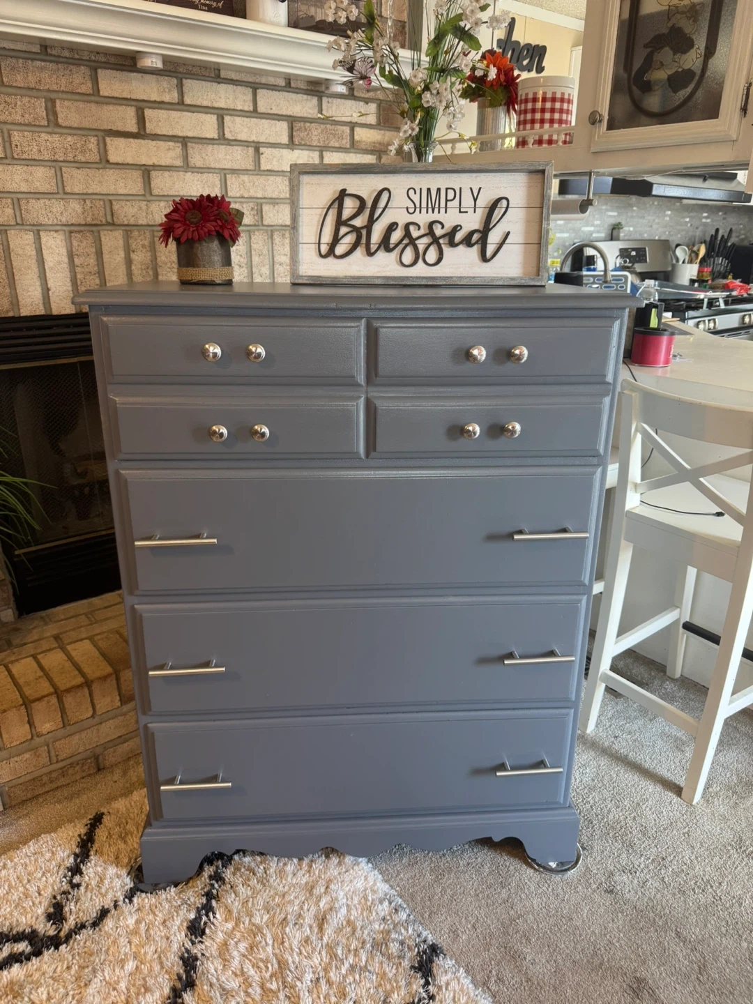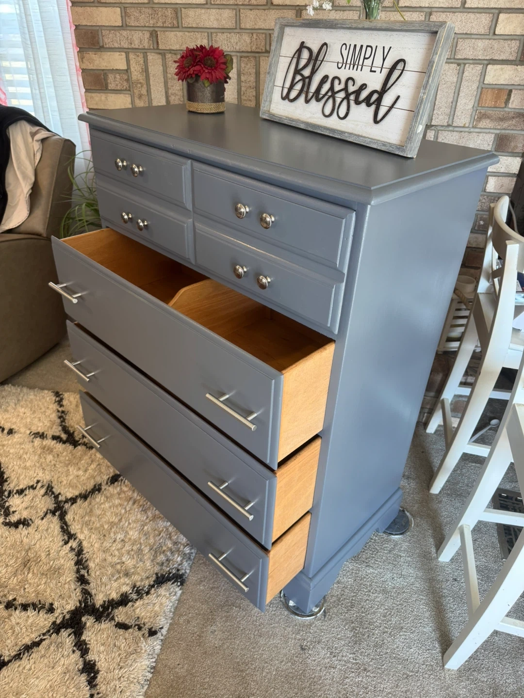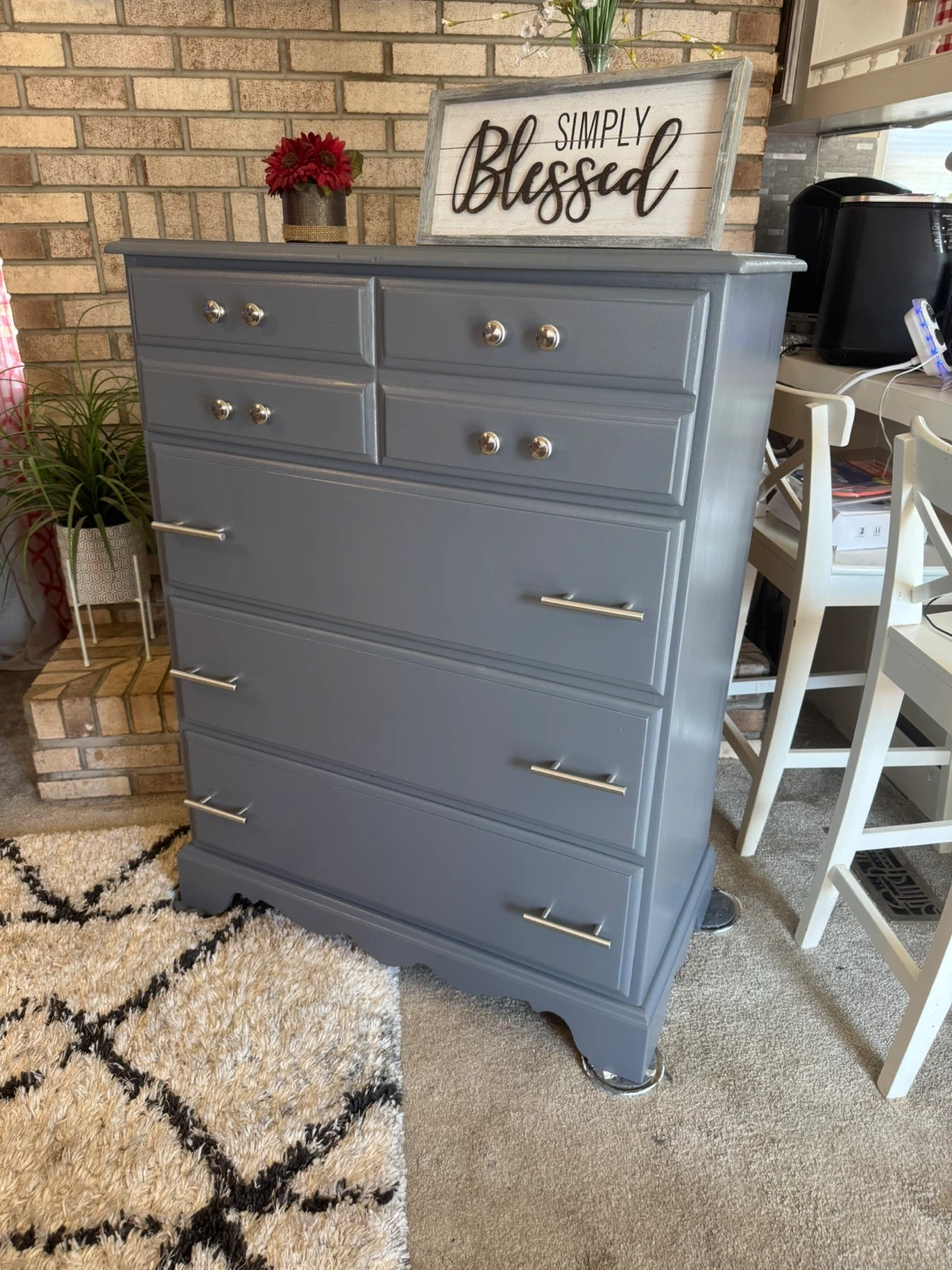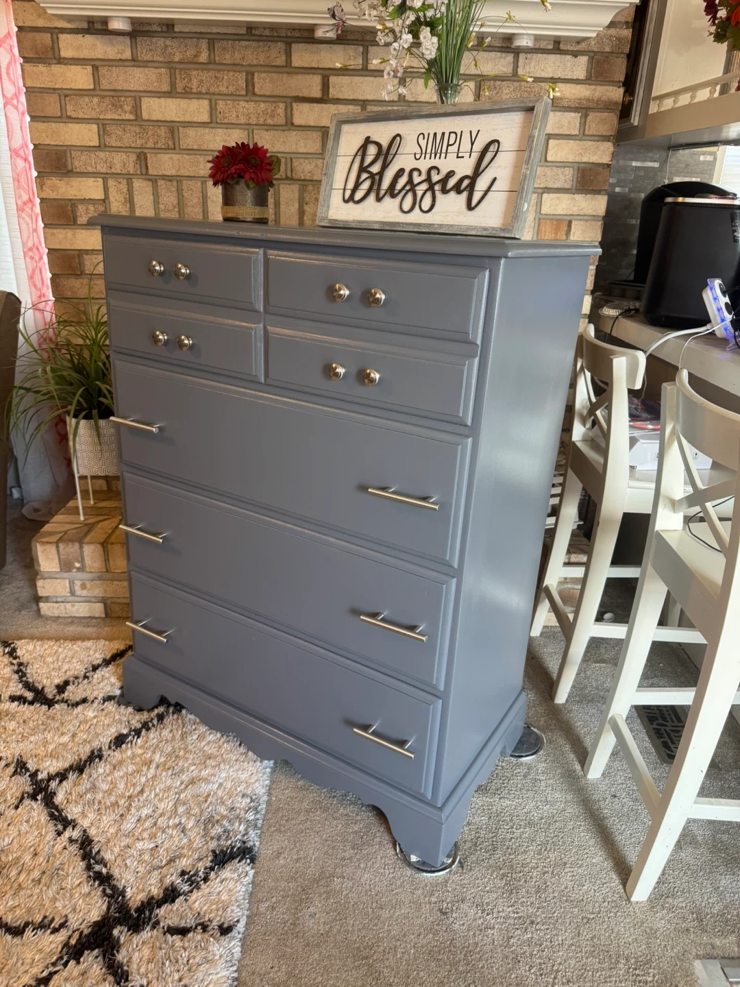 ✨✨MEASUREMENTS BELOW👇🏼✨✨ BEAUTIFUL GRAY TALL REFINISHED 4 DRAWER BASSETT DRESSER✨✨ALL DRAWERS ARE DEEP AND HOLDS ALOT.. ALL WOOD DRAWERS OPEN AND CLOSE LIKE THEY SHOULD.. ALL NEW SILVER HARDWARE.. BEAUTIFUL DRESSER IT WONT LAST LONG SO COME TAKE A LOOK! IF POSTED ITS AVAILABLE.. PICK UP IN JUSTICE IL BY 79th ROBERTS RD.. PLEASE BRING HELP IF YOU HAVE IT.. FIRST COME FIRST SERVE.. NO HOLDS WITHOUT A SMALL DEPOSIT ( 1 day hold ) CASH ONLY ON ARRIVAL.. SERIOUS BUYERS ONLY PLEASE.. CHECK OUT MY OTHER FURNITURE LISTINGS.. I GIVE A SMALL DEAL IF YOU BUY MORE THAN ONE.. MEASUREMENTS: 44” tall 34” wide 18” deep Thanks for looking 👀