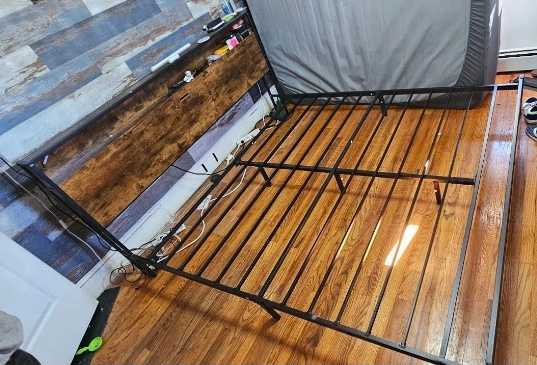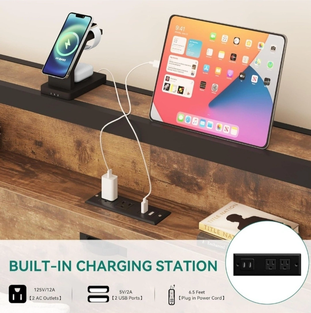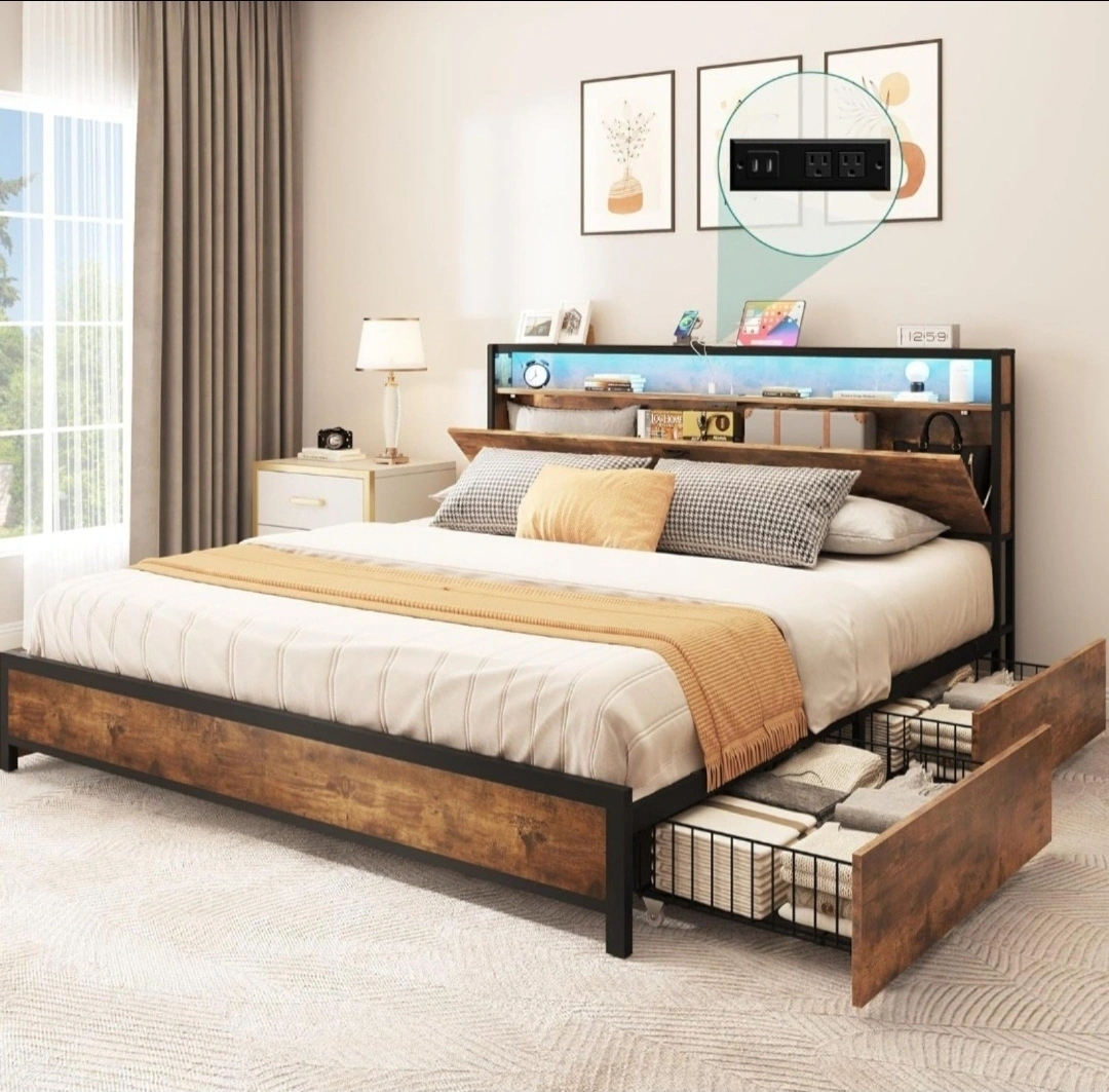 king size bed frame featuring a rustic brown headboard with built-in charging station (2 AC outlets, 2 USB ports) and storage drawers on wheels. The bed frame is made with a sturdy metal frame and has a weight capacity of 1100 lbs. Dimensions are approximately 86.6" x 56.3" x 40.1". Drawers under the bed have wheels for easy pulling out. VERY NICE KING SIZED BEDFRAME WITH 4 UNDERBED STORAGE DRAWERS AND HEADBOARD STORAGE. BROWN WOOD PANELING. STRONG AND STURDY BREIFLY USED LESS THAN 6 MONTHS PURCHASED NEW ON AMAZON 1100LB WEIGHT CAPACITY BUILT IN LED LIGHTING IN HEADBOARD BUILT IN CHARGING STATION CLEAN HOME, GROUND FLOOR EASY PICK UP. HEADBOARD IS STILL PUT TOGETHER MAKING TRANSPORT AND REBUILD EVEN EASIER PICK UP ONLY SERIOUS INQUIRIES PLEASE...NEED TO MOVE ASAP .