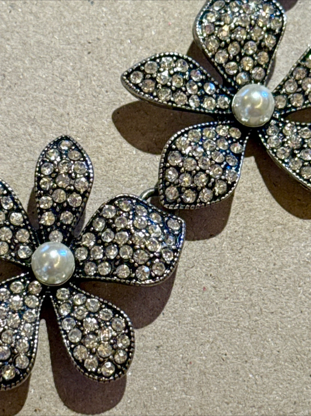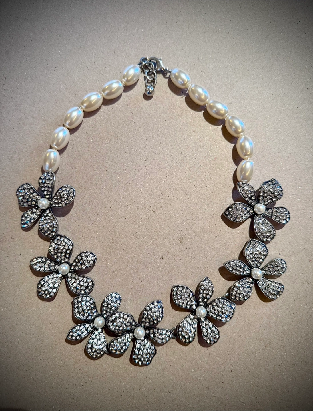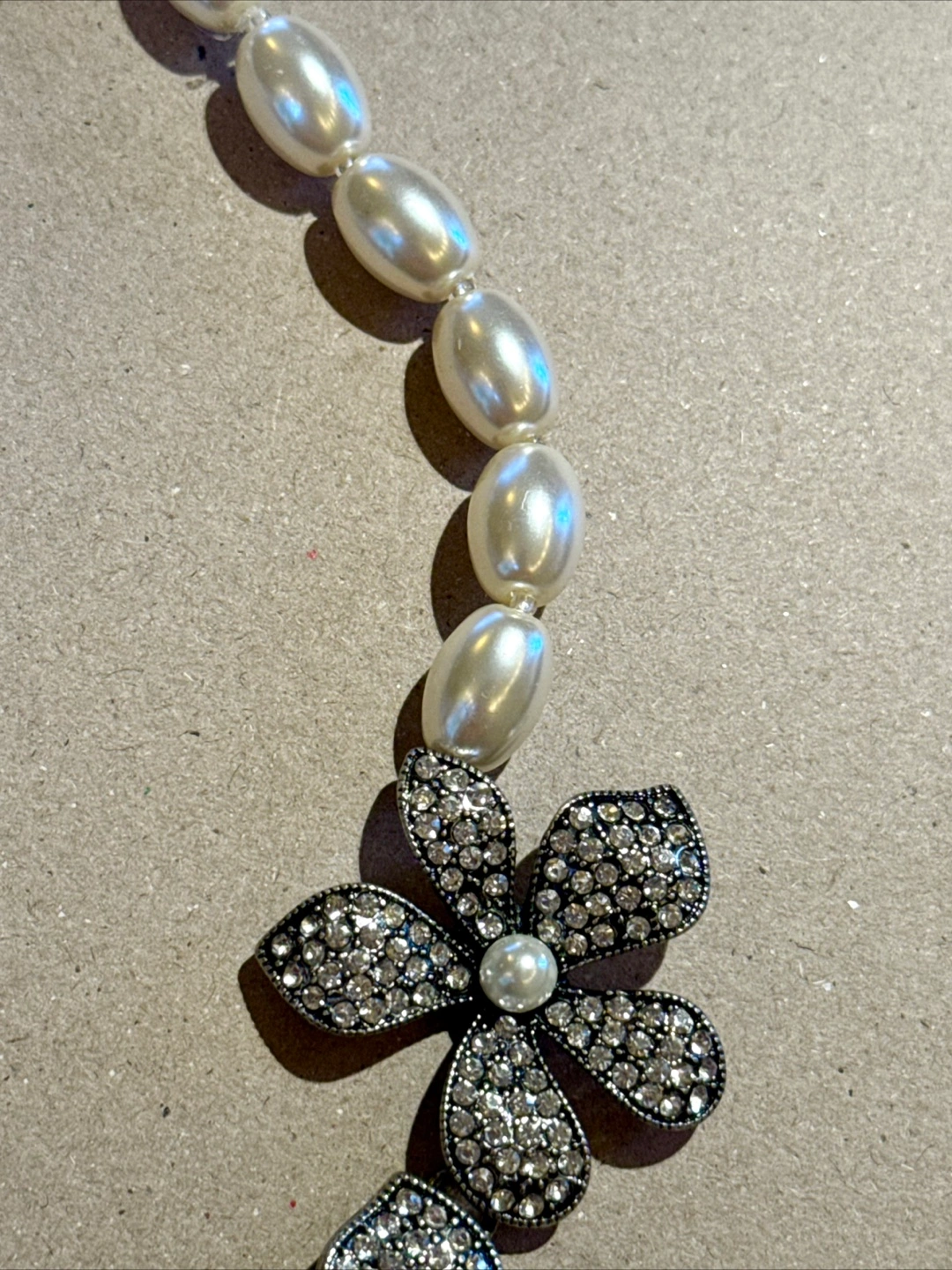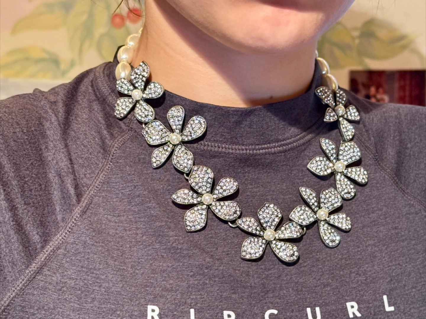 This gorgeous silver and pearl necklace features 7 Swarovski-inlay flower accents. The beautifully designed flower pendants are connected in a row. There’s a pearl in the middle of each flower, which creates cohesion with the pearl strands that continue to the clasp at the back. It would look great paired with a simple outfit for a touch of elegance and flair, or a monochrome dress for an evening out.