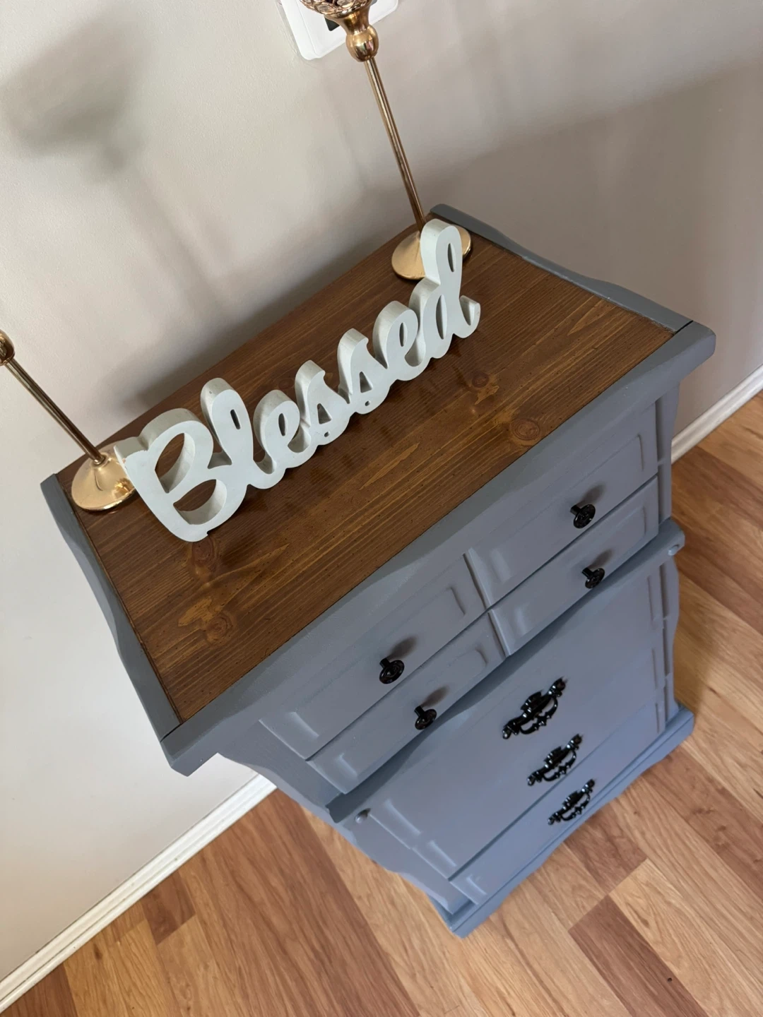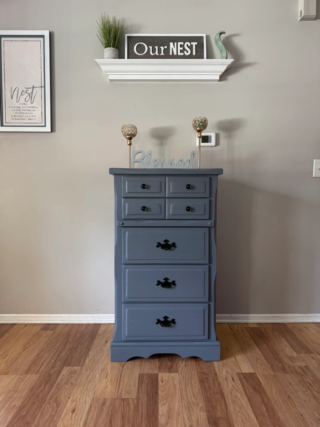 137✨Beautiful gray (can look bluish in bright light) solid refinished dresser, Harris of Pendleton furniture 💪🏼, all 5 drawers pull out fine on tracks, black hardware, Brown original topping ,solid piece💪🏼, Clean & sturdy! This is NOT that cheap wayfair/Ikea furniture, this will last you FOREVERR, I sell good quality furniture & my prices are still better/cheaper than a furniture store. Please don’t ask to lower my price‼️ Measurements; 43 inches tall 25 inches wide 17 inches deep FAST & EASY DRIVEWAY PICKUP IN LOCKPORT✅ BRING HELP IF YOU HAVE IT💪🏼OR WE CAN ASSIST HELP‼️ CASH ONLY‼️ BRING EXACT CHANGE PLEASE OR $60 DEPOSIT WITH ZELLE & ITS COMPLETELY YOURS‼️ (DECOR NOT INCLUDED)‼️ CHECKOUT MY OTHER LISTINGS 😁 ✨Feel free to follow me for more upcoming furniture & I definitely appreciate you for following me! 🤝✨