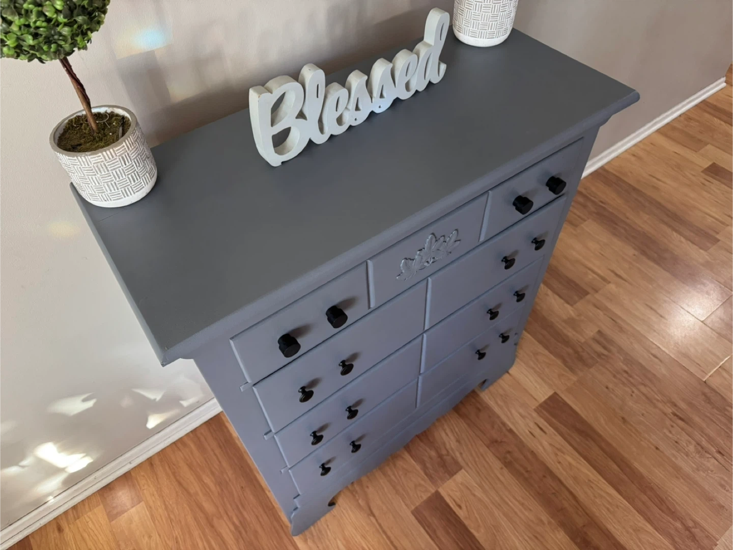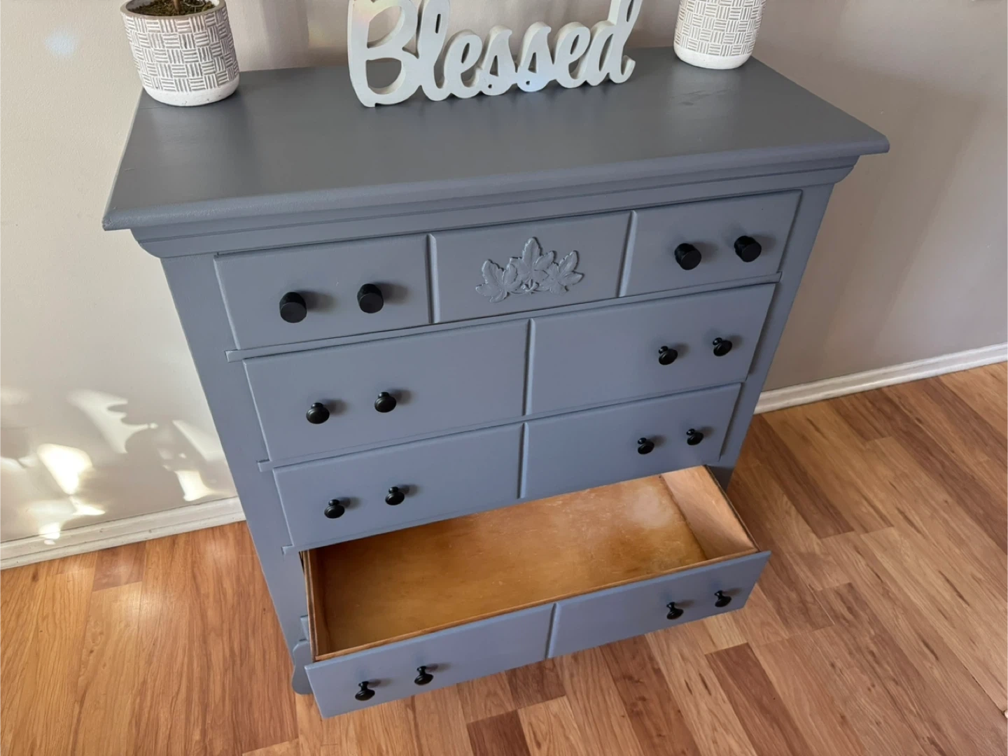 Press “See more” to read full description‼️ ✨Beautiful gray (can look bluish in bright light) solid refinished older dresser/Chest of drawers, Krest Colonial furniture💪🏼, all 4 drawers pull out fine on tracks, black hardware, solid piece💪🏼, Clean & sturdy! This is NOT that cheap wayfair/Ikea furniture, this will last you FOREVERR, I sell good quality furniture & my prices are still better/cheaper than a furniture store. Please don’t ask to lower my price‼️ Measurements; 42 inches tall 37 inches wide 16 inches deep FAST & EASY DRIVEWAY PICKUP IN LOCKPORT✅ BRING HELP IF YOU HAVE IT💪🏼OR WE CAN ASSIST HELP‼️aDELIVERY AVAILABLE🚚, $60 DEPOSIT REQUIRED‼️ CASH ONLY‼️ BRING EXACT CHANGE PLEASE OR $50 DEPOSIT WITH ZELLE & ITS COMPLETELY YOURS‼️ (DECOR NOT INCLUDED)‼️ CHECKOUT MY OTHER LISTINGS 😁 ✨Feel free to follow me for more upcoming furniture & I definitely appreciate you for following me! 🤝✨