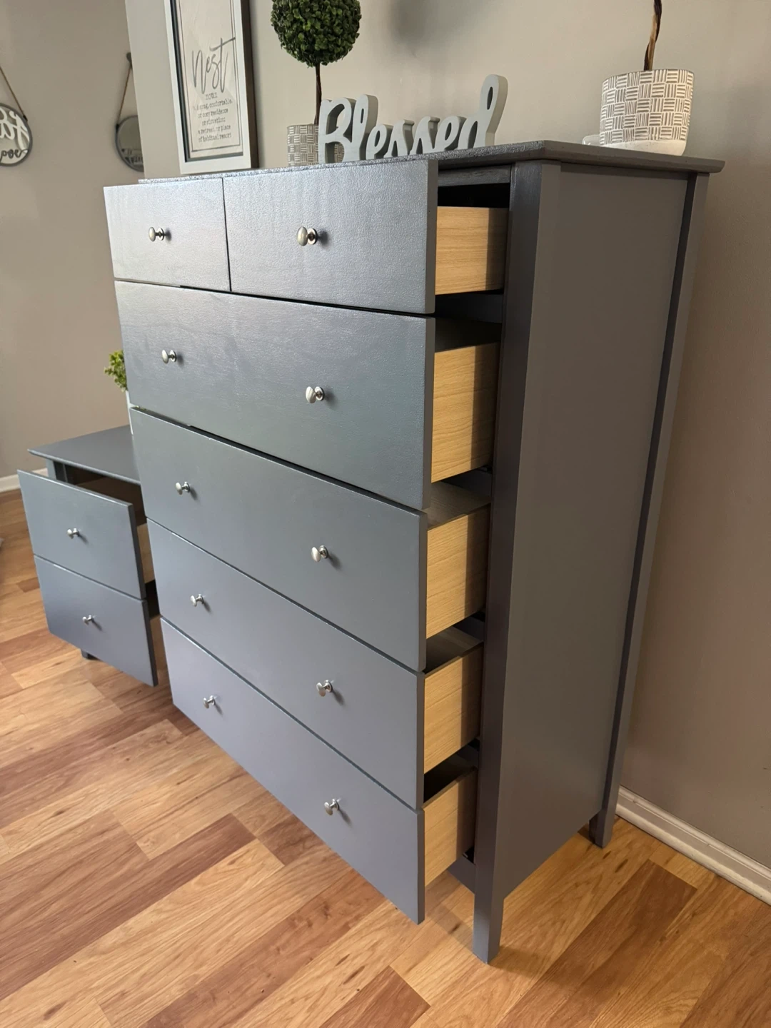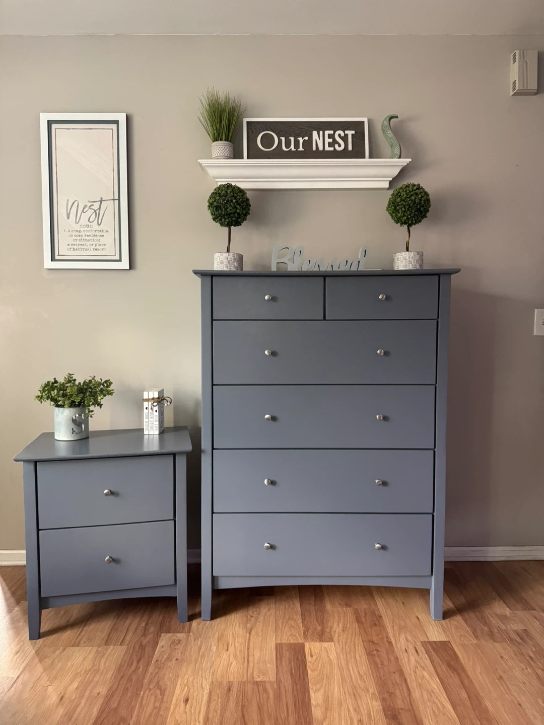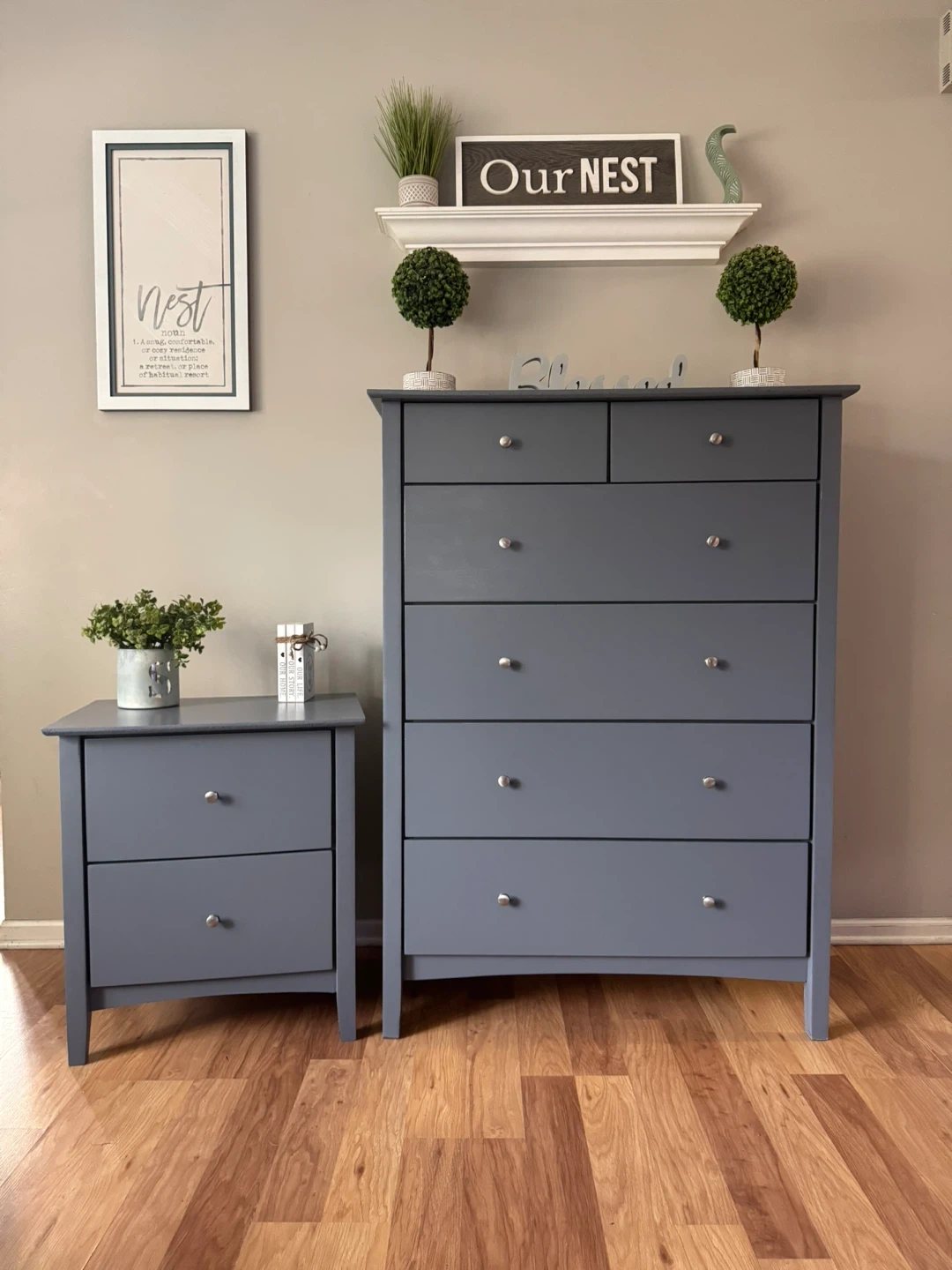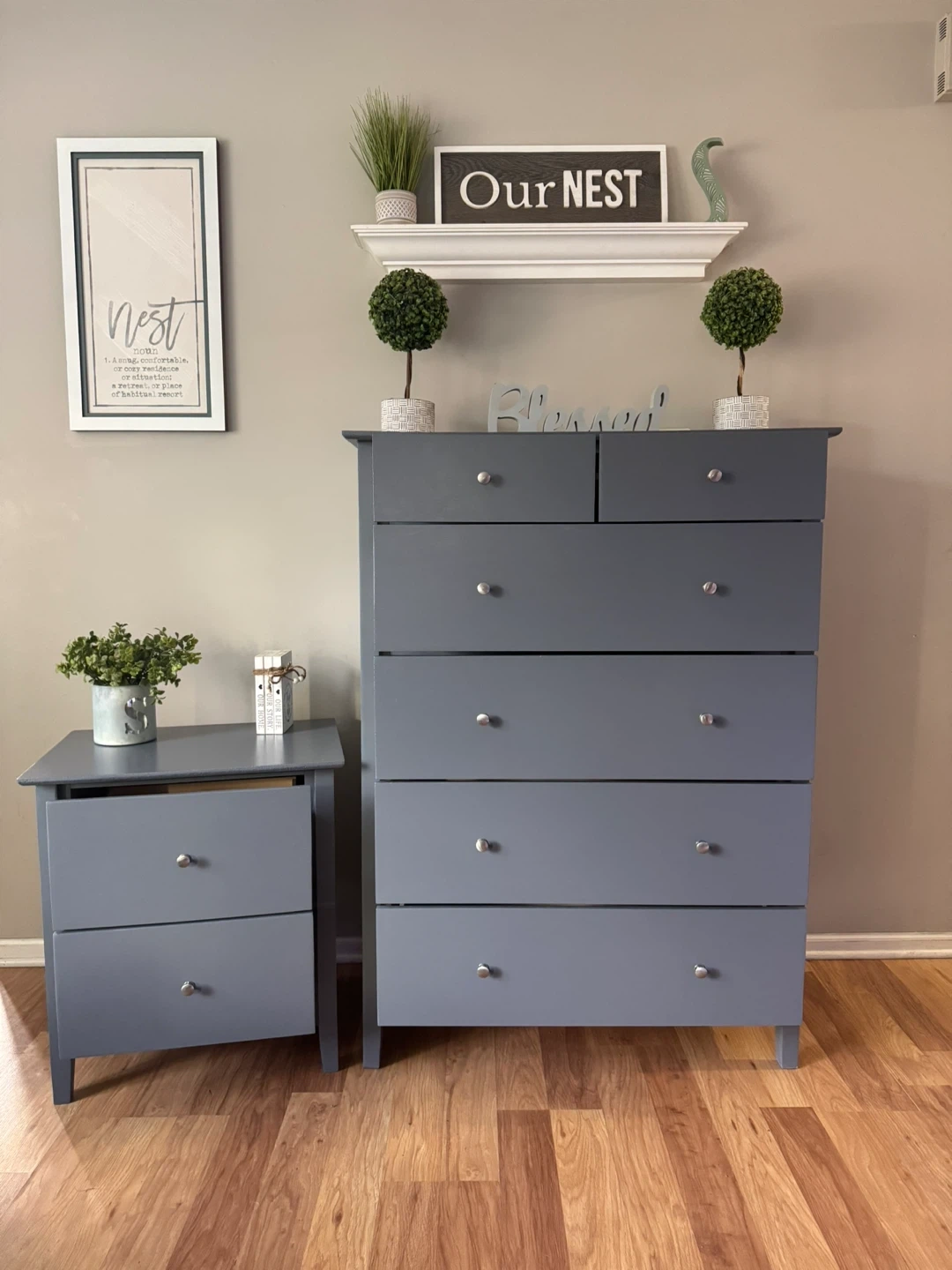 137Press “See more” to read full description‼️ ✨Beautiful gray (can look bluish in bright light) solid refinished dresser & nightstand 💪🏼, all 8 drawers pull out fine on tracks, silver hardware, solid pieces💪🏼, Clean & sturdy! This is NOT that cheap wayfair/Ikea furniture, this will last you FOREVERR, I sell good quality furniture & my prices are still better/cheaper than a furniture store. Please don’t ask to lower my price‼️ Dresser Measurements; 52 inches tall 38 inches wide 18 inches deep Nightstand Measurements; 26 inches tall 24 inches wide 18 inches deep FAST & EASY DRIVEWAY PICKUP IN LOCKPORT✅ BRING HELP IF YOU HAVE IT💪🏼OR WE CAN ASSIST HELP‼️DELIVERY AVAILABLE🚚, $60 DEPOSIT REQUIRED‼️ CASH ONLY‼️ BRING EXACT CHANGE PLEASE OR $50 DEPOSIT WITH ZELLE & ITS COMPLETELY YOURS‼️ (DECOR NOT INCLUDED)‼️ CHECKOUT MY OTHER LISTINGS 😁 ✨Feel free to follow me for more upcoming furniture & I definitely appreciate you for following me! 🤝✨