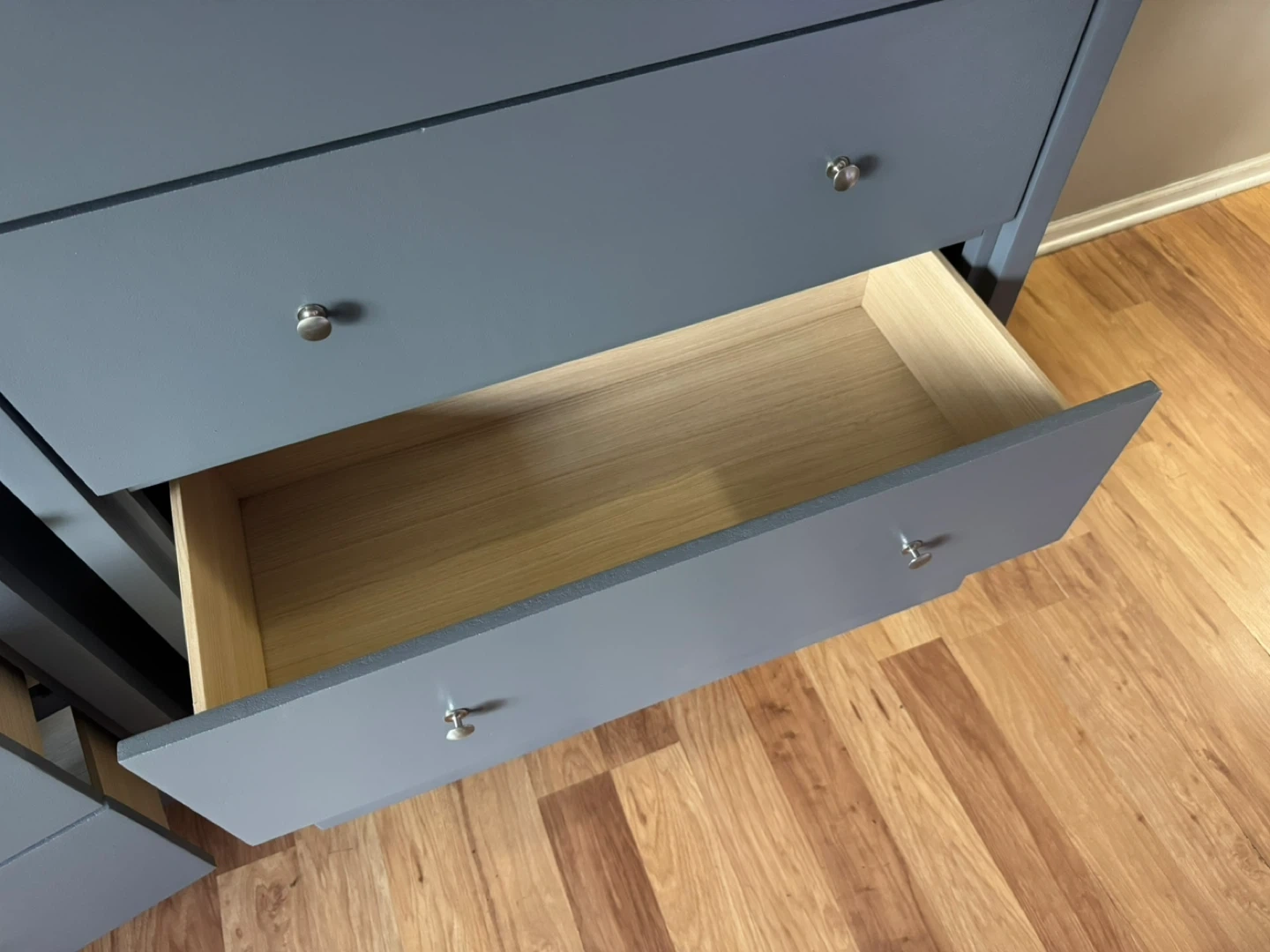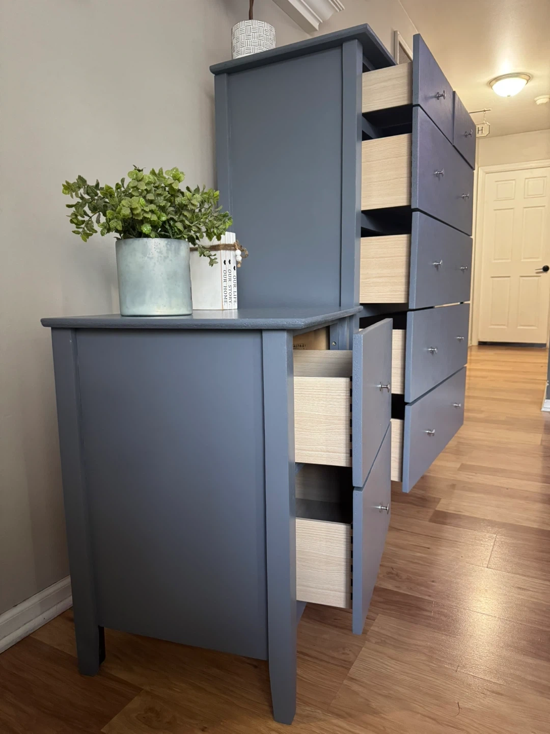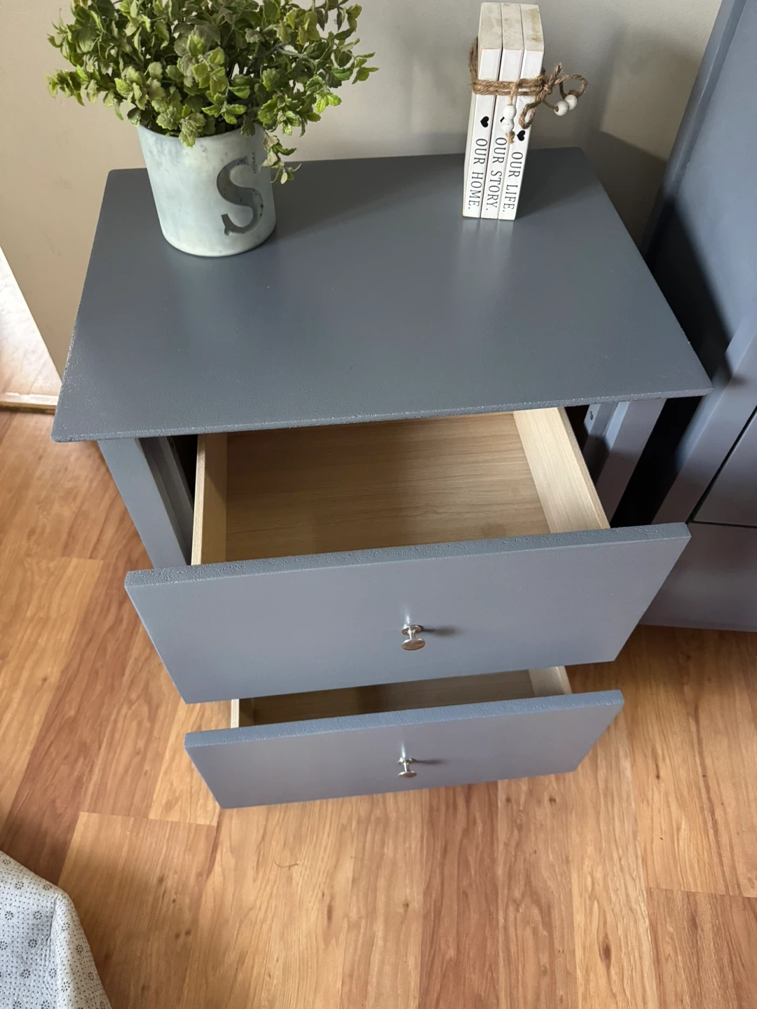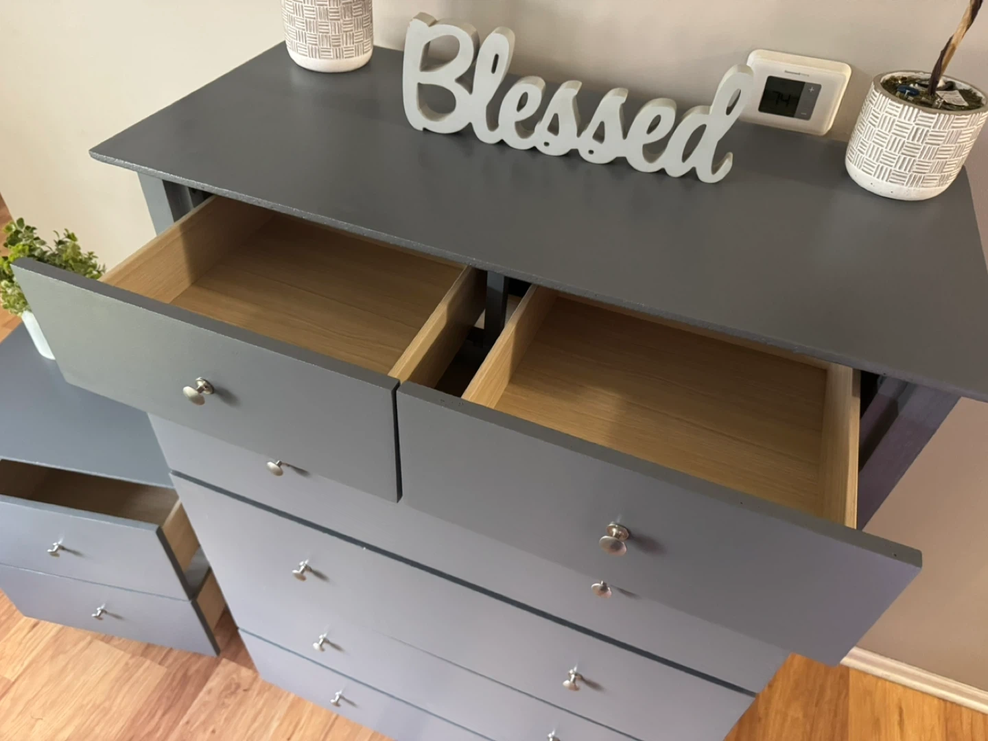 137Press “See more” to read full description‼️ ✨Beautiful gray (can look bluish in bright light) solid refinished dresser & nightstand 💪🏼, all 8 drawers pull out fine on tracks, silver hardware, solid pieces💪🏼, Clean & sturdy! This is NOT that cheap wayfair/Ikea furniture, this will last you FOREVERR, I sell good quality furniture & my prices are still better/cheaper than a furniture store. Please don’t ask to lower my price‼️ Dresser Measurements; 52 inches tall 38 inches wide 18 inches deep Nightstand Measurements; 26 inches tall 24 inches wide 18 inches deep FAST & EASY DRIVEWAY PICKUP IN LOCKPORT✅ BRING HELP IF YOU HAVE IT💪🏼OR WE CAN ASSIST HELP‼️DELIVERY AVAILABLE🚚, $60 DEPOSIT REQUIRED‼️ CASH ONLY‼️ BRING EXACT CHANGE PLEASE OR $50 DEPOSIT WITH ZELLE & ITS COMPLETELY YOURS‼️ (DECOR NOT INCLUDED)‼️ CHECKOUT MY OTHER LISTINGS 😁 ✨Feel free to follow me for more upcoming furniture & I definitely appreciate you for following me! 🤝✨