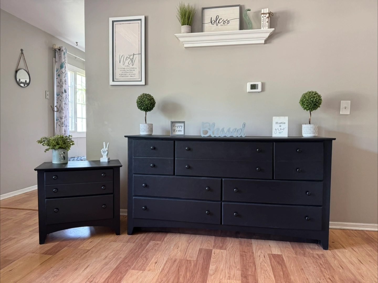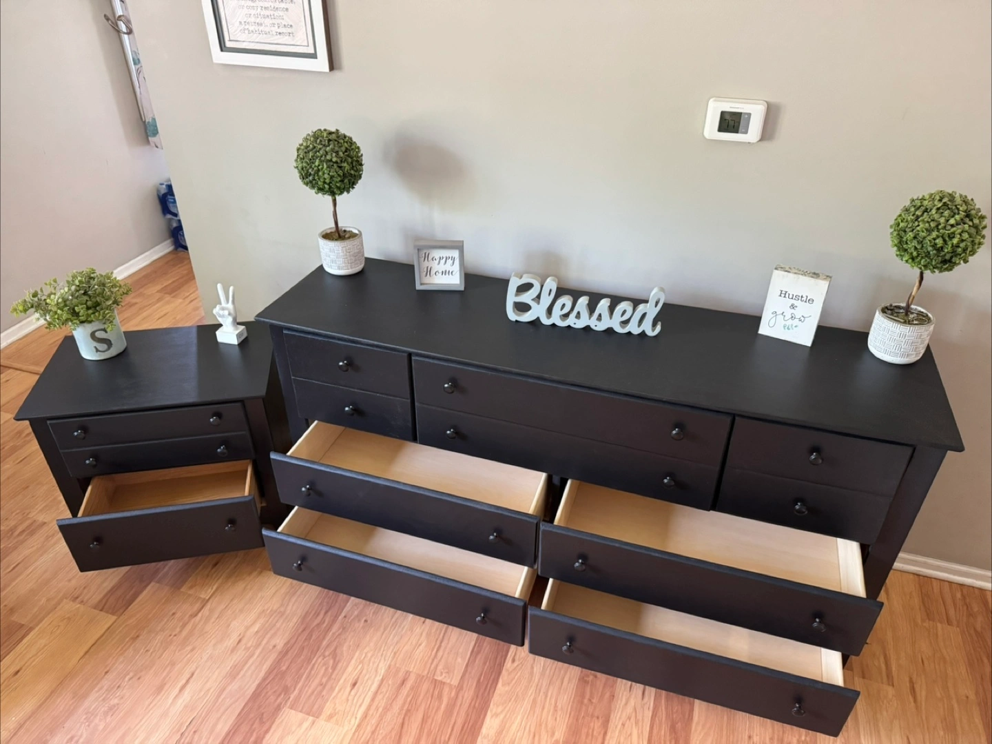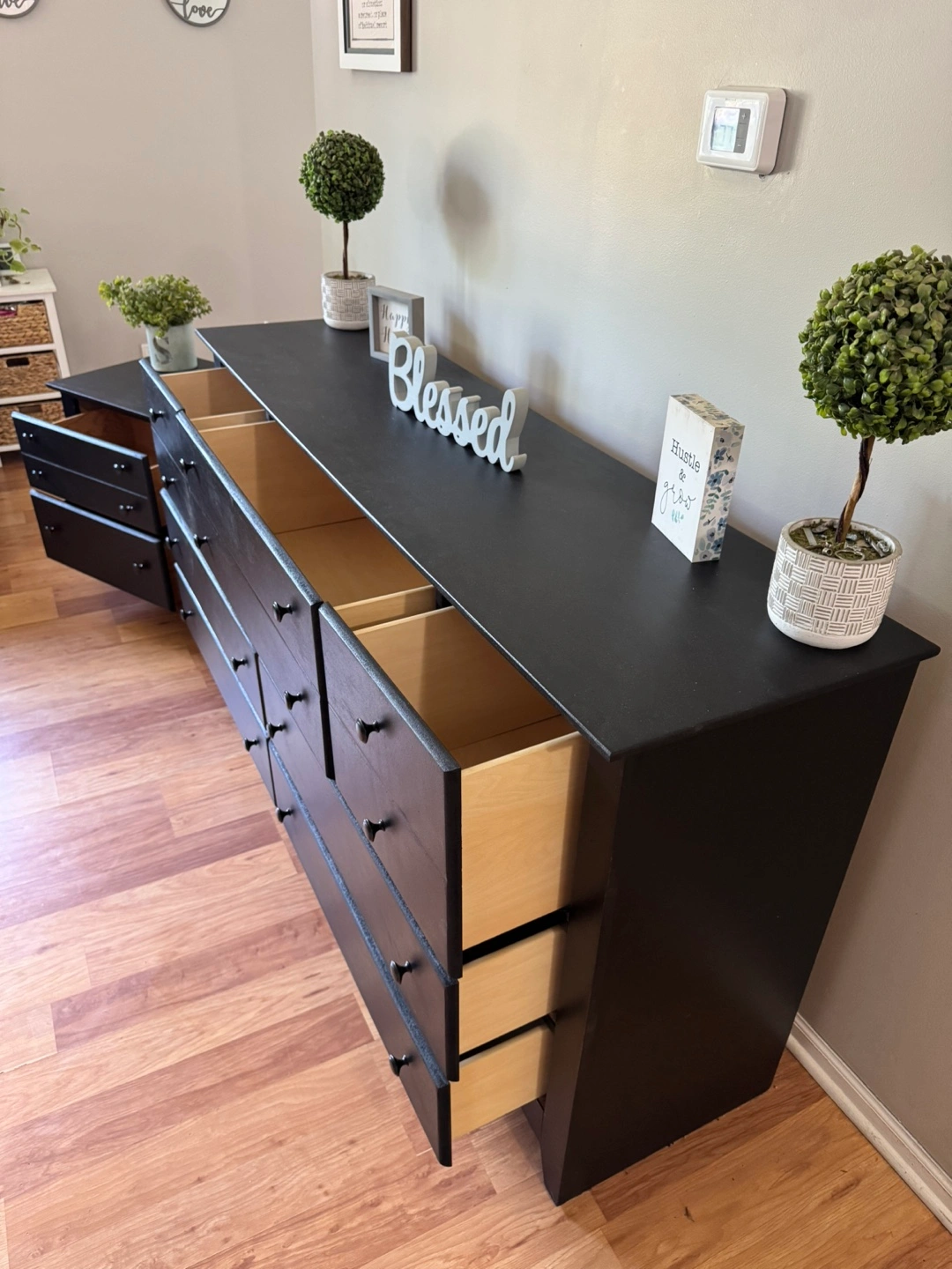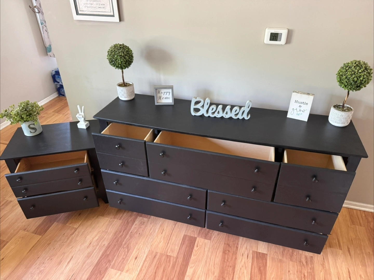 137Press “See more” to read full description‼️ ✨Beautiful black solid refinished dresser/ black hardware, Progressive furniture, all 9 drawers pull out fine on tracks, the top 3 drawers are DEEP, solid pieces, 💪🏼, Clean & sturdy! This is NOT that cheap wayfair/Ikea furniture, this will last you FOREVERR, I sell good quality furniture & my prices are still better/cheaper than a furniture store. Please don’t ask to lower my price‼️ Dresser Measurements; 34 inches tall 65 inches wide 17 inches deep Nightstand Measurements; 24 inches tall 26 inches wide 17 inches deep FAST & EASY DRIVEWAY PICKUP IN LOCKPORT✅ BRING HELP IF YOU HAVE IT💪🏼OR WE CAN ASSIST HELP AFTER 4P.M MON-FRI‼️DELIVERY AVAILABLE🚚, $50 DEPOSIT REQUIRED‼️ CASH ONLY‼️ BRING EXACT CHANGE PLEASE‼️$50 DEPOSIT WITH ZELLE & ITS COMPLETELY YOURS‼️ (DECOR NOT INCLUDED)‼️ CHECKOUT MY OTHER LISTINGS 😁 ✨Feel free to follow me for more upcoming furniture & I definitely appreciate you for following me! 🤝✨