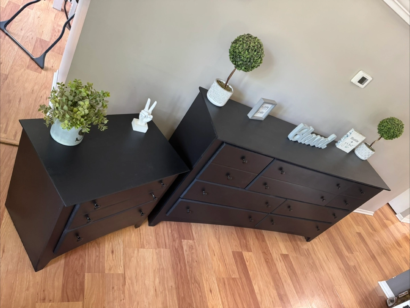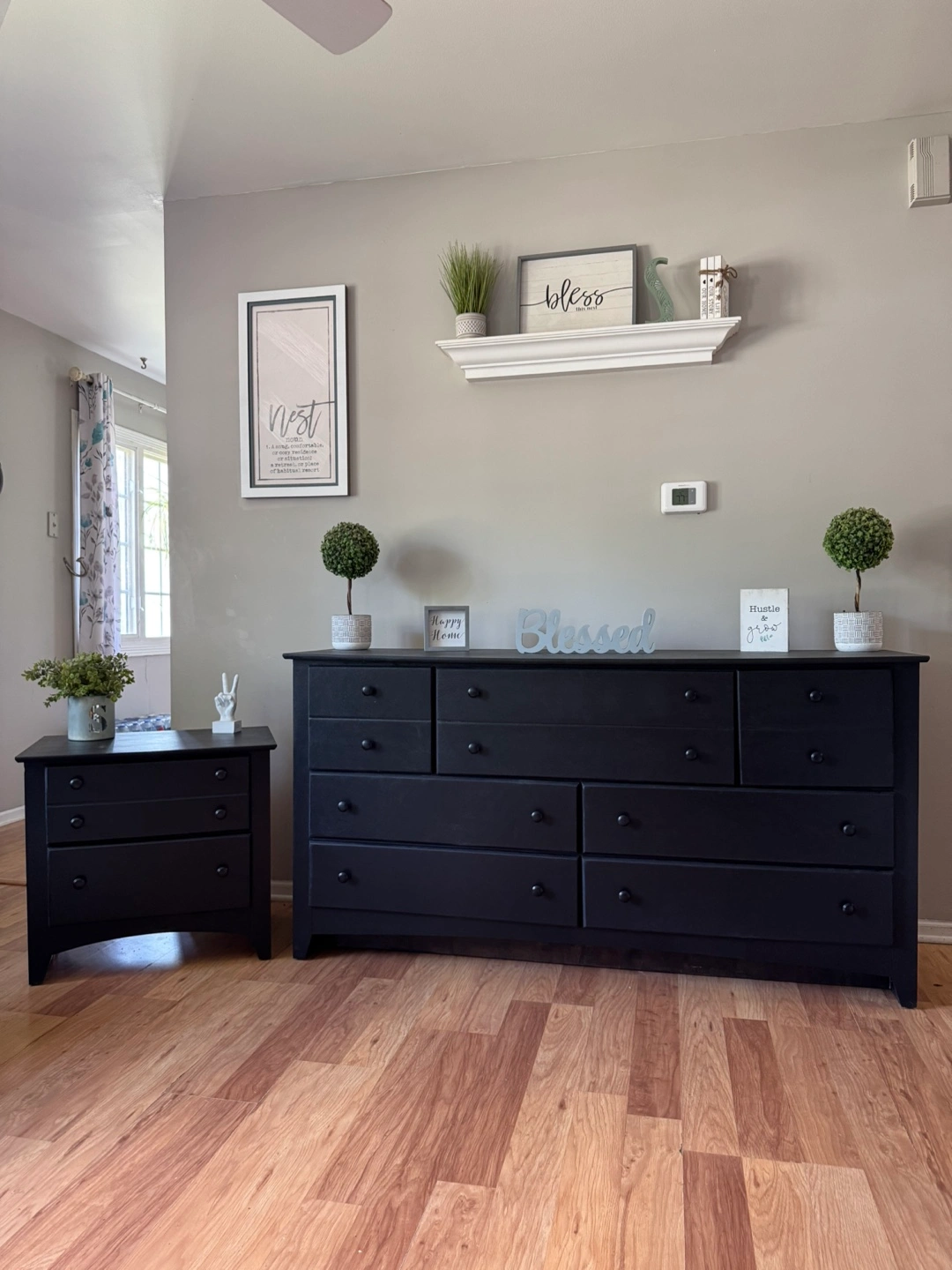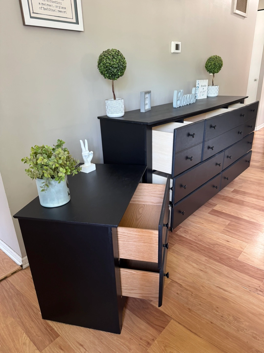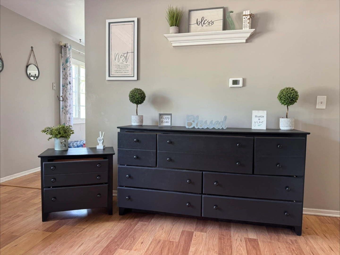 137Press “See more” to read full description‼️ ✨Beautiful black solid refinished dresser/ black hardware, Progressive furniture, all 9 drawers pull out fine on tracks, the top 3 drawers are DEEP, solid pieces, 💪🏼, Clean & sturdy! This is NOT that cheap wayfair/Ikea furniture, this will last you FOREVERR, I sell good quality furniture & my prices are still better/cheaper than a furniture store. Please don’t ask to lower my price‼️ Dresser Measurements; 34 inches tall 65 inches wide 17 inches deep Nightstand Measurements; 24 inches tall 26 inches wide 17 inches deep FAST & EASY DRIVEWAY PICKUP IN LOCKPORT✅ BRING HELP IF YOU HAVE IT💪🏼OR WE CAN ASSIST HELP AFTER 4P.M MON-FRI‼️DELIVERY AVAILABLE🚚, $50 DEPOSIT REQUIRED‼️ CASH ONLY‼️ BRING EXACT CHANGE PLEASE‼️$50 DEPOSIT WITH ZELLE & ITS COMPLETELY YOURS‼️ (DECOR NOT INCLUDED)‼️ CHECKOUT MY OTHER LISTINGS 😁 ✨Feel free to follow me for more upcoming furniture & I definitely appreciate you for following me! 🤝✨