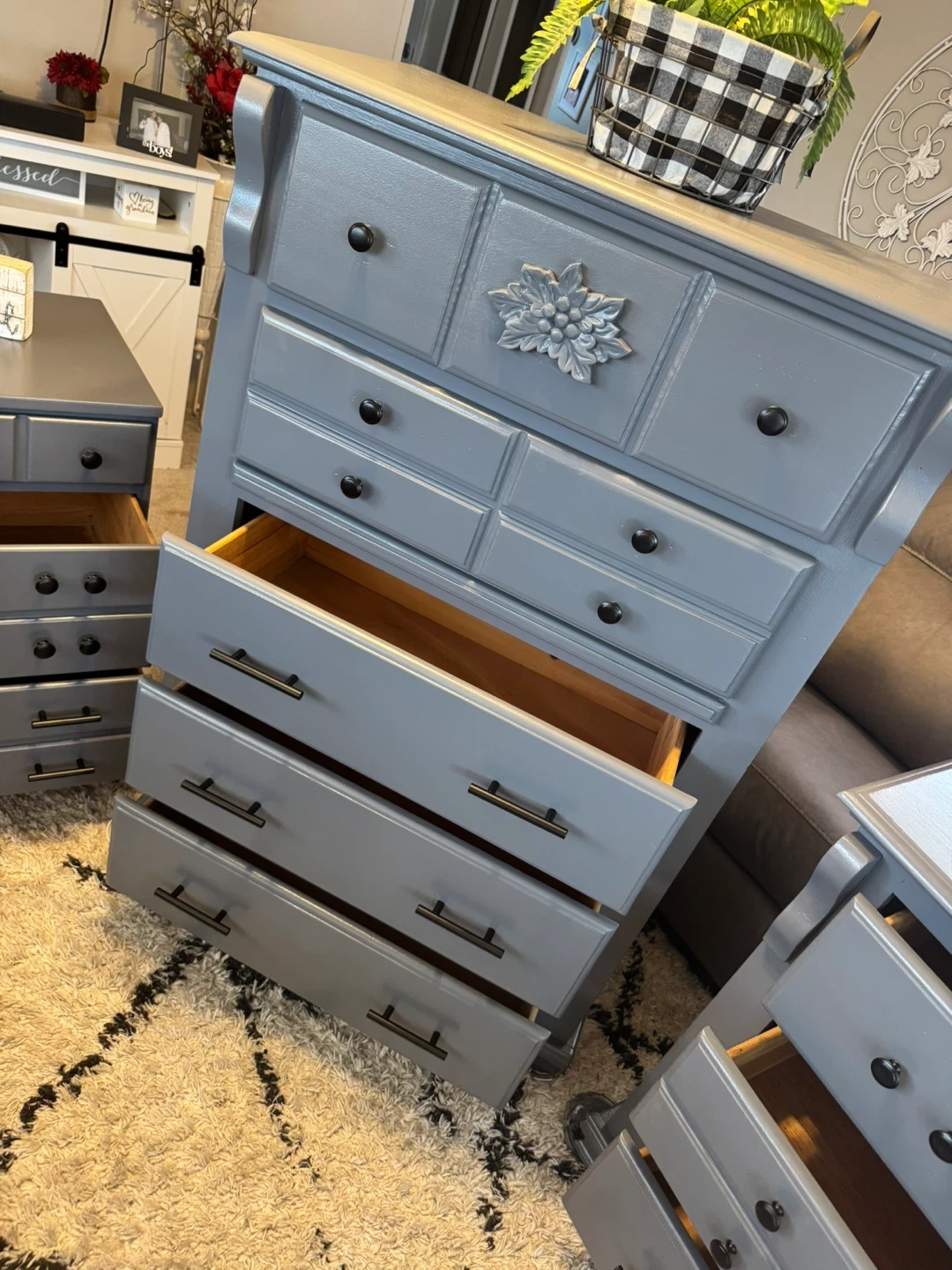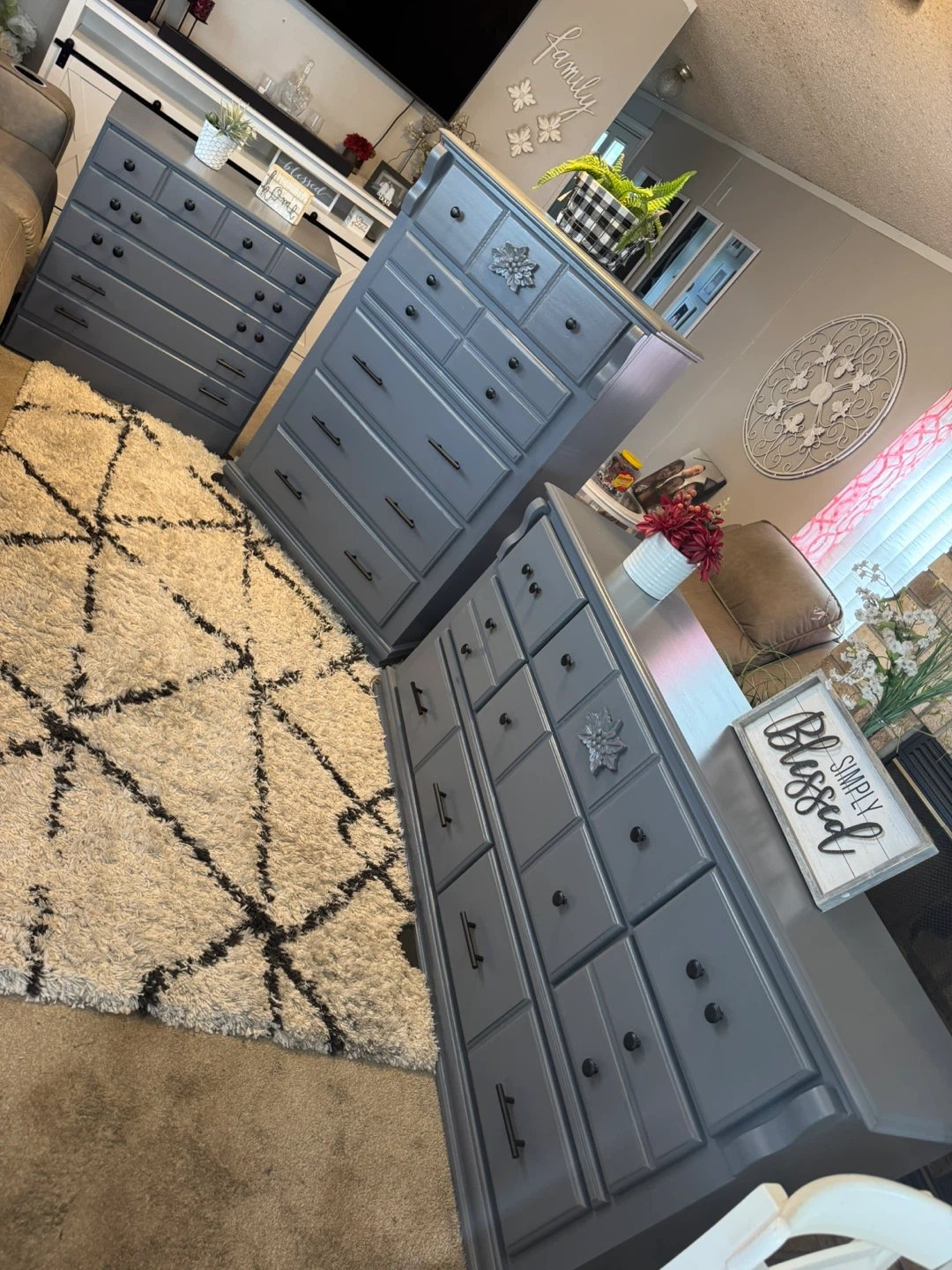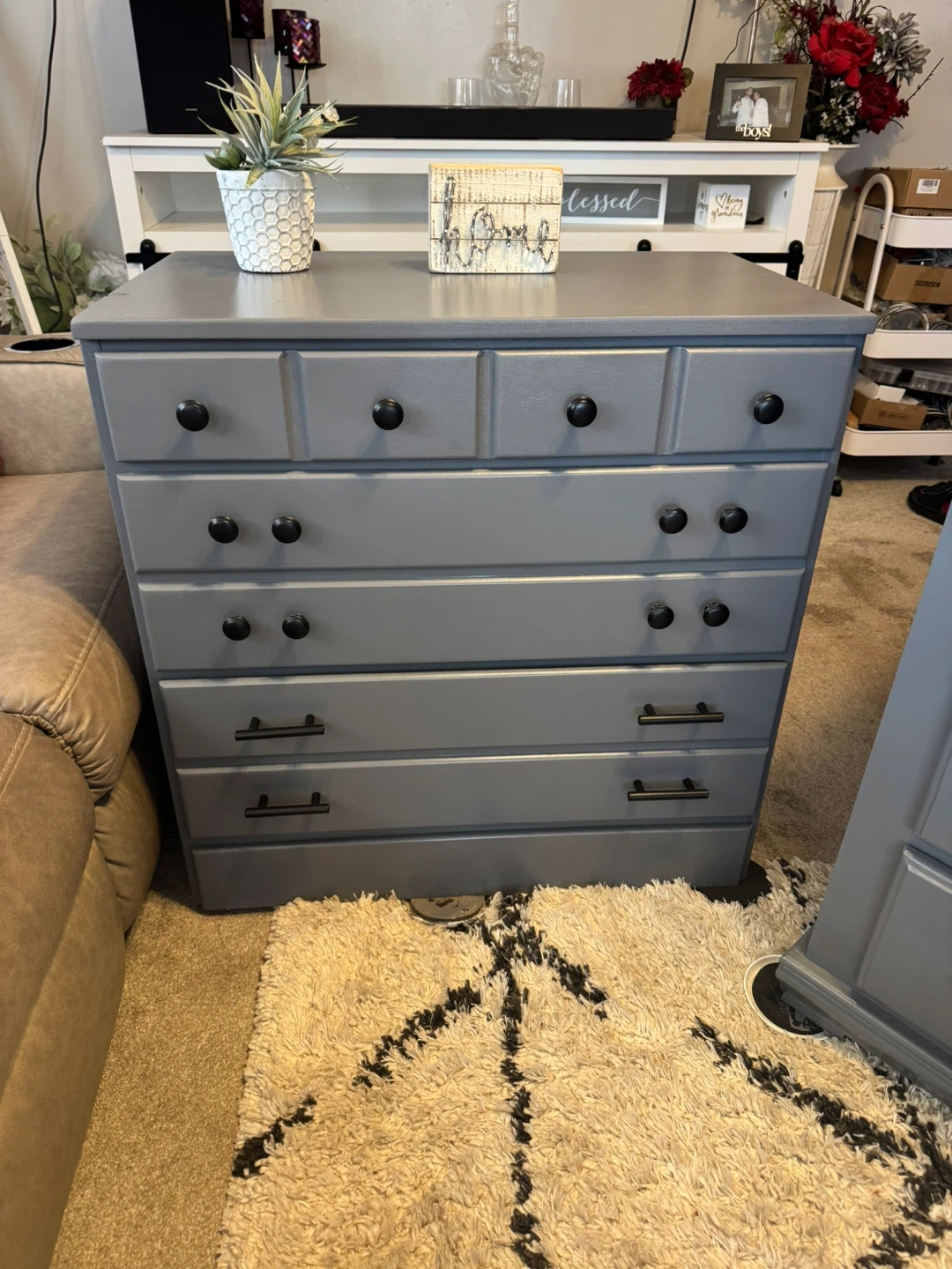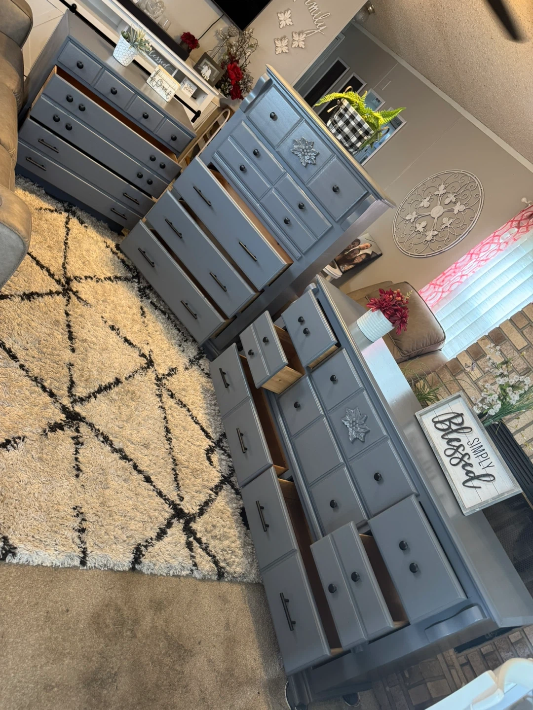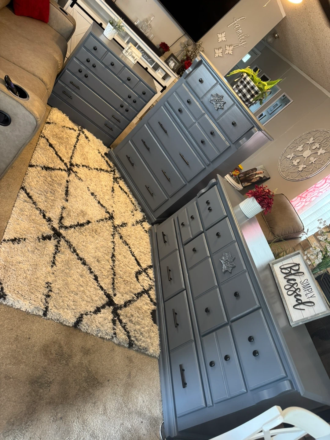 MEASUREMENTS BELOW ⬇️ ✨✨GORGEOUS GRAY REFINISHED SOLID WOOD BEDROOM SET✨✨ PINE WOOD.. ALL NEW BLACK HANDLES AND NEW BLACK KNOBS. HEAVY AND SOLID.. 3pc SET.. DRAWERS ARE CLEAN AND ON TRACK.. LONG DRESSER HAS 8 DRAWERS, TALL DRESSER HAS 5 GOOD SIZE DRAWERS AND NIGHTSTAND HAS 3 DRAWERS WITH THE TOP DRAWER BEING THINNER THAN THE OTHER TWO.. DEEP DRAWERS ON BOTTOM.. BEAUTIFUL SET! IF POSTED ITS AVAILABLE.. PLEASE BRING HELP IF YOU HAVE IT.. NO HOLDS WITHOUT SMALL DEPOSIT ( 1 day hold ) FIRST COME FIRST SERVE.. PICK UP IN JUSTICE IL BY 79th ROBERTS RD. CASH ONLY ON ARRIVAL.. IM WAY CHEAPER THAN A FURNITURE STORE AND I DO ONLY SOLID WOOD PIECES NOT CHEAP WOOD THAT FALLS APART! Thanks MEASUREMENTS: TALL DRESSER 51.5” tall 35” wide 17” deep LONG DRESSER 33” tall 64” wide 17” deep NIGHTSTAND 30.5” tall 30” wide 18” deep Thanks for looking 👀