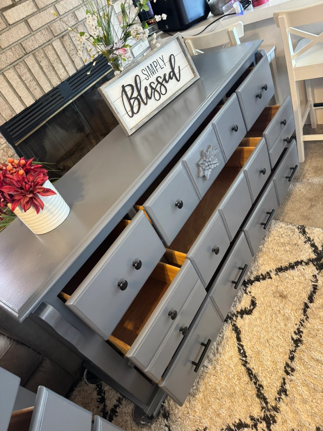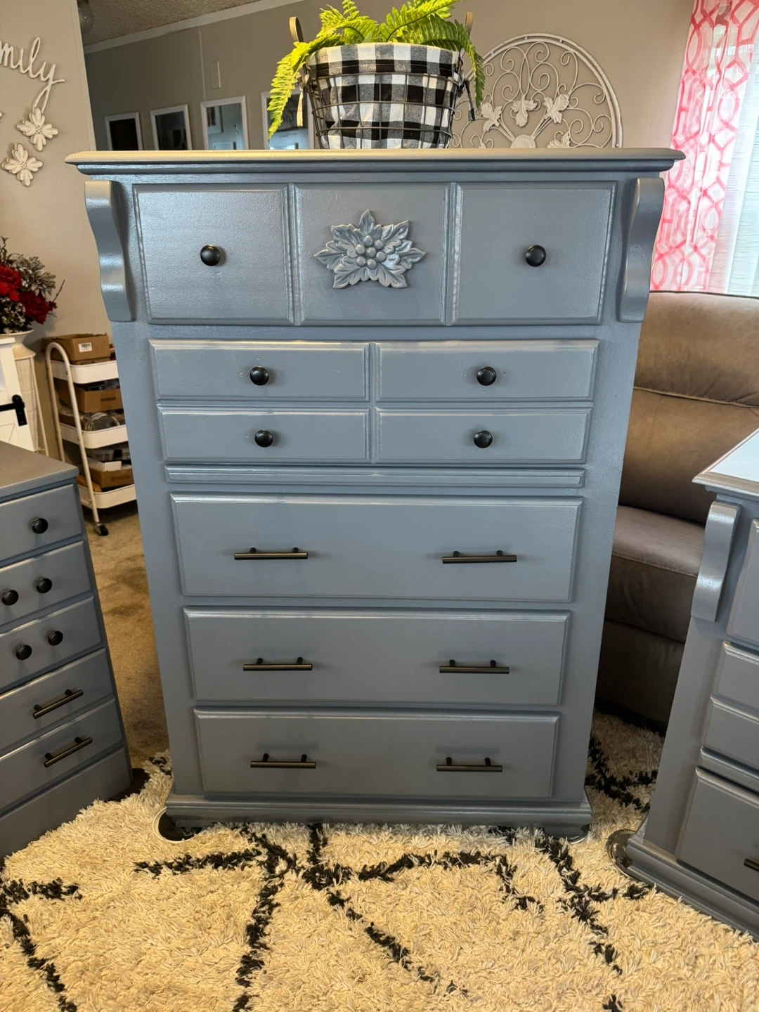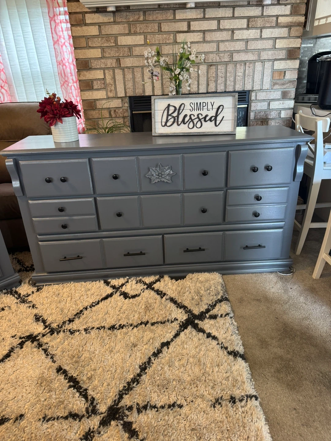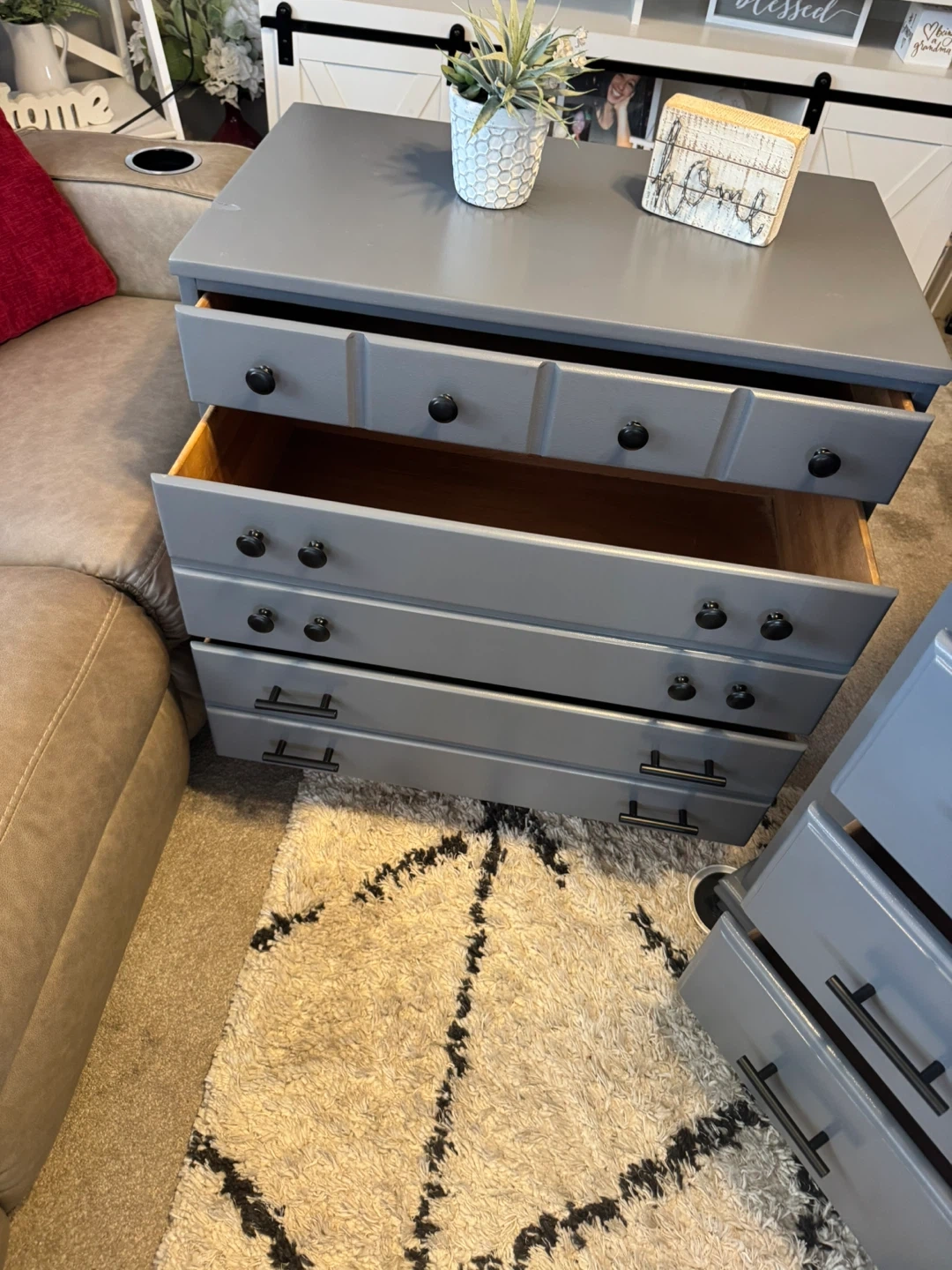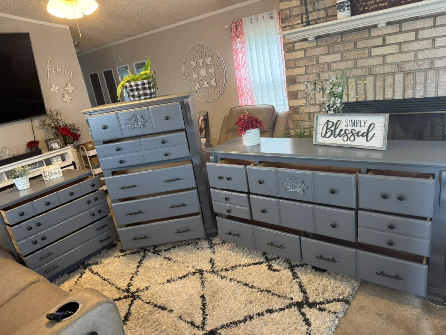 MEASUREMENTS BELOW ⬇️ ✨✨GORGEOUS GRAY REFINISHED SOLID WOOD BEDROOM SET✨✨ PINE WOOD.. ALL NEW BLACK HANDLES AND NEW BLACK KNOBS. HEAVY AND SOLID.. 3pc SET.. DRAWERS ARE CLEAN AND ON TRACK.. LONG DRESSER HAS 8 DRAWERS, TALL DRESSER HAS 5 GOOD SIZE DRAWERS AND NIGHTSTAND HAS 3 DRAWERS WITH THE TOP DRAWER BEING THINNER THAN THE OTHER TWO.. DEEP DRAWERS ON BOTTOM.. BEAUTIFUL SET! IF POSTED ITS AVAILABLE.. PLEASE BRING HELP IF YOU HAVE IT.. NO HOLDS WITHOUT SMALL DEPOSIT ( 1 day hold ) FIRST COME FIRST SERVE.. PICK UP IN JUSTICE IL BY 79th ROBERTS RD. CASH ONLY ON ARRIVAL.. IM WAY CHEAPER THAN A FURNITURE STORE AND I DO ONLY SOLID WOOD PIECES NOT CHEAP WOOD THAT FALLS APART! Thanks MEASUREMENTS: TALL DRESSER 51.5” tall 35” wide 17” deep LONG DRESSER 33” tall 64” wide 17” deep NIGHTSTAND 30.5” tall 30” wide 18” deep Thanks for looking 👀