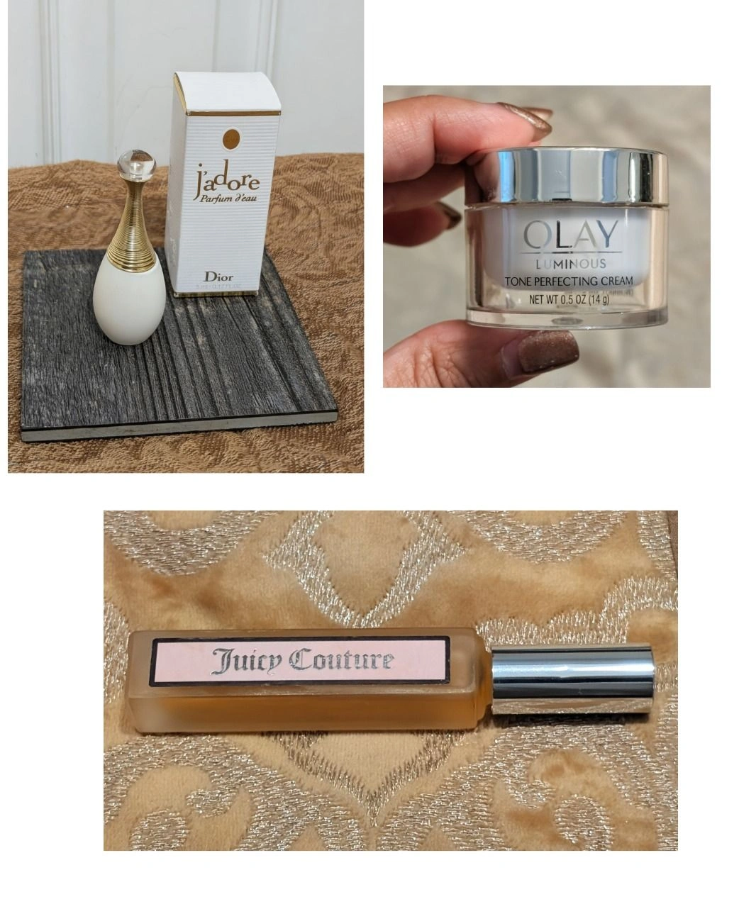 141Selling a great bundle of popular and high-end beauty items, perfect for testing new scents and products, or for travel! Everything shown in the photos is included. The Bundle Includes: Dior J'adore Parfum d'Eau (Deluxe Mini): This is a 5ml splash bottle (NOT a full size). Used only once or twice, with the original box. The iconic scent is a beautiful, alcohol-free blend of white florals.Dior mini comes with its original box. Batch Code: 3B01 Olay Luminous Tone Perfecting Cream: Travel/trial size jar (NET WT 0.5 OZ / 14g). Appears nearly full/lightly used. Great way to try this popular cream for evening skin tone and dark spots. Juicy Couture Perfume Rollerball: Standard rollerball size, looks to be mostly full. Perfect for keeping in your purse for quick touch-ups! Note: Selling all three items together as a bundle only. Great value for trying luxury and mass-market favorites! **Each item on my page is guaranteed authentic and carefully presented, with batch codes provided where possible. For safety and scheduling reasons, I do not offer in-store authentication. Please be advised that I'm currently only considering local, straightforward sales to buyers who are ready to purchase as listed.**