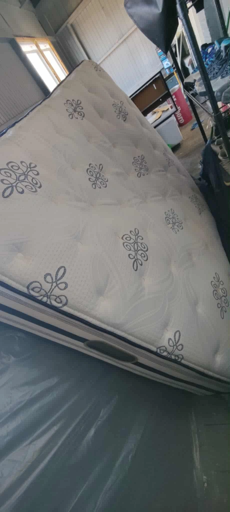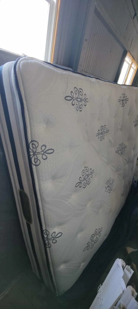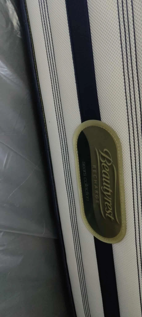 Selling a Beautyrest Recharge mattress! It's in good condition and ready for a new home. The mattress features a stylish design with a white and blue color scheme. Perfect for a comfortable night's sleep