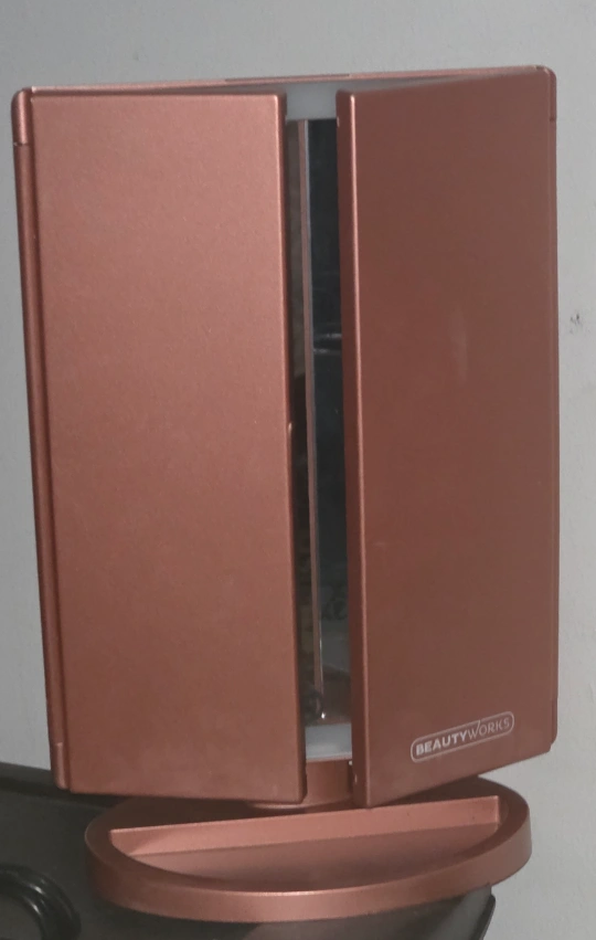 This BEAUTYWORKS trifold mirror is perfect for your makeup routine! It features adjustable lighting to help you get the perfect look. One side has 2x and 3x magnification for detailed work. It's in great condition (batteries not included)