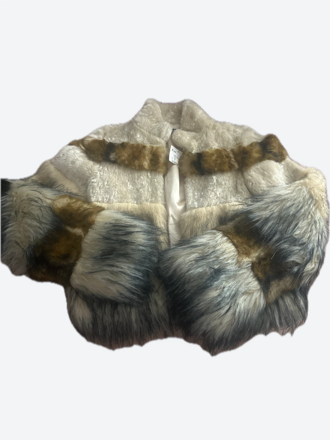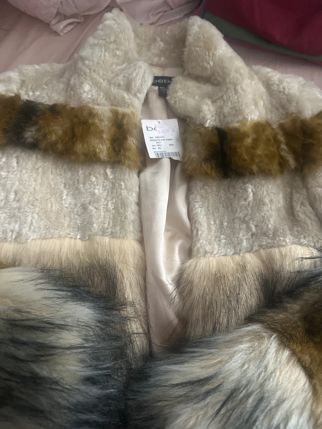 This is a bebe faux fur jacket with a unique design. It features a mix of cream, brown, and gray faux fur sections. The jacket appears to be in band new condition and ready to add some style to your wardrobe