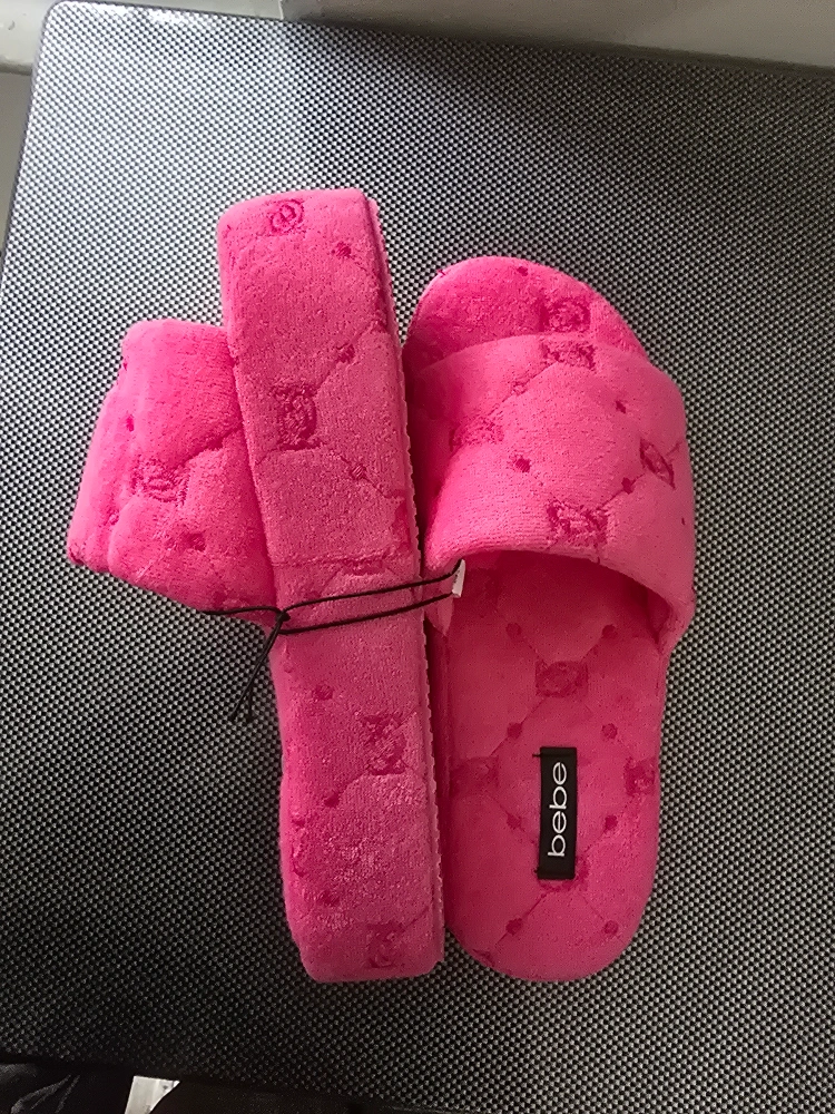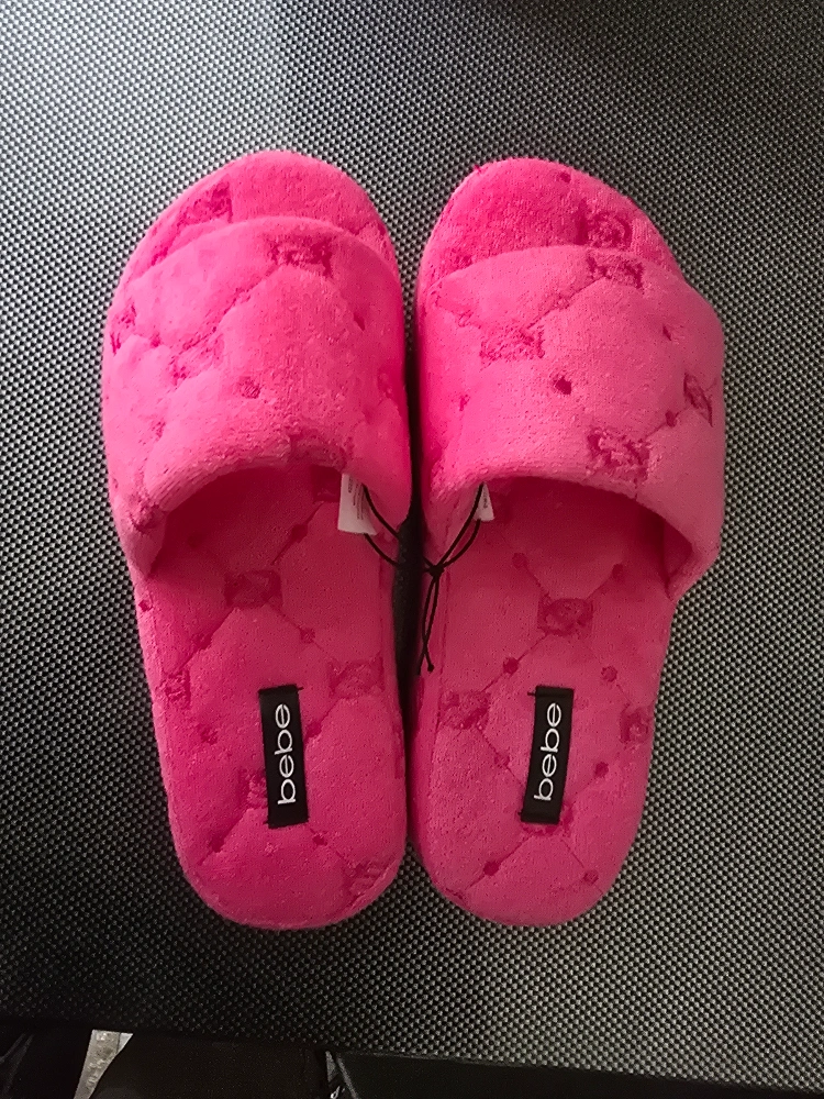 These are new bebe pink slippers with tags still attached! They are a super cute and comfy way to relax around the house. The slippers feature a stylish design and soft material, making them perfect for everyday wear