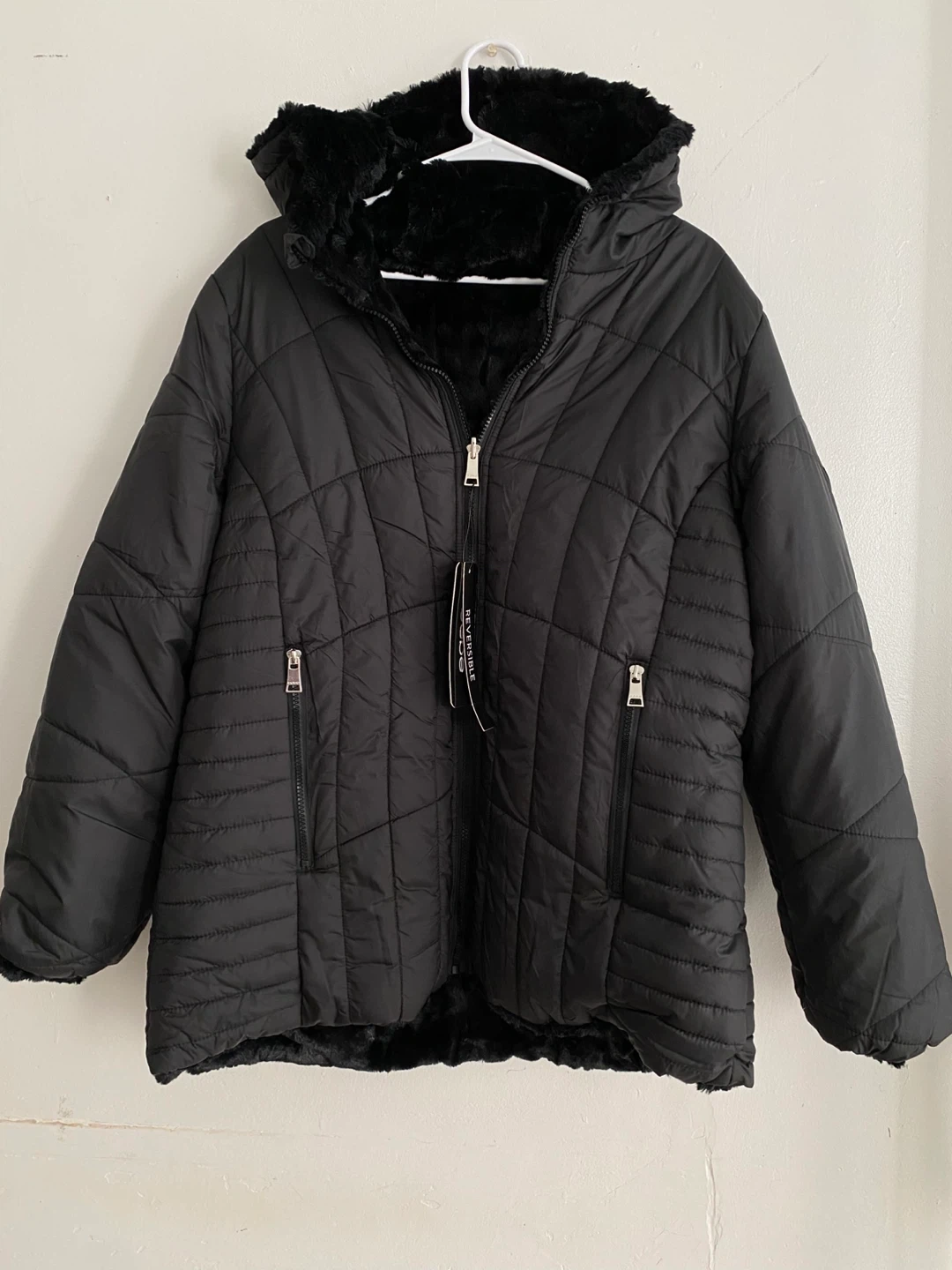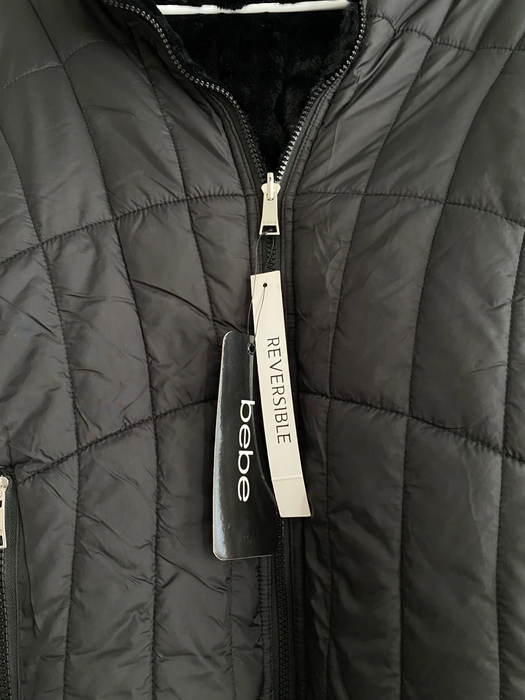 65Selling a bebe reversible puffer jacket in black. It features a stylish quilted design and a cozy faux fur lining, making it perfect for cold weather. The jacket is reversible, offering two different looks in one. It's in great condition and ready to keep you warm and fashionable