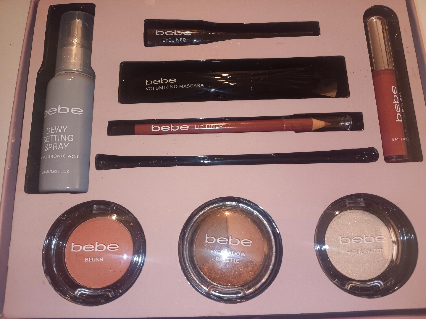 686Selling a Bebe ultimate makeup collection. It includes blush, highlighter, eyeshadow palette, dewy setting spray, eyeliner, volumizing mascara, lip liner and lip gloss. It's a versatile collection with long-lasting vibrant colors to effortlessly create endless looks!