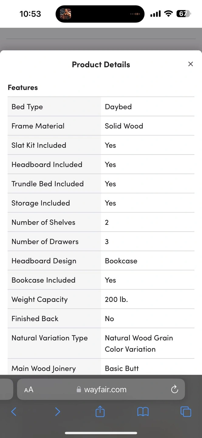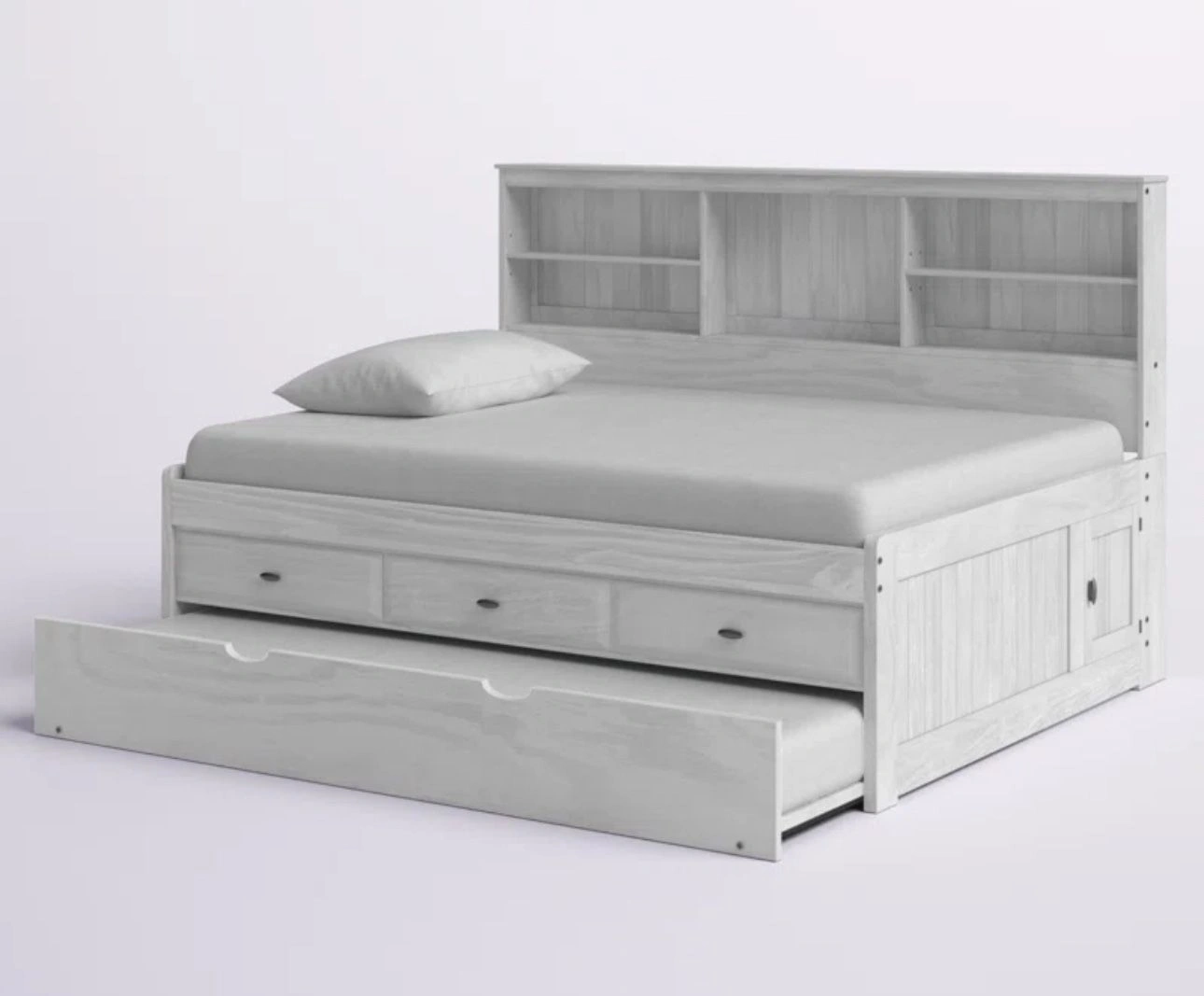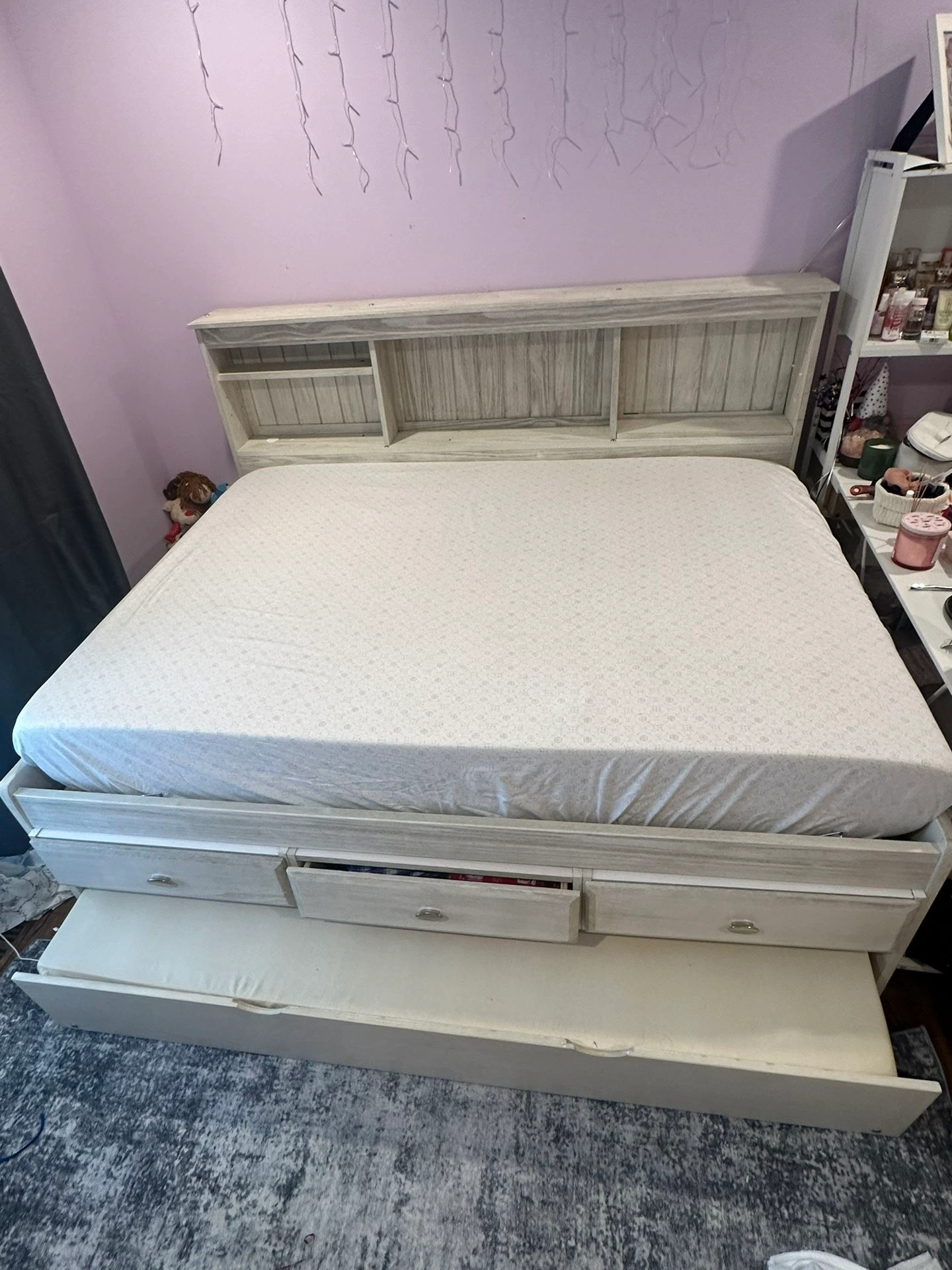 Stylish and functional daybed, perfect for kids, teens, or guest rooms! Features a pull-out trundle bed, built-in bookcase, and 3 spacious storage drawers. Solid wood, sturdy, and in immaculate condition. Originally purchased from Wayfair. Only selling because we’re moving. Bed will need to be disassembled for moving. Separately purchased a Wayfair Sleep™ 10” Medium Memory Foam Mattress (Full size) – clean, well-kept, and very comfortable you can have for $120