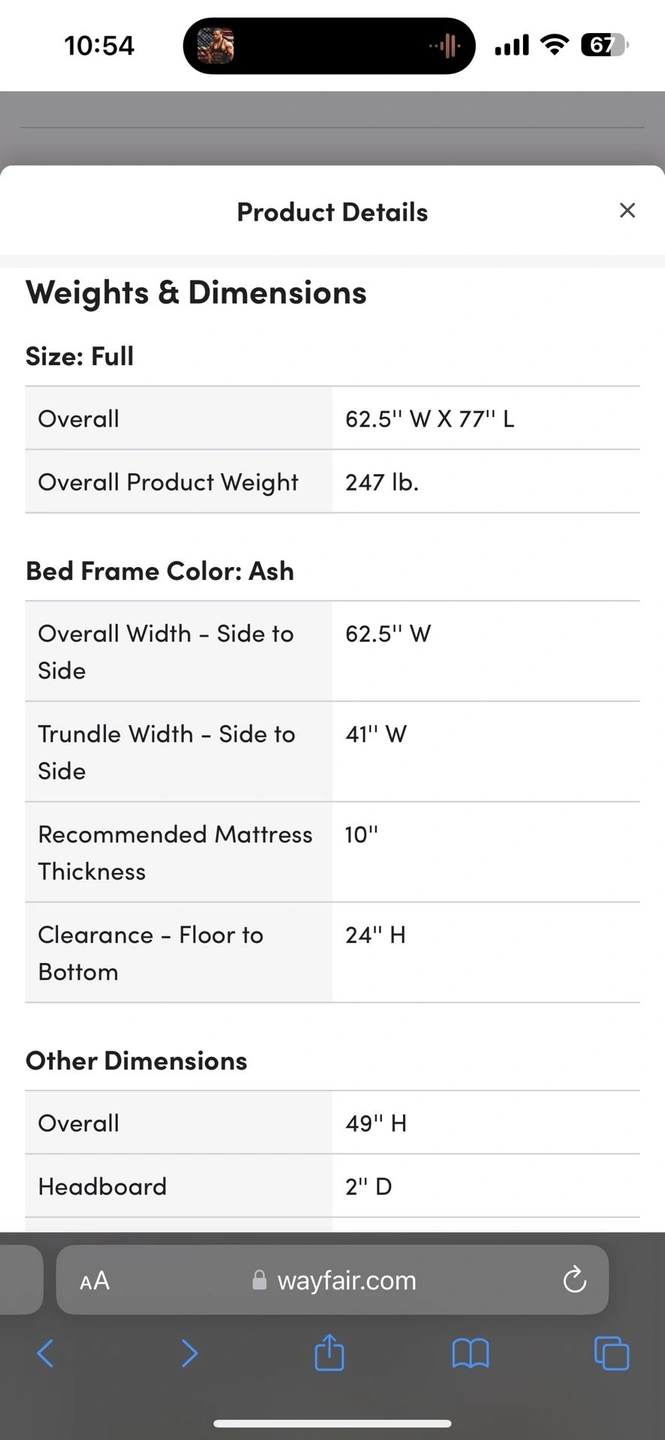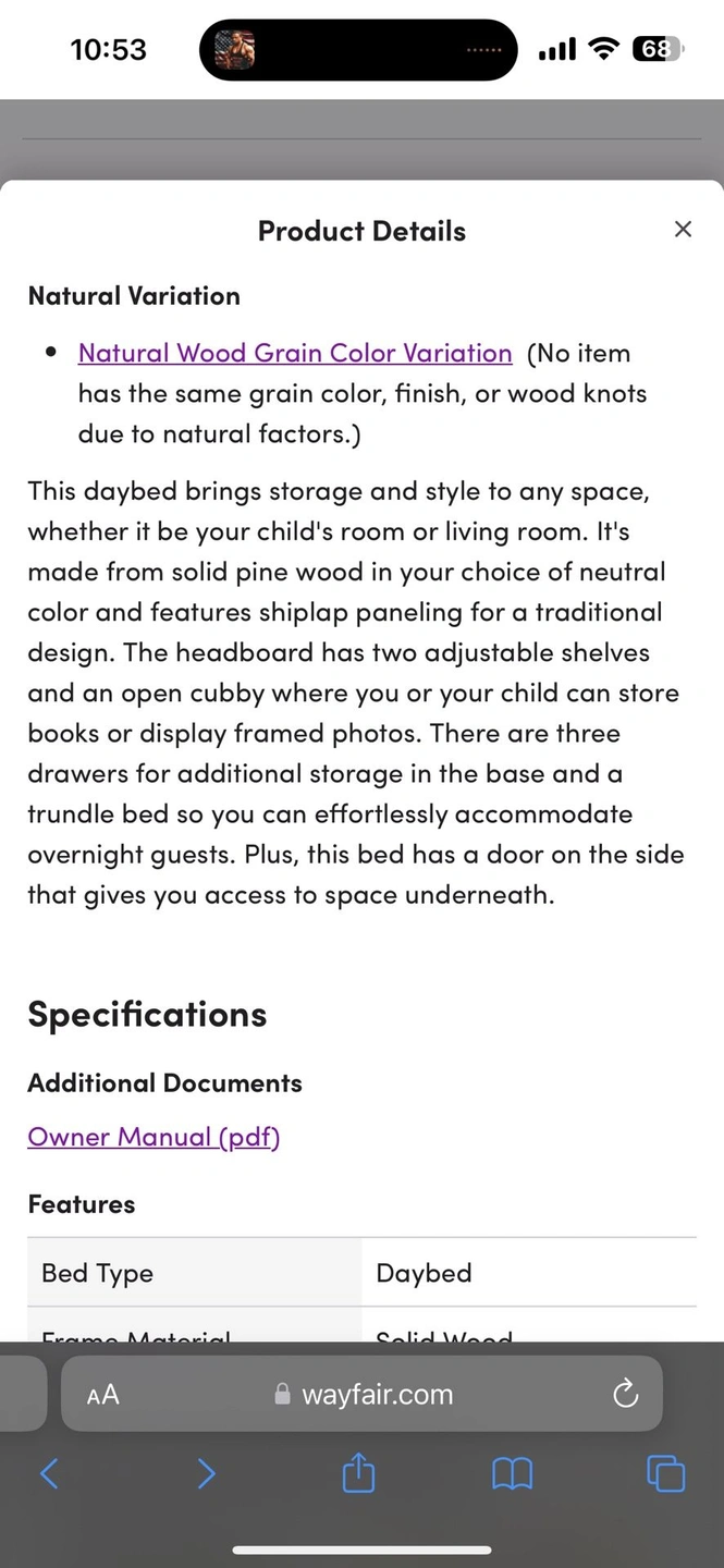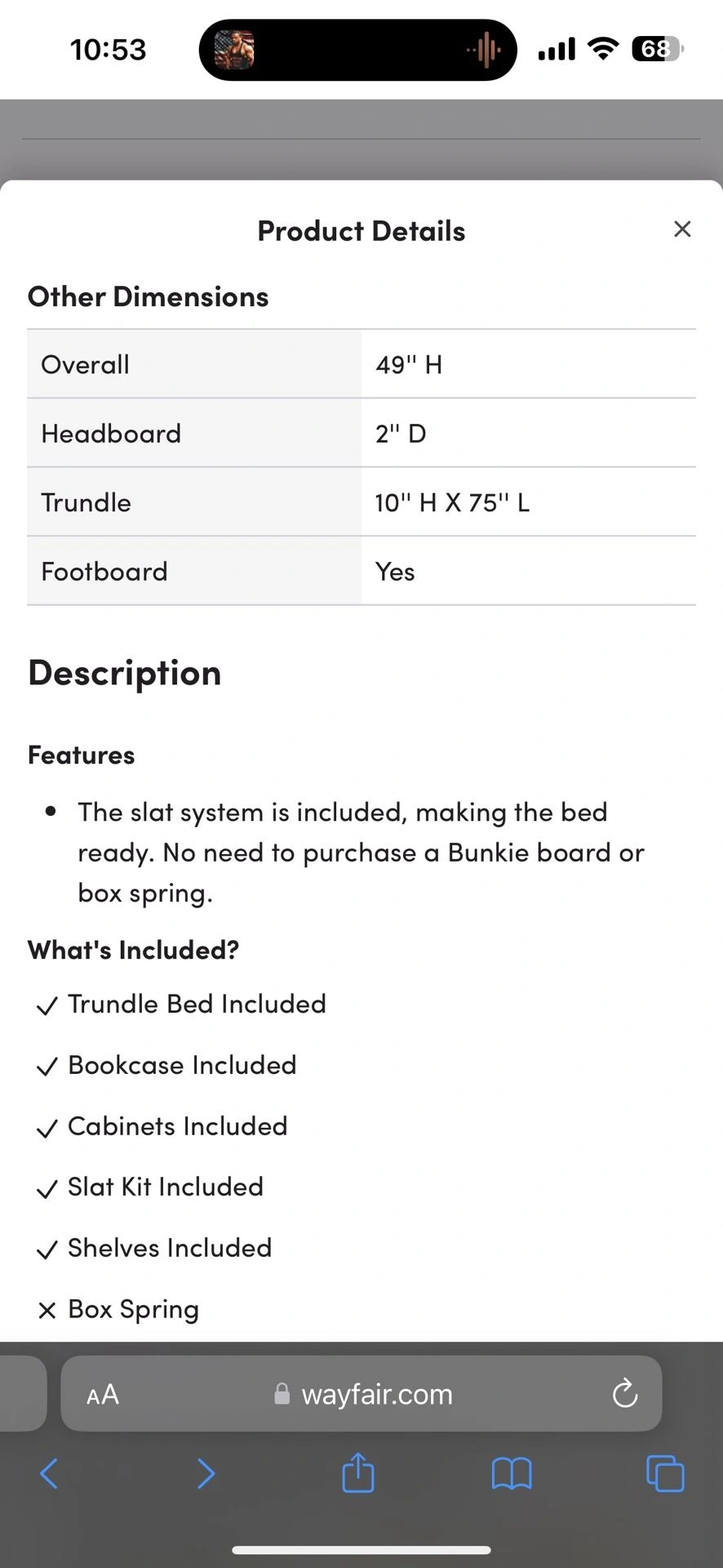 Stylish and functional daybed, perfect for kids, teens, or guest rooms! Features a pull-out trundle bed, built-in bookcase, and 3 spacious storage drawers. Solid wood, sturdy, and in immaculate condition. Originally purchased from Wayfair. Only selling because we’re moving. Bed will need to be disassembled for moving. Separately purchased a Wayfair Sleep™ 10” Medium Memory Foam Mattress (Full size) – clean, well-kept, and very comfortable you can have for $120
